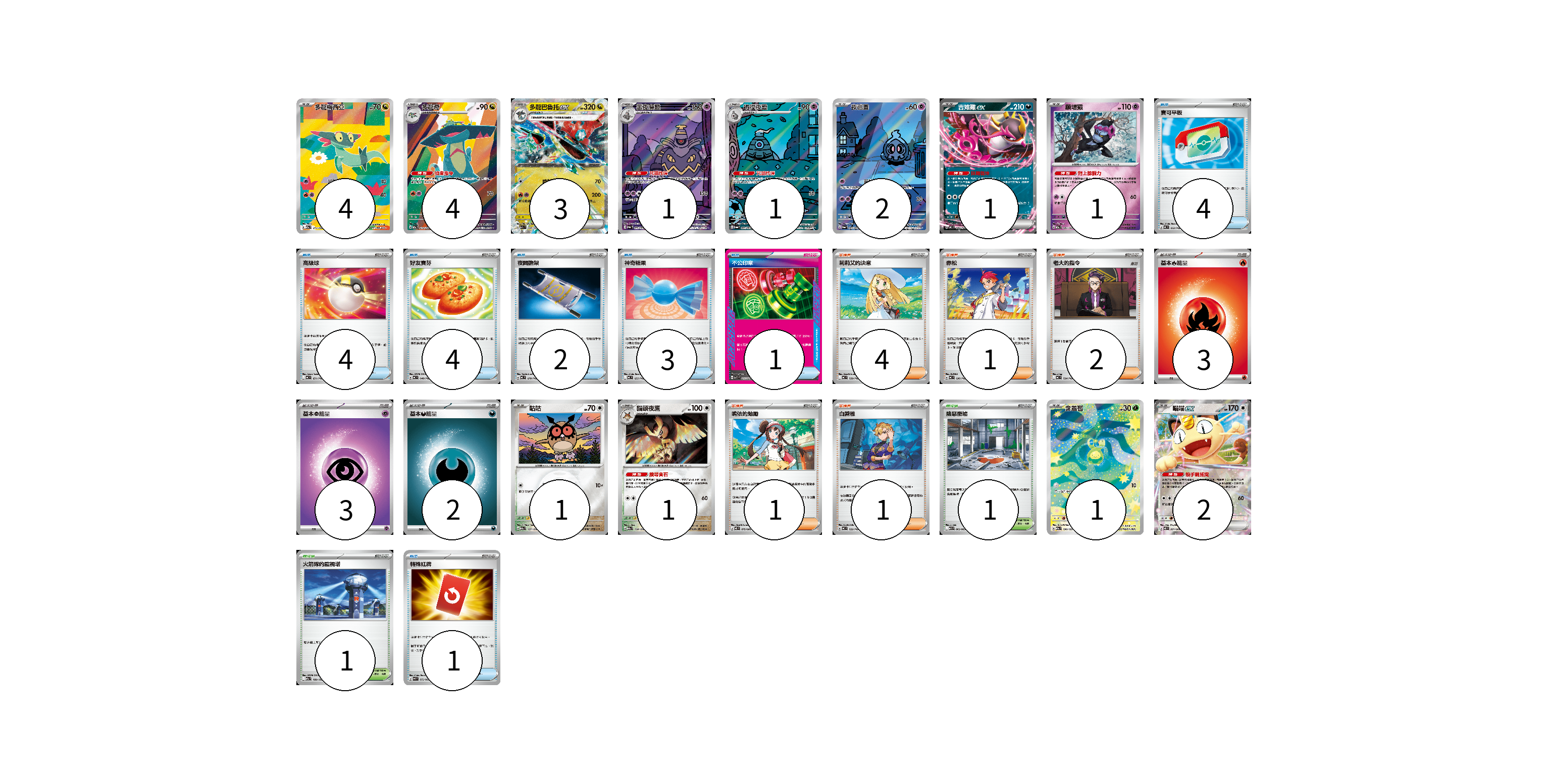 牌組構築方案 以此牌組為基礎新構築牌組 顯示卡面 顯示列表 寶可夢卡(22) 4 4 3 1 1 2 1 1 1 1 1 2 物品卡(19) 4 4 4 2 3 1 1 支援者卡(9) 4 1 2 1 1 競技場卡(2) 1 1 能量卡(8) 3 3 2 寶可夢卡(22) 卡牌名稱 張數 卡牌名稱 張數 多龍梅西亞 M2a 211/193 04 多龍奇 M2a 212/193 04 多龍巴魯托ex M2a 134/193 03 黑夜魔靈 SV6a 070/064 01 彷徨夜靈 SV6a 069/064 01 夜巡靈 SV6a 068/064 02 吉雉雞ex MC 489/742 01 願增猿 M2a 081/193 01 咕咕 M2a 137/193 01 貓頭夜鷹 M2a 138/193 01 含羞苞 M2a 196/193 01 喵喵ex M3 061/080 02 物品卡(19) 卡牌名稱 張數 卡牌名稱 張數 寶可平板 MC 662/742 04 高級球 MC 651/742 04 好友寶芬 MC 648/742 04 夜間擔架 MC 670/742 02 神奇糖果 MC 655/742 03 不公印章 MBD 011/022 01 特殊紅牌 M4 072/083 01 支援者卡(9) 卡牌名稱 張數 卡牌名稱 張數 莉莉艾的決意 MC 729/742 04 赤松 MC 696/742 01 老大的指令 MC 724/742 02 鳴依的勉勵 M3 075/080 01 白蕾雅 MC 722/742 01 競技場卡(2) 卡牌名稱 張數 卡牌名稱 張數 險惡廢墟 M1L 063/063 01 火箭隊的監視塔 M2a 189/193 01 能量卡(8) 卡牌名稱 張數 卡牌名稱 張數 基本【火】能量 MC FIR 03 基本【超】能量 MC PSY 03 基本【惡】能量 MC DAR 02 以此牌組為基礎新構築牌組 牌組編碼 XRYzOp-hHQUAL-IcXnRy copy 列印牌組單 牌組編碼已複製 分享至SNS
