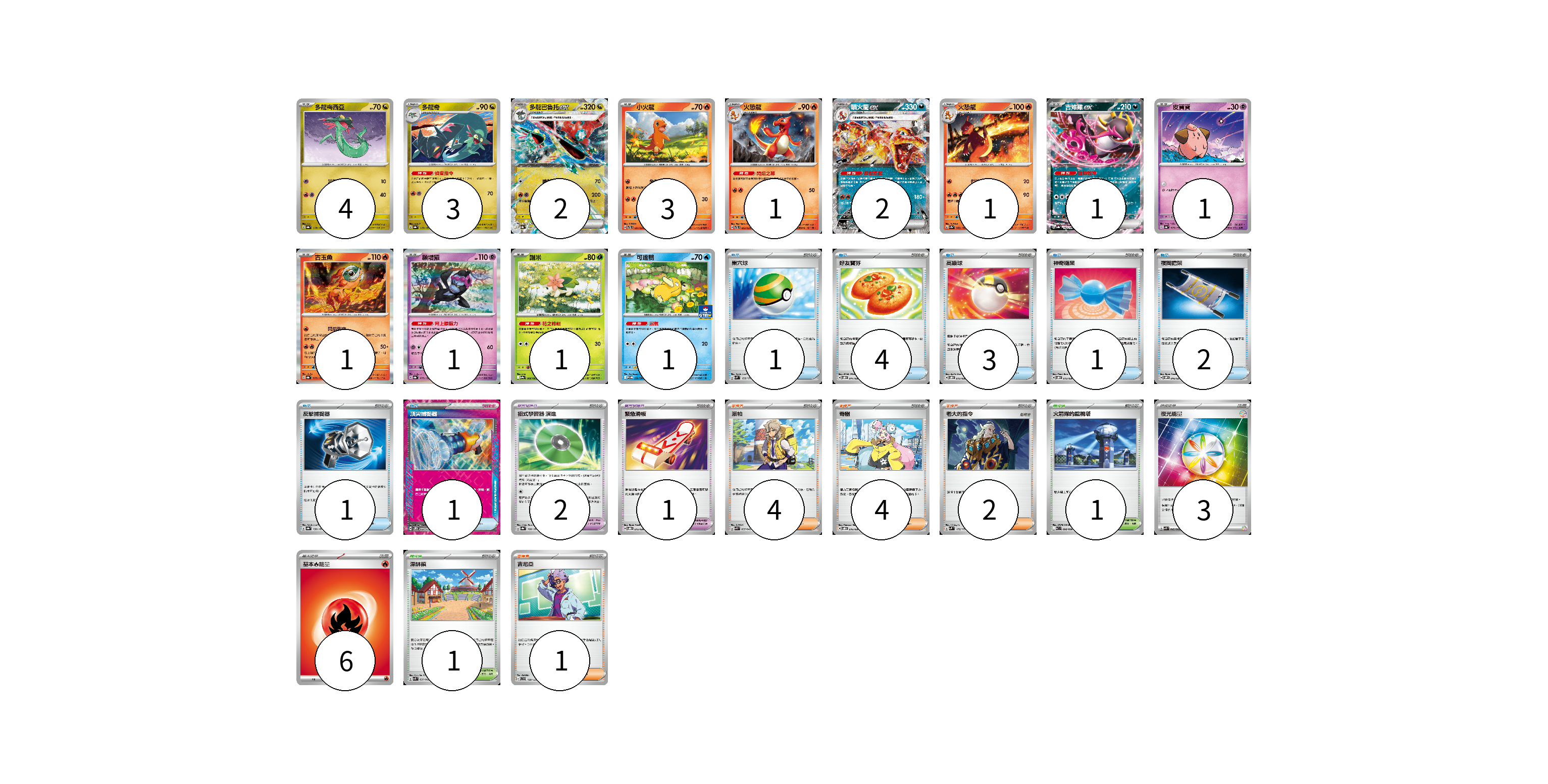 牌組構築方案 以此牌組為基礎新構築牌組 顯示卡面 顯示列表 寶可夢卡(22) 4 3 2 3 1 2 1 1 1 1 1 1 1 寶可夢道具(3) 2 1 物品卡(13) 1 4 3 1 2 1 1 支援者卡(11) 4 4 2 1 競技場卡(2) 1 1 能量卡(9) 3 6 寶可夢卡(22) 卡牌名稱 張數 卡牌名稱 張數 多龍梅西亞 SV8a 118/187 04 多龍奇 SV8a 119/187 03 多龍巴魯托ex SV8a 120/187 02 小火龍 SVTL 001/021 03 火恐龍 SVTL 002/021 01 噴火龍ex SV4a 115/190 02 火恐龍 SV2a 005/165 01 吉雉雞ex SV8a 104/187 01 皮寶寶 SV4a 077/190 01 古玉魚 SV8a 025/187 01 願增猿 SV8a 075/187 01 謝米 SV9a 006/063 01 可達鴨 SV-P 220/SV-P 01 寶可夢道具(3) 卡牌名稱 張數 卡牌名稱 張數 招式學習器 演進 SV8a 160/187 02 緊急滑板 SVOD 015/020 01 物品卡(13) 卡牌名稱 張數 卡牌名稱 張數 巢穴球 SVM 133/175 01 好友寶芬 SVOD 011/020 04 高級球 SVOD 012/020 03 神奇糖果 SVOD 013/020 01 夜間擔架 SVOM 016/021 02 反擊捕捉器 SV8a 139/187 01 頂尖捕捉器 SV5M 062/071 01 支援者卡(11) 卡牌名稱 張數 卡牌名稱 張數 派帕 SVK 035/042 04 奇樹 SVOD 016/020 04 老大的指令 SVM 172/175 02 吉尼亞 SVD 129/139 01 競技場卡(2) 卡牌名稱 張數 卡牌名稱 張數 火箭隊的監視塔 SV10 096/098 01 深缽鎮 SVK 039/042 01 能量卡(9) 卡牌名稱 張數 卡牌名稱 張數 夜光能量 SVK 042/042 03 基本【火】能量 SVTL FIR 06 以此牌組為基礎新構築牌組 牌組編碼 XSFfwJ-kyJKtW-gZeNZX copy 列印牌組單 牌組編碼已複製 分享至SNS