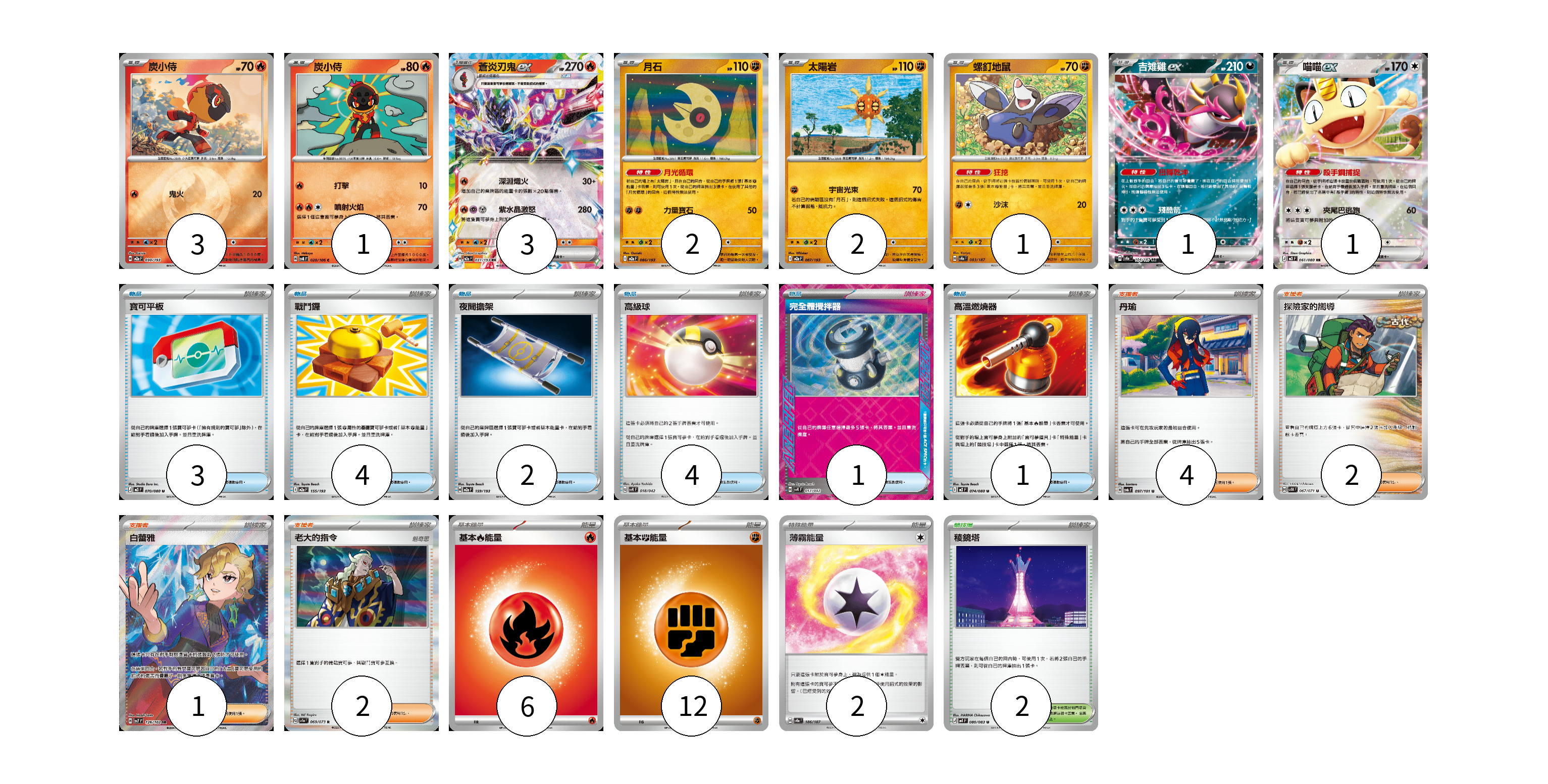 牌組構築方案 以此牌組為基礎新構築牌組 顯示卡面 顯示列表 寶可夢卡(14) 3 1 3 2 2 1 1 1 物品卡(15) 3 4 2 4 1 1 支援者卡(9) 4 2 1 2 競技場卡(2) 2 能量卡(20) 6 12 2 寶可夢卡(14) 卡牌名稱 張數 卡牌名稱 張數 炭小侍 M2a 030/193 03 炭小侍 SV8 020/106 01 蒼炎刃鬼ex M2a 031/193 03 月石 M2a 086/193 02 太陽岩 M2a 087/193 02 螺釘地鼠 SV8a 083/187 01 吉雉雞ex SV8a 104/187 01 喵喵ex M3 061/080 01 物品卡(15) 卡牌名稱 張數 卡牌名稱 張數 寶可平板 M3 070/080 03 戰鬥鑼 M2a 155/193 04 夜間擔架 M2a 159/193 02 高級球 SVK 018/042 04 完全體攪拌器 SVK 017/042 01 高溫燃燒器 M2 074/080 01 支援者卡(9) 卡牌名稱 張數 卡牌名稱 張數 丹瑜 SV6 097/101 04 探險家的嚮導 SV5K 067/071 02 白蕾雅 SV7 126/102 01 老大的指令 SV1a 069/073 02 競技場卡(2) 卡牌名稱 張數 卡牌名稱 張數 稜鏡塔 M4 080/083 02 能量卡(20) 卡牌名稱 張數 卡牌名稱 張數 基本【火】能量 M-P FIR 06 基本【鬥】能量 M-P FIG 12 薄霧能量 SV8a 186/187 02 以此牌組為基礎新構築牌組 牌組編碼 XSyttX-iNrroZ-DZfdkj copy 列印牌組單 牌組編碼已複製 分享至SNS