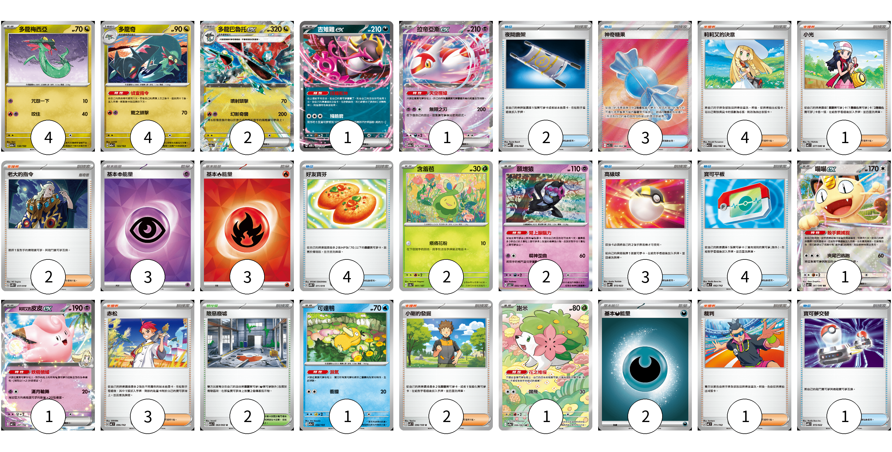 牌組構築方案 以此牌組為基礎新構築牌組 顯示卡面 顯示列表 寶可夢卡(20) 4 4 2 1 1 2 2 1 1 1 1 物品卡(17) 2 3 4 3 4 1 支援者卡(13) 4 1 2 3 2 1 競技場卡(2) 2 能量卡(8) 3 3 2 寶可夢卡(20) 卡牌名稱 張數 卡牌名稱 張數 多龍梅西亞 M2a 132/193 04 多龍奇 M2a 133/193 04 多龍巴魯托ex M2a 134/193 02 吉雉雞ex SVOD 004/020 01 拉帝亞斯ex M2a 075/193 01 含羞苞 SV8a 001/187 02 願增猿 SV6 055/101 02 喵喵ex M3 061/080 01 莉莉艾的皮皮ex MC 287/742 01 可達鴨 M2a 032/193 01 謝米 SV9a 066/063 01 物品卡(17) 卡牌名稱 張數 卡牌名稱 張數 夜間擔架 MBD 016/022 02 神奇糖果 M1S 082/063 03 好友寶芬 SVTG 011/019 04 高級球 SVQP 015/023 03 寶可平板 MC 662/742 04 寶可夢交替 MBG 015/022 01 支援者卡(13) 卡牌名稱 張數 卡牌名稱 張數 莉莉艾的決意 M1L 062/063 04 小光 M2 077/080 01 老大的指令 SVTH 017/018 02 赤松 MC 696/742 03 小剛的發掘 SV9 096/100 02 裁判 MC 711/742 01 競技場卡(2) 卡牌名稱 張數 卡牌名稱 張數 險惡廢墟 M1L 063/063 02 能量卡(8) 卡牌名稱 張數 卡牌名稱 張數 基本【超】能量 SVM PSY 03 基本【火】能量 SVK FIR 03 基本【惡】能量 MC DAR 02 以此牌組為基礎新構築牌組 牌組編碼 XTuuam-UkEFAL-SKJSFx copy 列印牌組單 牌組編碼已複製 分享至SNS