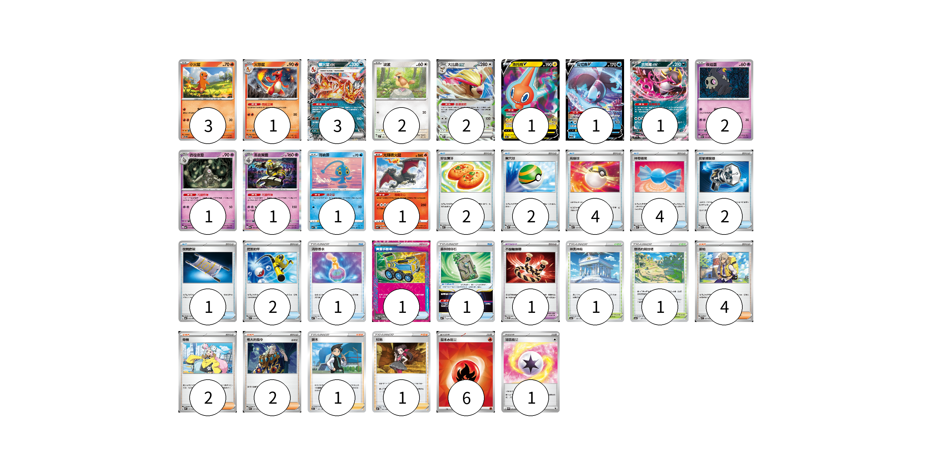 牌組構築方案 以此牌組為基礎新構築牌組 顯示卡面 顯示列表 寶可夢卡(20) 3 1 3 2 2 1 1 1 2 1 1 1 1 寶可夢道具(1) 1 物品卡(20) 2 2 4 4 2 1 2 1 1 1 支援者卡(10) 4 2 2 1 1 競技場卡(2) 1 1 能量卡(7) 6 1 寶可夢卡(20) 卡牌名稱 張數 卡牌名稱 張數 小火龍 SVTL 001/021 03 火恐龍 SVTL 002/021 01 噴火龍ex SVTL 006/021 03 波波 SV3 087/108 02 大比鳥ex SVK 005/042 02 洛托姆V S11 037/100 01 霓虹魚V SVHK 004/022 01 吉雉雞ex SV6a 038/064 01 夜巡靈 SV6a 018/064 02 彷徨夜靈 SV6a 019/064 01 黑夜魔靈 SV6a 020/064 01 瑪納霏 SVF 003/038 01 光輝噴火龍 SVTL 003/021 01 寶可夢道具(1) 卡牌名稱 張數 卡牌名稱 張數 不服輸頭帶 SVTL 016/021 01 物品卡(20) 卡牌名稱 張數 卡牌名稱 張數 好友寶芬 SVK 015/042 02 巢穴球 SVK 016/042 02 高級球 SVK 018/042 04 神奇糖果 SVK 019/042 04 反擊捕捉器 SVK 009/042 02 夜間擔架 SV6a 056/064 01 厲害釣竿 SVK 011/042 02 消除香水 SVF 011/038 01 貴重手推車 SVK 020/042 01 森林封印石 SVF 024/038 01 支援者卡(10) 卡牌名稱 張數 卡牌名稱 張數 派帕 SVK 035/042 04 奇樹 SVK 031/042 02 老大的指令 SVK 036/042 02 捩木 S11 097/100 01 杜娟 SVB 021/028 01 競技場卡(2) 卡牌名稱 張數 卡牌名稱 張數 神奧神殿 S12a 169/172 01 崩塌的競技場 S12a 167/172 01 能量卡(7) 卡牌名稱 張數 卡牌名稱 張數 基本【火】能量 SVK FIR 06 薄霧能量 SV5M 071/071 01 以此牌組為基礎新構築牌組 牌組編碼 XUFXaq-yTmDTe-bDMRYX copy 列印牌組單 牌組編碼已複製 分享至SNS