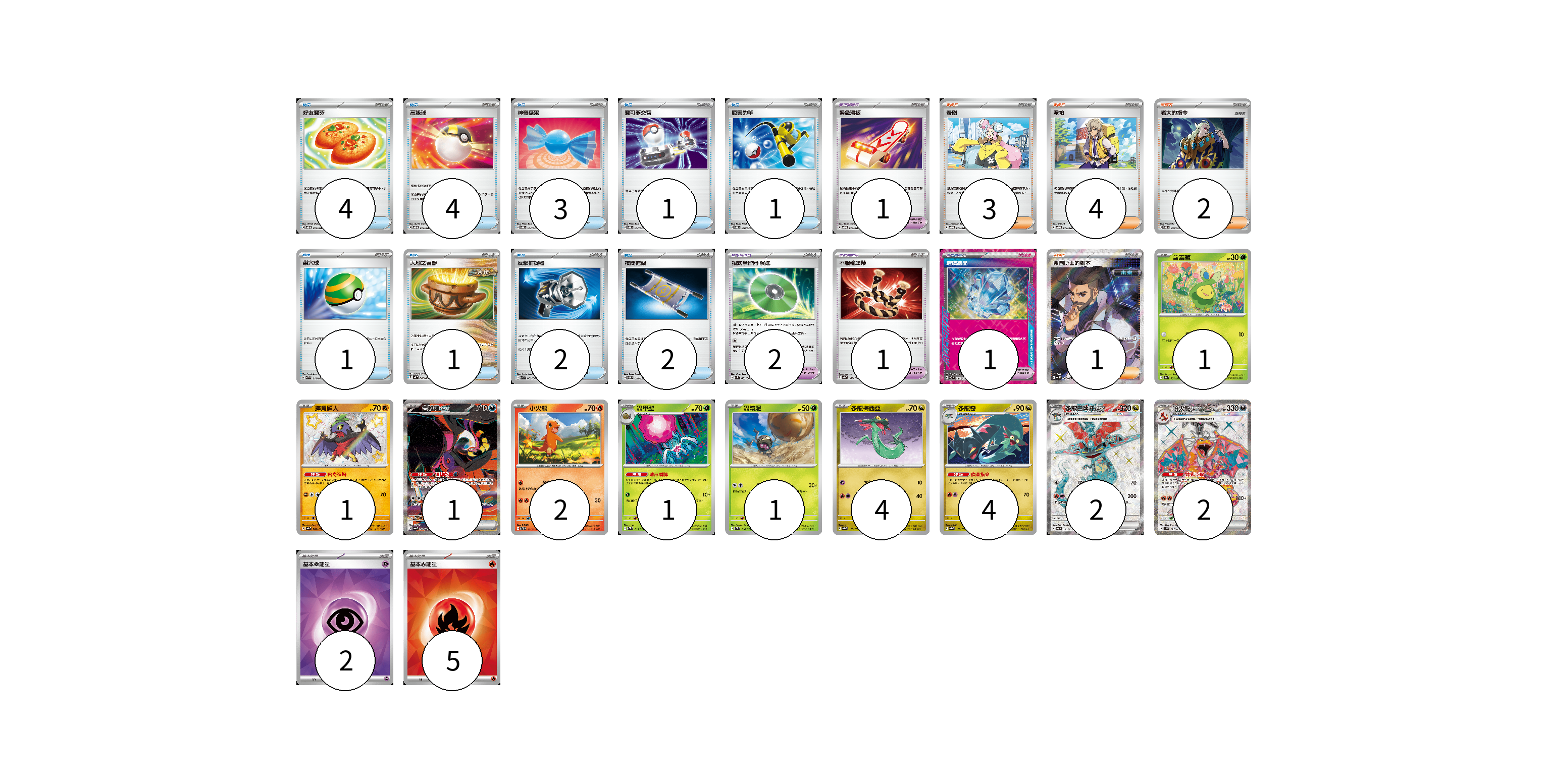 牌組構築方案 以此牌組為基礎新構築牌組 顯示卡面 顯示列表 寶可夢卡(19) 1 1 1 2 1 1 4 4 2 2 寶可夢道具(5) 1 2 1 1 物品卡(19) 4 4 3 1 1 1 1 2 2 支援者卡(10) 3 4 2 1 能量卡(7) 2 5 寶可夢卡(19) 卡牌名稱 張數 卡牌名稱 張數 含羞苞 SV8a 001/187 01 摔角鷹人 SV4a 282/190 01 吉雉雞ex SV6a 089/064 01 小火龍 SVTL 001/021 02 蟲甲聖 SV5M 015/071 01 蟲滾泥 SV2P 014/071 01 多龍梅西亞 SV8a 118/187 04 多龍奇 SV8a 119/187 04 多龍巴魯托ex SV6 120/101 02 噴火龍ex SV3 125/108 02 寶可夢道具(5) 卡牌名稱 張數 卡牌名稱 張數 緊急滑板 SVOD 015/020 01 招式學習器 演進 SV4M 063/066 02 不服輸頭帶 SV4a 168/190 01 璀璨結晶 SV7 094/102 01 物品卡(19) 卡牌名稱 張數 卡牌名稱 張數 好友寶芬 SVOD 011/020 04 高級球 SVOD 012/020 04 神奇糖果 SVOD 013/020 03 寶可夢交替 SVOD 014/020 01 厲害釣竿 SVOD 010/020 01 巢穴球 SVAW 014/023 01 大地之容器 SV4K 060/066 01 反擊捕捉器 SVK 009/042 02 夜間擔架 SVOM 016/021 02 支援者卡(10) 卡牌名稱 張數 卡牌名稱 張數 奇樹 SVOD 016/020 03 派帕 SVOD 018/020 04 老大的指令 SVOD 019/020 02 弗圖博士的劇本 SV4M 086/066 01 能量卡(7) 卡牌名稱 張數 卡牌名稱 張數 基本【超】能量 SVOD PSY 02 基本【火】能量 SVK FIR 05 以此牌組為基礎新構築牌組 牌組編碼 XVfxcy-lXemIm-LCYEUU copy 列印牌組單 牌組編碼已複製 分享至SNS