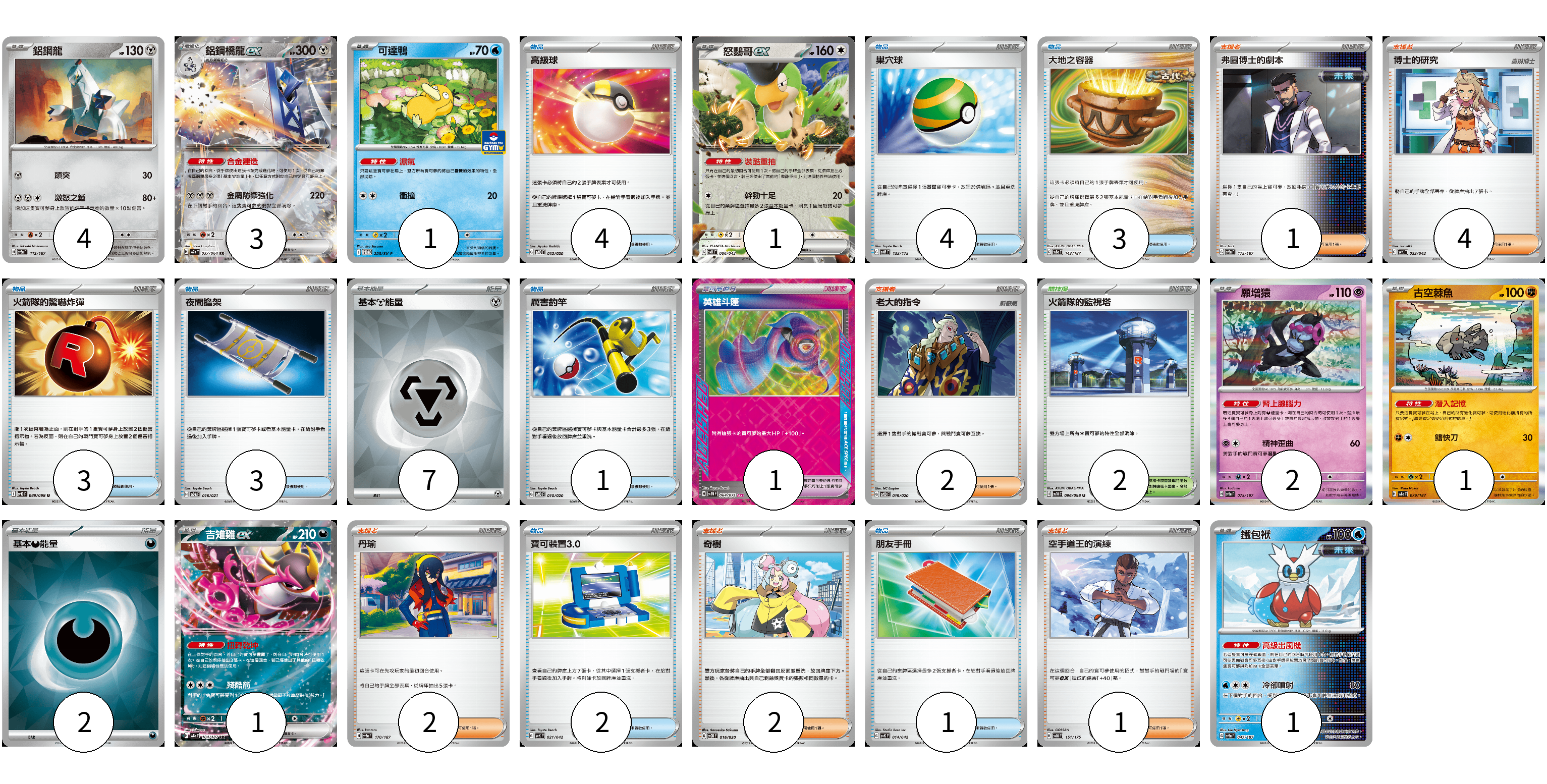 牌組構築方案 以此牌組為基礎新構築牌組 顯示卡面 顯示列表 寶可夢卡(14) 4 3 1 1 2 1 1 1 寶可夢道具(1) 1 物品卡(21) 4 4 3 3 3 1 2 1 支援者卡(12) 1 4 2 2 2 1 競技場卡(2) 2 能量卡(9) 7 2 寶可夢卡(14) 卡牌名稱 張數 卡牌名稱 張數 鋁鋼龍 SV8a 112/187 04 鋁鋼橋龍ex SV7a 037/064 03 可達鴨 SV-P 220/SV-P 01 怒鸚哥ex SVK 006/042 01 願增猿 SV8a 075/187 02 古空棘魚 SV8a 079/187 01 吉雉雞ex SV8a 104/187 01 鐵包袱 SV8a 047/187 01 寶可夢道具(1) 卡牌名稱 張數 卡牌名稱 張數 英雄斗篷 SV5M 064/071 01 物品卡(21) 卡牌名稱 張數 卡牌名稱 張數 高級球 SVOD 012/020 04 巢穴球 SVM 133/175 04 大地之容器 SV8a 143/187 03 火箭隊的驚嚇炸彈 SV10 089/098 03 夜間擔架 SVOM 016/021 03 厲害釣竿 SVOD 010/020 01 寶可裝置3.0 SVK 021/042 02 朋友手冊 SVK 014/042 01 支援者卡(12) 卡牌名稱 張數 卡牌名稱 張數 弗圖博士的劇本 SV8a 175/187 01 博士的研究 SVK 032/042 04 老大的指令 SVOD 019/020 02 丹瑜 SV8a 170/187 02 奇樹 SVOD 016/020 02 空手道王的演練 SVM 151/175 01 競技場卡(2) 卡牌名稱 張數 卡牌名稱 張數 火箭隊的監視塔 SV10 096/098 02 能量卡(9) 卡牌名稱 張數 卡牌名稱 張數 基本【鋼】能量 SVOD MET 07 基本【惡】能量 SVOM DAR 02 以此牌組為基礎新構築牌組 牌組編碼 XWZocW-gIEBjP-rDuIAv copy 列印牌組單 牌組編碼已複製 分享至SNS