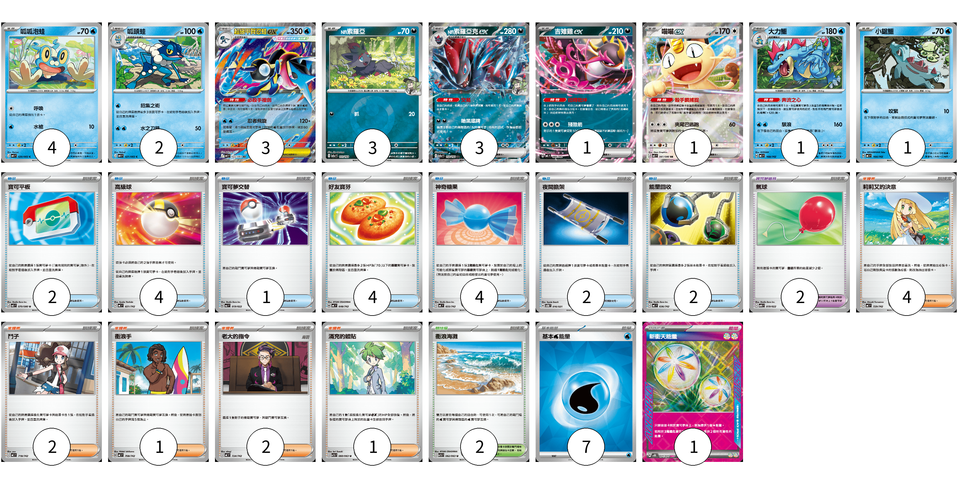 牌組構築方案 以此牌組為基礎新構築牌組 顯示卡面 顯示列表 寶可夢卡(19) 4 2 3 3 3 1 1 1 1 寶可夢道具(2) 2 物品卡(19) 2 4 1 4 4 2 2 支援者卡(10) 4 2 1 2 1 競技場卡(2) 2 能量卡(8) 7 1 寶可夢卡(19) 卡牌名稱 張數 卡牌名稱 張數 呱呱泡蛙 M4 020/083 04 呱頭蛙 M4 021/083 02 超級甲賀忍蛙ex M4 022/083 03 N的索羅亞 M2a 111/193 03 N的索羅亞克ex M2a 112/193 03 吉雉雞ex MC 489/742 01 喵喵ex M3 061/080 01 大力鱷 MC 168/742 01 小鋸鱷 MC 164/742 01 寶可夢道具(2) 卡牌名稱 張數 卡牌名稱 張數 氣球 MBG 019/022 02 物品卡(19) 卡牌名稱 張數 卡牌名稱 張數 寶可平板 M3 070/080 02 高級球 MC 651/742 04 寶可夢交替 MJ 019/022 01 好友寶芬 MC 648/742 04 神奇糖果 MC 655/742 04 夜間擔架 SVOM 016/021 02 能量回收 MC 636/742 02 支援者卡(10) 卡牌名稱 張數 卡牌名稱 張數 莉莉艾的決意 MC 729/742 04 鬥子 MC 718/742 02 衝浪手 MC 708/742 01 老大的指令 MC 724/742 02 滿充的體貼 M1S 060/063 01 競技場卡(2) 卡牌名稱 張數 卡牌名稱 張數 衝浪海灘 M1S 062/063 02 能量卡(8) 卡牌名稱 張數 卡牌名稱 張數 基本【水】能量 SVM WAT 07 新衝天能量 SV5K 071/071 01 以此牌組為基礎新構築牌組 牌組編碼 XYAUgR-kakFjt-DnsxbI copy 列印牌組單 牌組編碼已複製 分享至SNS