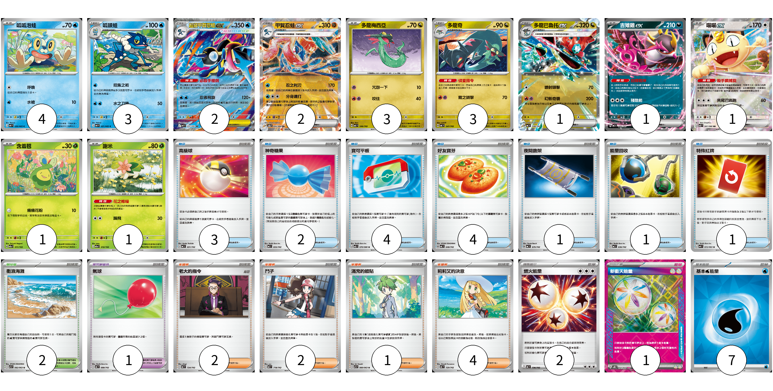 牌組構築方案 以此牌組為基礎新構築牌組 顯示卡面 顯示列表 寶可夢卡(22) 4 3 2 2 3 3 1 1 1 1 1 寶可夢道具(1) 1 物品卡(16) 3 2 4 4 1 1 1 支援者卡(9) 2 2 1 4 競技場卡(2) 2 能量卡(10) 2 1 7 寶可夢卡(22) 卡牌名稱 張數 卡牌名稱 張數 呱呱泡蛙 M4 020/083 04 呱頭蛙 M4 021/083 03 超級甲賀忍蛙ex M4 022/083 02 甲賀忍蛙ex SV5a 045/066 02 多龍梅西亞 MC 546/742 03 多龍奇 MC 547/742 03 多龍巴魯托ex MC 548/742 01 吉雉雞ex MC 489/742 01 喵喵ex M3 061/080 01 含羞苞 M2a 011/193 01 謝米 M2a 012/193 01 寶可夢道具(1) 卡牌名稱 張數 卡牌名稱 張數 氣球 MC 688/742 01 物品卡(16) 卡牌名稱 張數 卡牌名稱 張數 高級球 MC 651/742 03 神奇糖果 MC 655/742 02 寶可平板 M3 070/080 04 好友寶芬 MC 648/742 04 夜間擔架 MC 670/742 01 能量回收 MC 636/742 01 特殊紅牌 M4 072/083 01 支援者卡(9) 卡牌名稱 張數 卡牌名稱 張數 老大的指令 MC 724/742 02 鬥子 MC 718/742 02 滿充的體貼 M1S 060/063 01 莉莉艾的決意 MC 729/742 04 競技場卡(2) 卡牌名稱 張數 卡牌名稱 張數 衝浪海灘 M1S 062/063 02 能量卡(10) 卡牌名稱 張數 卡牌名稱 張數 燃火能量 MC 736/742 02 新衝天能量 SV5K 071/071 01 基本【水】能量 SVM WAT 07 以此牌組為基礎新構築牌組 牌組編碼 XYOqYi-mNblCo-DLaejm copy 列印牌組單 牌組編碼已複製 分享至SNS