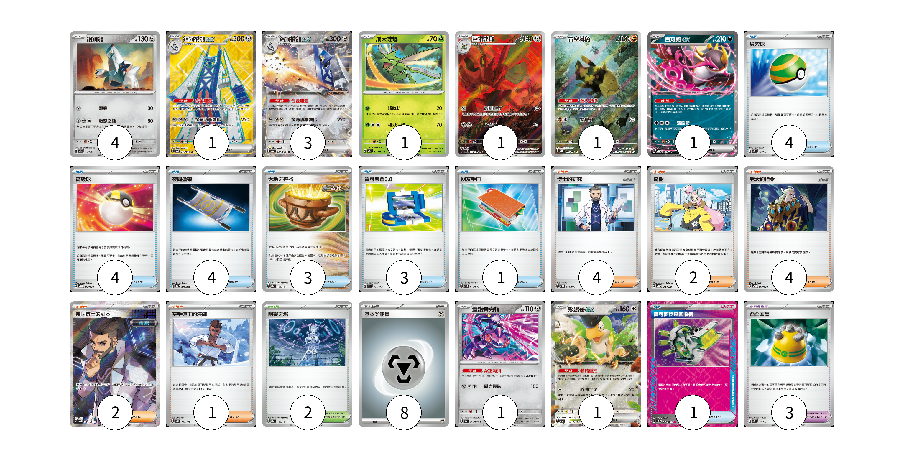 牌組構築方案 以此牌組為基礎新構築牌組 顯示卡面 顯示列表 寶可夢卡(14) 4 1 3 1 1 1 1 1 1 寶可夢道具(3) 3 物品卡(20) 4 4 4 3 3 1 1 支援者卡(13) 4 2 4 2 1 競技場卡(2) 2 能量卡(8) 8 寶可夢卡(14) 卡牌名稱 張數 卡牌名稱 張數 鋁鋼龍 SV8a 112/187 04 鋁鋼橋龍ex SV7a 080/064 01 鋁鋼橋龍ex SV7a 037/064 03 飛天螳螂 SV2a 123/165 01 巨鉗螳螂 SV3 116/108 01 古空棘魚 SV5K 077/071 01 吉雉雞ex SVOD 004/020 01 蓋諾賽克特 SV6a 040/064 01 怒鸚哥ex SV4a 154/190 01 寶可夢道具(3) 卡牌名稱 張數 卡牌名稱 張數 凸凸頭盔 SVM 141/175 03 物品卡(20) 卡牌名稱 張數 卡牌名稱 張數 巢穴球 SVM 133/175 04 高級球 SVOD 012/020 04 夜間擔架 SVOM 016/021 04 大地之容器 SV8a 143/187 03 寶可裝置3.0 SVK 021/042 03 朋友手冊 SVK 014/042 01 寶可夢旋風回收機 SV6 093/101 01 支援者卡(13) 卡牌名稱 張數 卡牌名稱 張數 博士的研究 SVK 033/042 04 奇樹 SVOD 016/020 02 老大的指令 SVOD 019/020 04 弗圖博士的劇本 SV4M 086/066 02 空手道王的演練 SVM 151/175 01 競技場卡(2) 卡牌名稱 張數 卡牌名稱 張數 阻礙之塔 SV8a 181/187 02 能量卡(8) 卡牌名稱 張數 卡牌名稱 張數 基本鋼能量 sv-p MET 08 以此牌組為基礎新構築牌組 牌組編碼 XYXUdh-ALOGqc-JrOKJQ copy 列印牌組單 牌組編碼已複製 分享至SNS