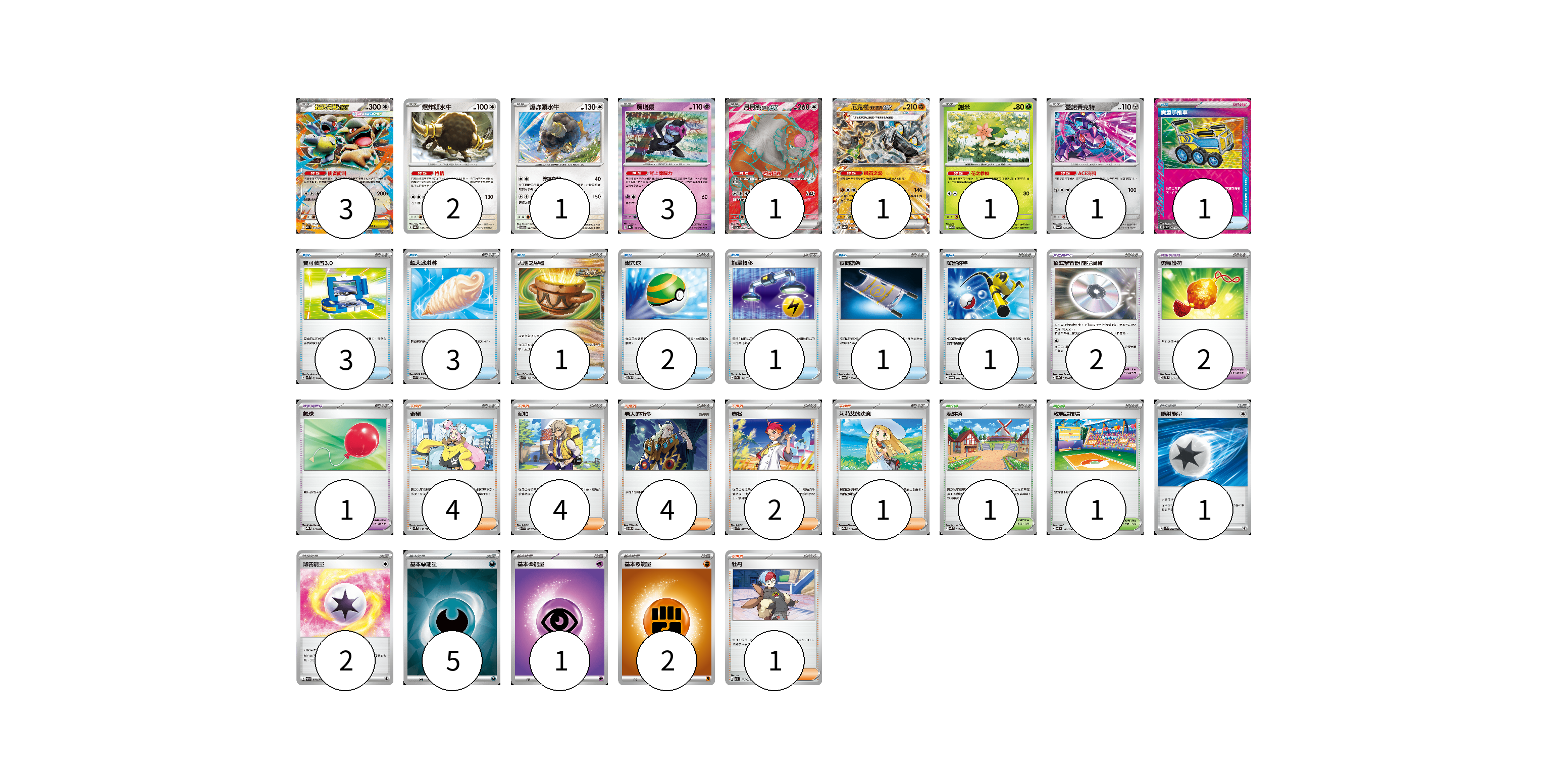 牌組構築方案 以此牌組為基礎新構築牌組 顯示卡面 顯示列表 寶可夢卡(13) 3 2 1 3 1 1 1 1 寶可夢道具(5) 2 2 1 物品卡(13) 1 3 3 1 2 1 1 1 支援者卡(16) 4 4 4 2 1 1 競技場卡(2) 1 1 能量卡(11) 1 2 5 1 2 寶可夢卡(13) 卡牌名稱 張數 卡牌名稱 張數 超級袋獸ex M1S 051/063 03 爆炸頭水牛 SV8a 133/187 02 爆炸頭水牛 SV8 087/106 01 願增猿 SV8a 075/187 03 月月熊 赫月 ex SV5a 084/066 01 厄鬼椪 礎石面具ex SV8a 091/187 01 謝米 SV9a 006/063 01 蓋諾賽克特 SV6a 040/064 01 寶可夢道具(5) 卡牌名稱 張數 卡牌名稱 張數 招式學習器 能量渦輪 SV3a 056/062 02 勇氣護符 SVTS 017/022 02 氣球 MBG 019/022 01 物品卡(13) 卡牌名稱 張數 卡牌名稱 張數 貴重手推車 SVK 020/042 01 寶可裝置3.0 SVK 021/042 03 超大冰淇淋 M2 073/080 03 大地之容器 SVK 012/042 01 巢穴球 SVTH 010/018 02 能量轉移 SVAM 012/023 01 夜間擔架 SV6a 056/064 01 厲害釣竿 SVOM 011/021 01 支援者卡(16) 卡牌名稱 張數 卡牌名稱 張數 奇樹 SVM 160/175 04 派帕 SVK 035/042 04 老大的指令 SVOM 020/021 04 赤松 SVK 027/042 02 莉莉艾的決意 MBG 022/022 01 牡丹 SV1S 077/078 01 競技場卡(2) 卡牌名稱 張數 卡牌名稱 張數 深缽鎮 SVK 039/042 01 激動競技場 SV8 105/106 01 能量卡(11) 卡牌名稱 張數 卡牌名稱 張數 噴射能量 SVK 040/042 01 薄霧能量 SV5M 071/071 02 基本【惡】能量 SVOM DAR 05 基本【超】能量 MBD PSY 01 基本【鬥】能量 M-P FIG 02 以此牌組為基礎新構築牌組 牌組編碼 XZtKCU-Nqgrqi-gDbqdi copy 列印牌組單 牌組編碼已複製 分享至SNS