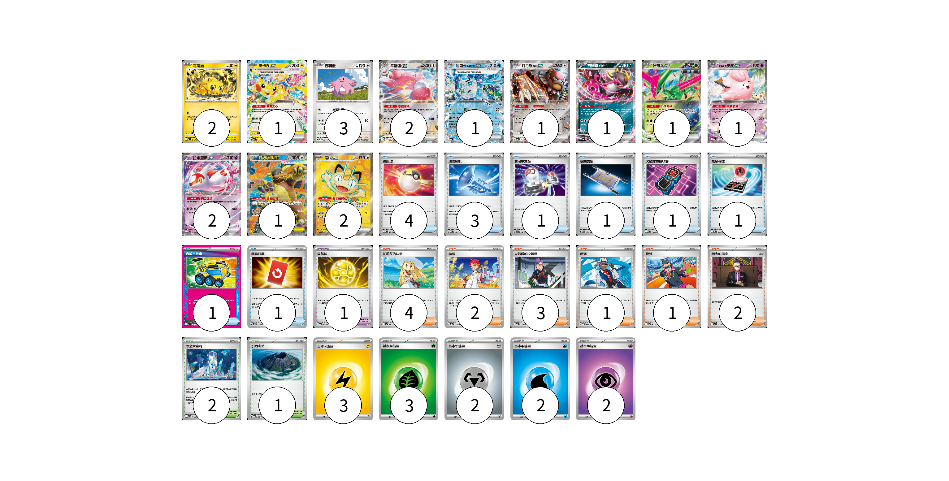 牌組構築方案 以此牌組為基礎新構築牌組 顯示卡面 顯示列表 寶可夢卡(18) 2 1 3 2 1 1 1 1 1 2 1 2 寶可夢道具(1) 1 物品卡(13) 4 3 1 1 1 1 1 1 支援者卡(13) 4 2 3 1 1 2 競技場卡(3) 2 1 能量卡(12) 3 3 2 2 2 寶可夢卡(18) 卡牌名稱 張數 卡牌名稱 張數 電電蟲 MC 254/742 02 皮卡丘ex M2a 044/193 01 吉利蛋 SV6 084/101 03 幸福蛋ex SV6 085/101 02 厄鬼椪 水井面具ex SV8a 050/187 01 月月熊 赫月ex SV8a 134/187 01 吉雉雞ex SV8a 104/187 01 鐵斑葉ex SV8a 016/187 01 莉莉艾的皮皮ex M2a 060/193 01 拉帝亞斯ex M2a 075/193 02 超級袋獸ex M1S 080/063 01 喵喵ex M3 100/080 02 寶可夢道具(1) 卡牌名稱 張數 卡牌名稱 張數 電氣球 M2a 163/193 01 物品卡(13) 卡牌名稱 張數 卡牌名稱 張數 高級球 MC 651/742 04 玻璃喇叭 M2a 149/193 03 寶可夢交替 MJ 019/022 01 夜間擔架 M2a 159/193 01 火箭隊的接收器 M2a 160/193 01 能量輸送 MC 639/742 01 貴重手推車 MC 658/742 01 特殊紅牌 M4 072/083 01 支援者卡(13) 卡牌名稱 張數 卡牌名稱 張數 莉莉艾的決意 M2a 175/193 04 赤松 SV8a 163/187 02 火箭隊的拉姆達 M2a 179/193 03 席藍 SV8 102/106 01 裁判 SV9a 062/063 01 老大的指令 MC 724/742 02 競技場卡(3) 卡牌名稱 張數 卡牌名稱 張數 零之大空洞 M2a 184/193 02 引力山岳 M2a 183/193 01 能量卡(12) 卡牌名稱 張數 卡牌名稱 張數 基本【雷】能量 SVHM LIG 03 基本【草】能量 SVD GRA 03 基本【鋼】能量 SVF MET 02 基本【水】能量 SVF WAT 02 基本【超】能量 SVF PSY 02 以此牌組為基礎新構築牌組 牌組編碼 XZwobs-jYLTmA-KkmvAl copy 列印牌組單 牌組編碼已複製 分享至SNS