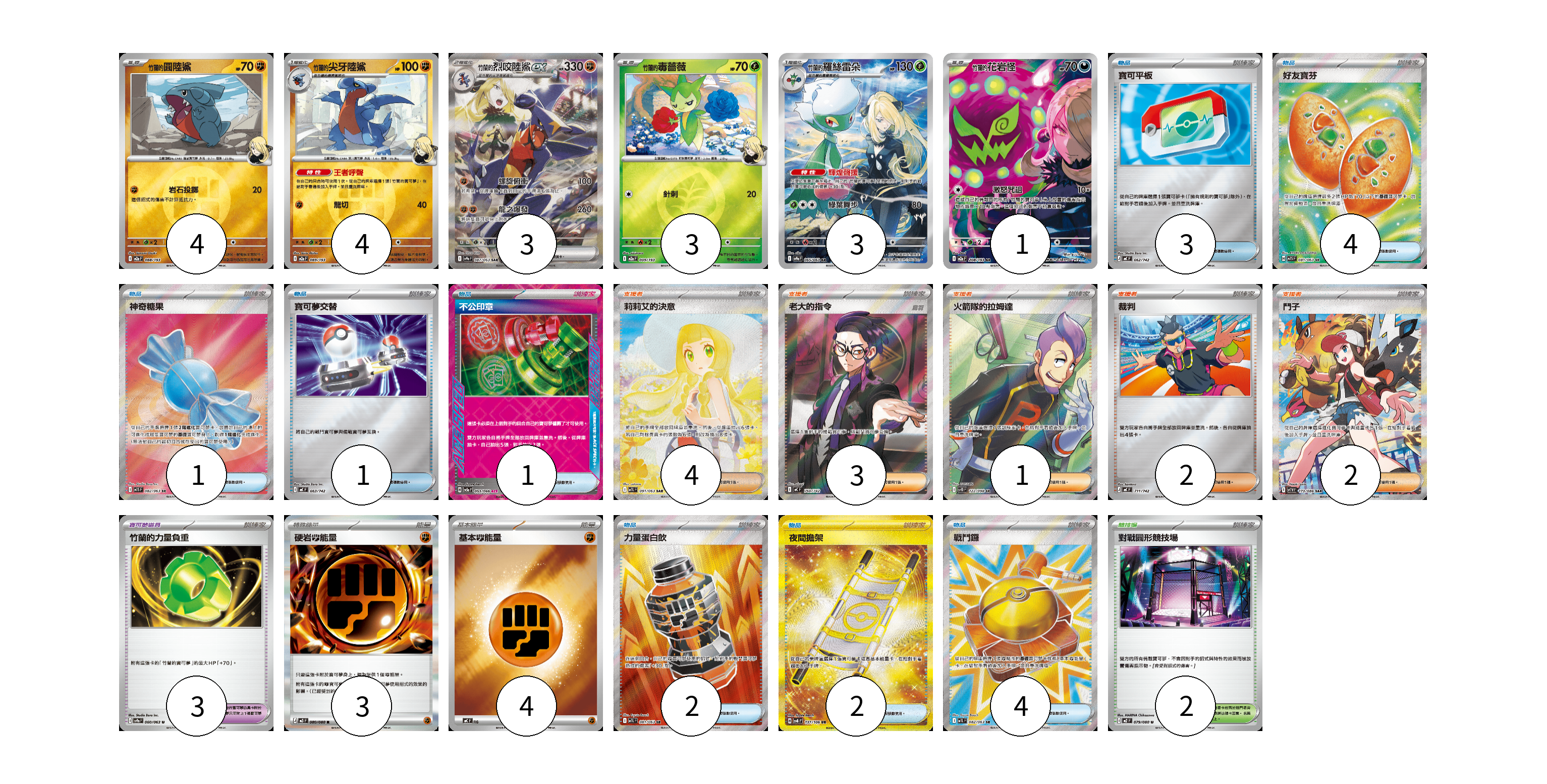 牌組構築方案 以此牌組為基礎新構築牌組 顯示卡面 顯示列表 寶可夢卡(18) 4 4 3 3 3 1 寶可夢道具(3) 3 物品卡(18) 3 4 1 1 1 2 2 4 支援者卡(12) 4 3 1 2 2 競技場卡(2) 2 能量卡(7) 3 4 寶可夢卡(18) 卡牌名稱 張數 卡牌名稱 張數 竹蘭的圓陸鯊 M2a 088/193 04 竹蘭的尖牙陸鯊 M2a 089/193 04 <竹蘭的>烈咬陸鯊ex SV9a 087/063 03 竹蘭的毒薔薇 M2a 009/193 03 <竹蘭的>羅絲雷朵 SV9a 065/063 03 <竹蘭的>花岩怪 M2a 208/193 01 寶可夢道具(3) 卡牌名稱 張數 卡牌名稱 張數 竹蘭的力量負重 SV9a 060/063 03 物品卡(18) 卡牌名稱 張數 卡牌名稱 張數 寶可平板 MC 662/742 03 好友寶芬 M1S 081/063 04 神奇糖果 M1S 082/063 01 寶可夢交替 MC 663/742 01 不公印章 SV5a 053/066 01 力量蛋白飲 M1L 081/063 02 夜間擔架 SV8 137/106 02 戰鬥鑼 M1L 082/063 04 支援者卡(12) 卡牌名稱 張數 卡牌名稱 張數 莉莉艾的決意 M1L 091/063 04 老大的指令(烏羽) MC 760/742 03 火箭隊的拉姆達 SV10 122/098 01 裁判 MC 711/742 02 鬥子 SV11W 173/086 02 競技場卡(2) 卡牌名稱 張數 卡牌名稱 張數 對戰圓形競技場 M2 079/080 02 能量卡(7) 卡牌名稱 張數 卡牌名稱 張數 硬岩【鬥】能量 M3 080/080 03 基本【鬥】能量 MC FIG 04 以此牌組為基礎新構築牌組 牌組編碼 XamfRE-wGiyeq-rCHDjI copy 列印牌組單 牌組編碼已複製 分享至SNS