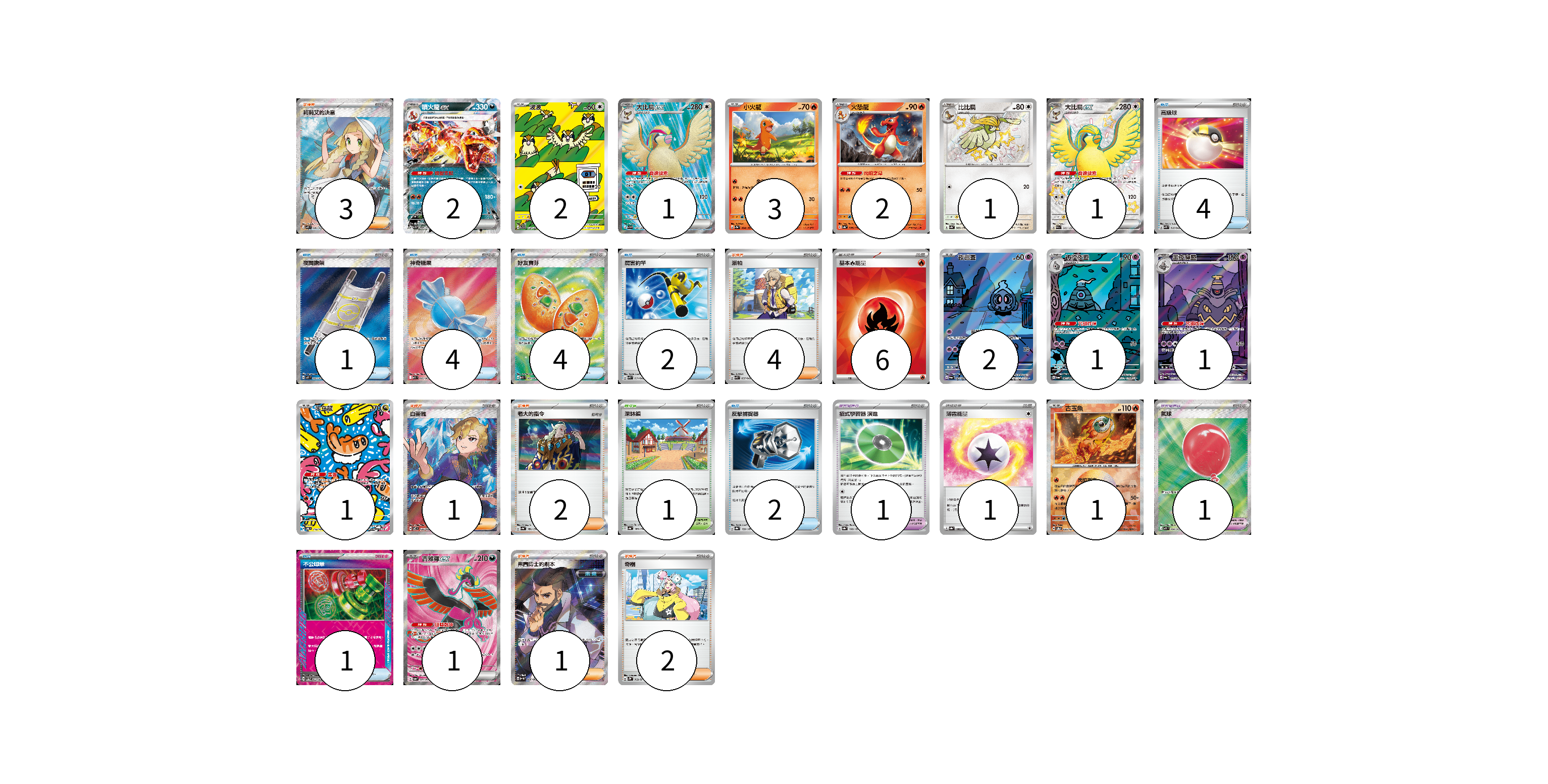 牌組構築方案 以此牌組為基礎新構築牌組 顯示卡面 顯示列表 寶可夢卡(19) 2 2 1 3 2 1 1 2 1 1 1 1 1 寶可夢道具(2) 1 1 物品卡(18) 4 1 4 4 2 2 1 支援者卡(13) 3 4 1 2 1 2 競技場卡(1) 1 能量卡(7) 6 1 寶可夢卡(19) 卡牌名稱 張數 卡牌名稱 張數 噴火龍ex SV3 066/108 02 波波 SV3 118/108 02 大比鳥ex SV3 128/108 01 小火龍 SV2a 004/165 03 火恐龍 SV4a 026/190 02 比比鳥 SV4a 305/190 01 大比鳥ex SV4a 335/190 01 夜巡靈 SV6a 068/064 02 彷徨夜靈 SV6a 069/064 01 黑夜魔靈 SV6a 070/064 01 米立龍 SV6 112/101 01 古玉魚 SV8a 025/187 01 吉雉雞ex SV6a 081/064 01 寶可夢道具(2) 卡牌名稱 張數 卡牌名稱 張數 招式學習器 演進 SV8a 160/187 01 氣球 M1L 084/063 01 物品卡(18) 卡牌名稱 張數 卡牌名稱 張數 高級球 SVK 018/042 04 夜間擔架 M1L 083/063 01 神奇糖果 M1S 082/063 04 好友寶芬 M1S 081/063 04 厲害釣竿 SVK 011/042 02 反擊捕捉器 SV8a 139/187 02 不公印章 SV5a 053/066 01 支援者卡(13) 卡牌名稱 張數 卡牌名稱 張數 莉莉艾的決意 M1L 086/063 03 派帕 SVK 035/042 04 白蕾雅 SV7 126/102 01 老大的指令 SV4a 181/190 02 弗圖博士的劇本 SV4M 086/066 01 奇樹 SV2D 069/071 02 競技場卡(1) 卡牌名稱 張數 卡牌名稱 張數 深缽鎮 SV4a 185/190 01 能量卡(7) 卡牌名稱 張數 卡牌名稱 張數 基本【火】能量 SVK FIR 06 薄霧能量 SV8a 186/187 01 以此牌組為基礎新構築牌組 牌組編碼 XdcmKu-bGqkhD-YJZCAN copy 列印牌組單 牌組編碼已複製 分享至SNS