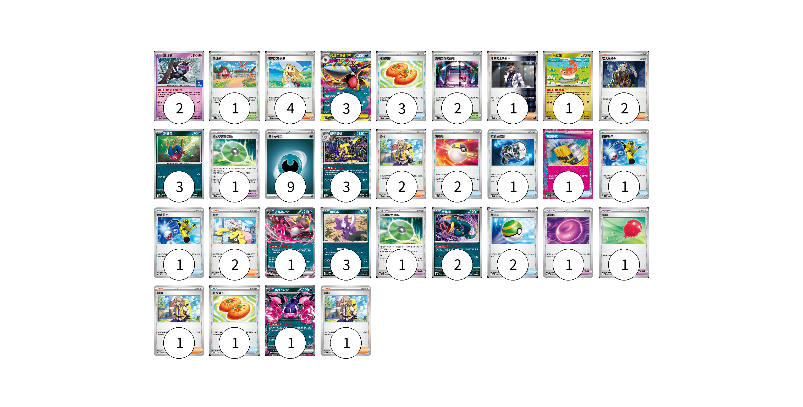 牌組構築方案 以此牌組為基礎新構築牌組 顯示卡面 顯示列表 寶可夢卡(20) 2 3 1 3 3 1 1 3 2 1 寶可夢道具(4) 1 1 1 1 物品卡(11) 3 2 1 1 1 2 1 支援者卡(13) 4 1 2 2 2 1 1 競技場卡(3) 1 2 能量卡(9) 9 寶可夢卡(20) 卡牌名稱 張數 卡牌名稱 張數 願增猿 M-P 014/M-P 02 超級巨牙鯊ex M2 051/080 03 米立龍 MBD 010/022 01 利牙魚 M2 050/080 03 顫弦蠑螈 M2 057/080 03 厲害釣竿 SVEL 010/020 01 吉雉雞ex SVOD 004/020 01 毒電嬰 M2 056/080 03 飯匙蛇 M2 052/080 02 桃歹郎ex MBG 009/022 01 寶可夢道具(4) 卡牌名稱 張數 卡牌名稱 張數 招式學習器 演進 SV8a 160/187 01 招式學習器 演進 SV4M 063/066 01 鎖鏈糬 SV6a 057/064 01 氣球 MBG 019/022 01 物品卡(11) 卡牌名稱 張數 卡牌名稱 張數 好友寶芬 MBG 011/022 03 高級球 SVF 017/038 02 反擊捕捉器 SV8a 139/187 01 高級香氛 SV5a 055/066 01 厲害釣竿 SV4a 158/190 01 巢穴球 SVK 016/042 02 好友寶芬 SVOM 012/021 01 支援者卡(13) 卡牌名稱 張數 卡牌名稱 張數 莉莉艾的決意 MBG 022/022 04 弗圖博士的劇本 SV8a 175/187 01 老大的指令 MBG 021/022 02 派帕 SVK 035/042 02 奇樹 SVTM 017/022 02 派帕 SVTM 019/022 01 派帕 SVTL 020/021 01 競技場卡(3) 卡牌名稱 張數 卡牌名稱 張數 深缽鎮 SV1a 070/073 01 對戰圓形競技場 M2 079/080 02 能量卡(9) 卡牌名稱 張數 卡牌名稱 張數 基本惡能量 sv-p DAR 09 以此牌組為基礎新構築牌組 牌組編碼 XhOZdx-ICZwEu-qLvmya copy 列印牌組單 牌組編碼已複製 分享至SNS