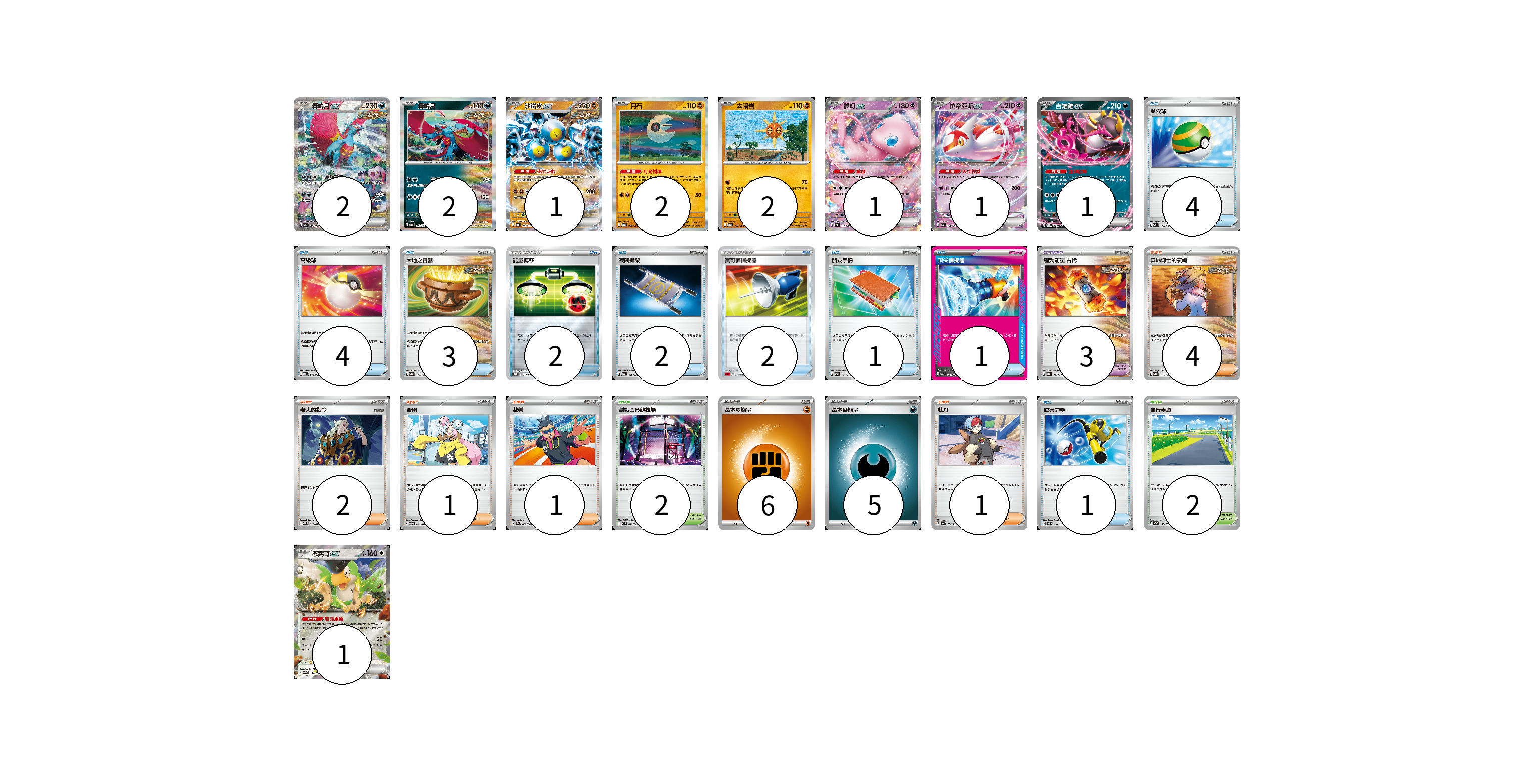 牌組構築方案 以此牌組為基礎新構築牌組 顯示卡面 顯示列表 寶可夢卡(13) 2 2 1 2 2 1 1 1 1 寶可夢道具(3) 3 物品卡(20) 4 4 3 2 2 2 1 1 1 支援者卡(9) 4 2 1 1 1 競技場卡(4) 2 2 能量卡(11) 6 5 寶可夢卡(13) 卡牌名稱 張數 卡牌名稱 張數 轟鳴月ex SV4K 090/066 02 轟鳴月 SV8a 100/187 02 沙鐵皮ex SV8a 088/187 01 月石 M1L 026/063 02 太陽岩 M1L 027/063 02 夢幻ex SV4a 076/190 01 拉帝亞斯ex SV7a 019/064 01 吉雉雞ex SVOD 004/020 01 怒鸚哥ex SV4a 154/190 01 寶可夢道具(3) 卡牌名稱 張數 卡牌名稱 張數 驅勁能量 古代 SV8a 157/187 03 物品卡(20) 卡牌名稱 張數 卡牌名稱 張數 巢穴球 SVM 133/175 04 高級球 MBD 014/022 04 大地之容器 SV8a 143/187 03 能量轉移 SO 017/030 02 夜間擔架 MBD 016/022 02 寶可夢捕捉器 SDL 016/021 02 朋友手冊 SVK 014/042 01 頂尖捕捉器 MBG 014/022 01 厲害釣竿 SVOD 010/020 01 支援者卡(9) 卡牌名稱 張數 卡牌名稱 張數 奧琳博士的氣魄 SV8a 167/187 04 老大的指令 MBD 020/022 02 奇樹 SVOD 016/020 01 裁判 SV9a 062/063 01 牡丹 SV4a 182/190 01 競技場卡(4) 卡牌名稱 張數 卡牌名稱 張數 對戰圓形競技場 M2 079/080 02 自行車道 SV2a 165/165 02 能量卡(11) 卡牌名稱 張數 卡牌名稱 張數 基本【鬥】能量 M-P FIG 06 基本【惡】能量 M-P DAR 05 以此牌組為基礎新構築牌組 牌組編碼 XjBhEC-vEfUzs-NCPmgD copy 列印牌組單 牌組編碼已複製 分享至SNS