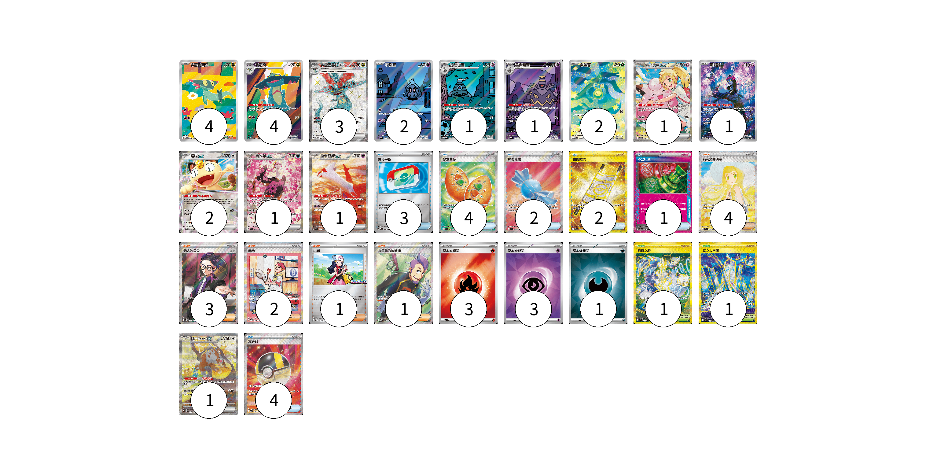牌組構築方案 以此牌組為基礎新構築牌組 顯示卡面 顯示列表 寶可夢卡(24) 4 4 3 2 1 1 2 1 1 2 1 1 1 物品卡(16) 3 4 2 2 1 4 支援者卡(11) 4 3 2 1 1 競技場卡(2) 1 1 能量卡(7) 3 3 1 寶可夢卡(24) 卡牌名稱 張數 卡牌名稱 張數 多龍梅西亞 M2a 211/193 04 多龍奇 M2a 212/193 04 多龍巴魯托ex SV6 120/101 03 夜巡靈 SV6a 068/064 02 彷徨夜靈 SV6a 069/064 01 黑夜魔靈 SV6a 070/064 01 含羞苞 M2a 196/193 02 莉莉艾的皮皮ex MC 765/742 01 願增猿 SV6 107/101 01 喵喵ex M3 061/080 02 吉雉雞ex M2a 244/193 01 拉帝亞斯ex SV7a 087/064 01 月月熊 赫月 ex SV5a 091/066 01 物品卡(16) 卡牌名稱 張數 卡牌名稱 張數 寶可平板 MC 662/742 03 好友寶芬 M1S 081/063 04 神奇糖果 M1S 082/063 02 夜間擔架 SV8 137/106 02 不公印章 SV5a 053/066 01 高級球 M2a 216/193 04 支援者卡(11) 卡牌名稱 張數 卡牌名稱 張數 莉莉艾的決意 M1L 091/063 04 老大的指令(烏羽) MC 760/742 03 赤松 SV8a 227/187 02 小光 M-P 028/M-P 01 火箭隊的拉姆達 SV10 122/098 01 競技場卡(2) 卡牌名稱 張數 卡牌名稱 張數 阻礙之塔 SV10 132/098 01 零之大空洞 SV7 135/102 01 能量卡(7) 卡牌名稱 張數 卡牌名稱 張數 基本【火】能量 MC FIR 03 基本【超】能量 SVOD PSY 03 基本【惡】能量 SVOM DAR 01 以此牌組為基礎新構築牌組 牌組編碼 XrHEai-JLuGGm-fQsQdC copy 列印牌組單 牌組編碼已複製 分享至SNS