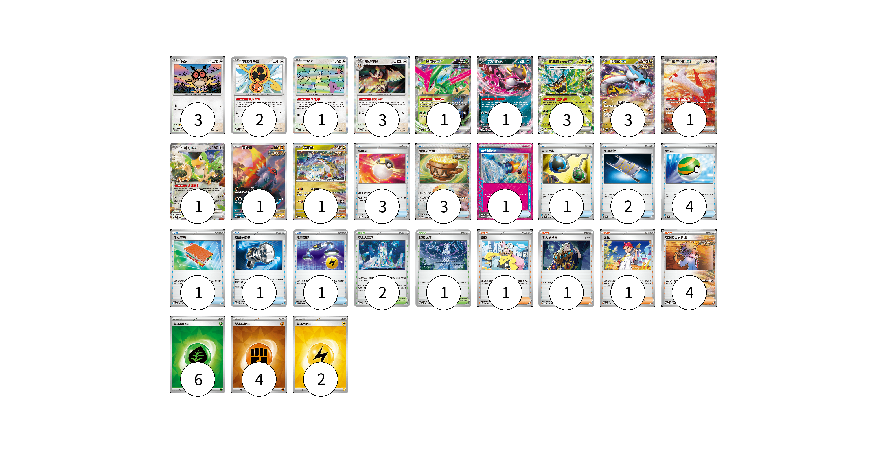 牌組構築方案 以此牌組為基礎新構築牌組 顯示卡面 顯示列表 寶可夢卡(21) 3 2 1 3 1 1 3 3 1 1 1 1 物品卡(17) 3 3 1 1 2 4 1 1 1 支援者卡(7) 1 1 1 4 競技場卡(3) 2 1 能量卡(12) 6 4 2 寶可夢卡(21) 卡牌名稱 張數 卡牌名稱 張數 咕咕 SV7 076/102 03 旋轉洛托姆 SV8a 131/187 02 百變怪 SV2a 132/165 01 貓頭夜鷹 SV8a 128/187 03 鐵斑葉ex SV8a 016/187 01 吉雉雞ex SV8a 104/187 01 厄鬼椪 碧草面具ex SV6 016/101 03 猛雷鼓ex SV5K 053/071 03 拉帝亞斯ex SV7a 087/064 01 怒鸚哥ex SV2P 065/071 01 爬地翅 SV4K 074/066 01 猛雷鼓 SV7 075/102 01 物品卡(17) 卡牌名稱 張數 卡牌名稱 張數 高級球 SVOD 012/020 03 大地之容器 SV8a 143/187 03 頂尖捕捉器 SV8a 148/187 01 能量回收 SVM 125/175 01 夜間擔架 SV8a 151/187 02 巢穴球 SVM 133/175 04 朋友手冊 SVK 014/042 01 反擊捕捉器 SVTS 009/022 01 能量轉移 SVTR 010/021 01 支援者卡(7) 卡牌名稱 張數 卡牌名稱 張數 奇樹 SVOM 018/021 01 老大的指令 SVOD 019/020 01 赤松 SVK 027/042 01 奧琳博士的氣魄 SVHK 017/022 04 競技場卡(3) 卡牌名稱 張數 卡牌名稱 張數 零之大空洞 SV8a 182/187 02 阻礙之塔 SV8a 181/187 01 能量卡(12) 卡牌名稱 張數 卡牌名稱 張數 基本【草】能量 SVM GRA 06 基本【鬥】能量 SVM FIG 04 基本【雷】能量 SVM LIG 02 以此牌組為基礎新構築牌組 牌組編碼 XwKQgF-KewaDr-moDKgM copy 列印牌組單 牌組編碼已複製 分享至SNS