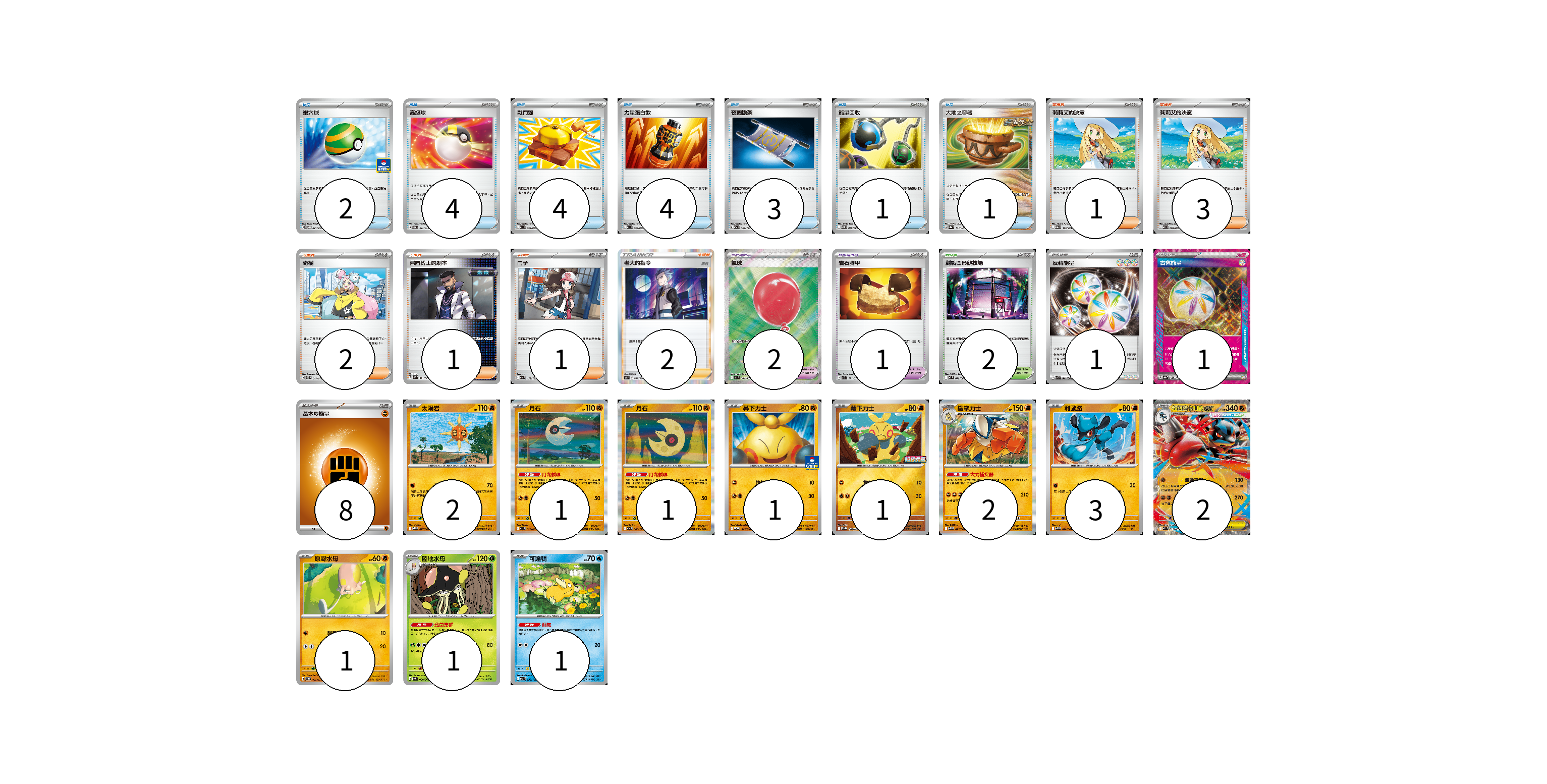 牌組構築方案 以此牌組為基礎新構築牌組 顯示卡面 顯示列表 寶可夢卡(16) 2 1 1 1 1 2 3 2 1 1 1 寶可夢道具(3) 2 1 物品卡(19) 2 4 4 4 3 1 1 支援者卡(10) 1 3 2 1 1 2 競技場卡(2) 2 能量卡(10) 1 1 8 寶可夢卡(16) 卡牌名稱 張數 卡牌名稱 張數 太陽岩 M1L 027/063 02 月石 M1L 026/063 01 月石 M2a 086/193 01 幕下力士 M-P 015/M-P 01 幕下力士 M-P 007/M-P 01 鐵掌力士 M1L 025/063 02 利歐路 M1L 028/063 03 超級路卡利歐ex M1L 029/063 02 原野水母 SVD 065/139 01 陸地水母 SV4M 008/066 01 可達鴨 M2a 032/193 01 寶可夢道具(3) 卡牌名稱 張數 卡牌名稱 張數 氣球 M1L 084/063 02 岩石胸甲 SV1S 071/078 01 物品卡(19) 卡牌名稱 張數 卡牌名稱 張數 巢穴球 SV-P 091/SV-P 02 高級球 SVEM 013/020 04 戰鬥鑼 M1L 059/063 04 力量蛋白飲 M1L 058/063 04 夜間擔架 M2a 159/193 03 能量回收 SV11W 079/086 01 大地之容器 SV8a 143/187 01 支援者卡(10) 卡牌名稱 張數 卡牌名稱 張數 莉莉艾的決意 M2a 175/193 01 莉莉艾的決意 M1L 062/063 03 奇樹 SVTG 017/019 02 弗圖博士的劇本 SVHM 021/022 01 鬥子 M2a 172/193 01 老大的指令(赤日) S9 097/100 02 競技場卡(2) 卡牌名稱 張數 卡牌名稱 張數 對戰圓形競技場 M2 079/080 02 能量卡(10) 卡牌名稱 張數 卡牌名稱 張數 反轉能量 SVK 041/042 01 古舊能量 SV8a 187/187 01 基本【鬥】能量 M-P FIG 08 以此牌組為基礎新構築牌組 牌組編碼 XwoAWl-Mhuqff-StAKoP copy 列印牌組單 牌組編碼已複製 分享至SNS