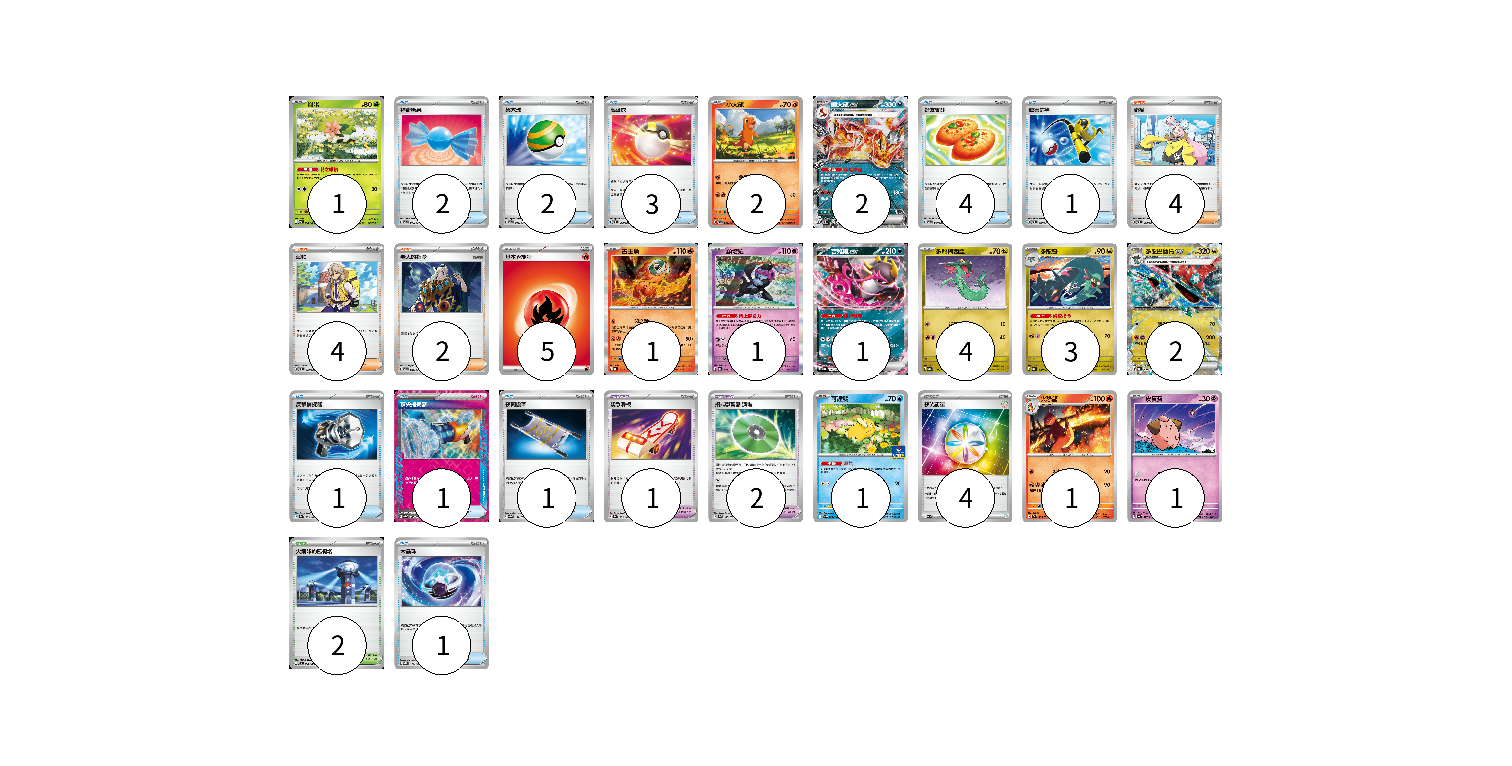 牌組構築方案 以此牌組為基礎新構築牌組 顯示卡面 顯示列表 寶可夢卡(20) 1 2 2 1 1 1 4 3 2 1 1 1 寶可夢道具(7) 4 1 2 物品卡(16) 2 2 3 4 1 1 1 1 1 支援者卡(6) 4 2 競技場卡(2) 2 能量卡(9) 5 4 寶可夢卡(20) 卡牌名稱 張數 卡牌名稱 張數 謝米 SV9a 006/063 01 小火龍 SVTL 001/021 02 噴火龍ex SVTL 006/021 02 古玉魚 SV8a 025/187 01 願增猿 SV8a 075/187 01 吉雉雞ex SV8a 104/187 01 多龍梅西亞 SV8a 118/187 04 多龍奇 SV8a 119/187 03 多龍巴魯托ex SV8a 120/187 02 可達鴨 SV-P 220/SV-P 01 火恐龍 SV2a 005/165 01 皮寶寶 SV4a 077/190 01 寶可夢道具(7) 卡牌名稱 張數 卡牌名稱 張數 奇樹 SVTL 018/021 04 緊急滑板 SV8a 153/187 01 招式學習器 演進 SV8a 160/187 02 物品卡(16) 卡牌名稱 張數 卡牌名稱 張數 神奇糖果 SVTL 013/021 02 巢穴球 SVTL 011/021 02 高級球 SVTL 012/021 03 好友寶芬 SVTL 010/021 04 厲害釣竿 SVTL 009/021 01 反擊捕捉器 SV8a 139/187 01 頂尖捕捉器 SV8a 148/187 01 夜間擔架 SV8a 151/187 01 太晶珠 SV8a 145/187 01 支援者卡(6) 卡牌名稱 張數 卡牌名稱 張數 派帕 SVTL 020/021 04 老大的指令 SVTL 021/021 02 競技場卡(2) 卡牌名稱 張數 卡牌名稱 張數 火箭隊的監視塔 SV10 096/098 02 能量卡(9) 卡牌名稱 張數 卡牌名稱 張數 基本【火】能量 SVTL FIR 05 夜光能量 SV1a 073/073 04 以此牌組為基礎新構築牌組 牌組編碼 XyaRdv-mVRiZO-XPuMKc copy 列印牌組單 牌組編碼已複製 分享至SNS