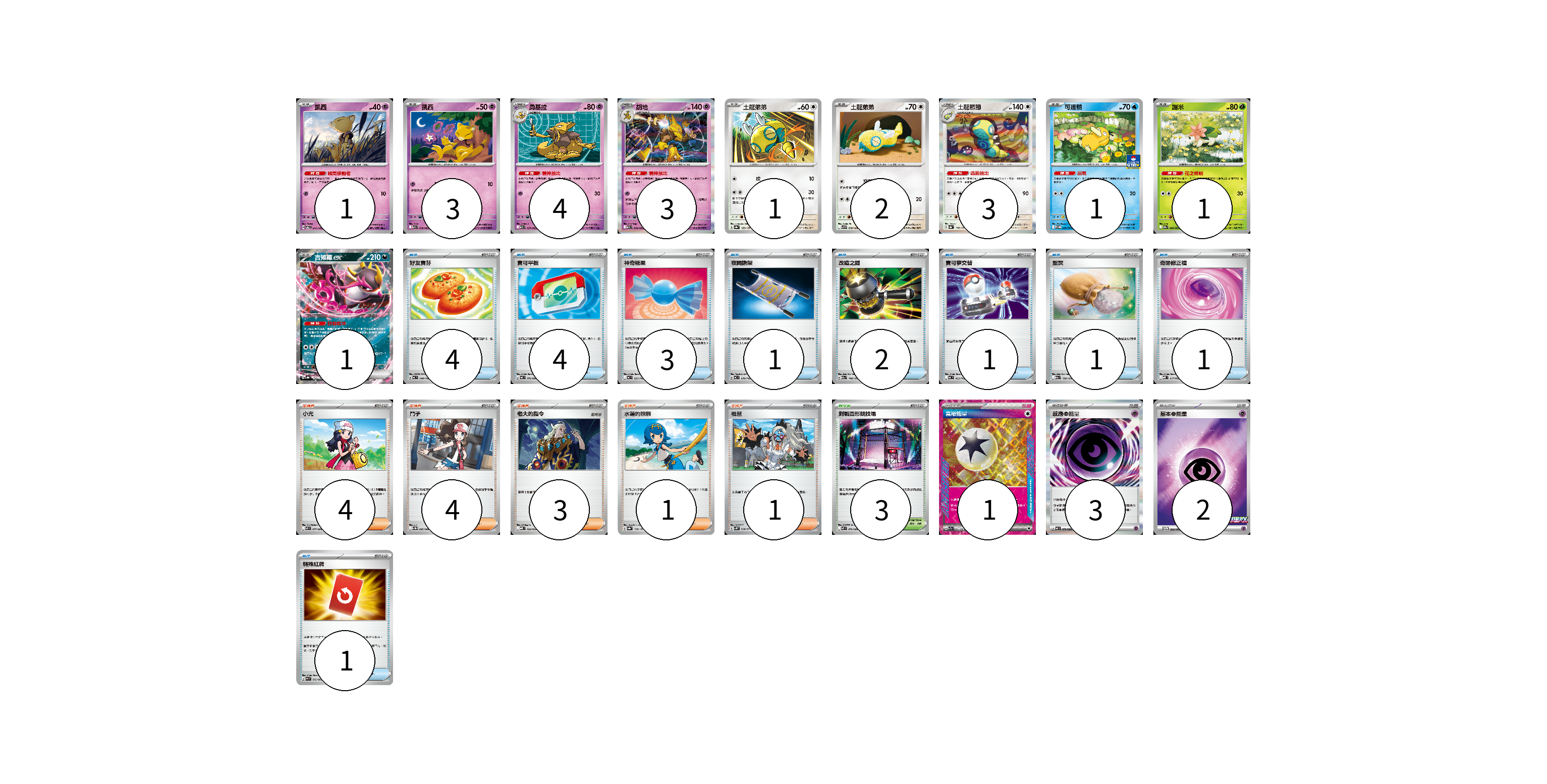 牌組構築方案 以此牌組為基礎新構築牌組 顯示卡面 顯示列表 寶可夢卡(20) 1 3 4 3 1 2 3 1 1 1 物品卡(18) 4 4 3 1 2 1 1 1 1 支援者卡(13) 4 4 3 1 1 競技場卡(3) 3 能量卡(6) 1 3 2 寶可夢卡(20) 卡牌名稱 張數 卡牌名稱 張數 凱西 SV6 047/101 01 凱西 M1S 036/063 03 勇基拉 M1S 037/063 04 胡地 M1S 038/063 03 土龍弟弟 SV8a 129/187 01 土龍弟弟 SV9 078/100 02 土龍節節 SV8a 130/187 03 可達鴨 SV-P 220/SV-P 01 謝米 SV9a 006/063 01 吉雉雞ex SV8a 104/187 01 物品卡(18) 卡牌名稱 張數 卡牌名稱 張數 好友寶芬 MC 648/742 04 寶可平板 M3 070/080 04 神奇糖果 MC 655/742 03 夜間擔架 MC 670/742 01 改造之錘 M2a 148/193 02 寶可夢交替 MC 663/742 01 聖灰 M2a 150/193 01 奇跡修正檔 MBD 017/022 01 特殊紅牌 M4 072/083 01 支援者卡(13) 卡牌名稱 張數 卡牌名稱 張數 小光 M2 077/080 04 鬥子 SV11W 085/086 04 老大的指令 MBD 020/022 03 水蓮的照顧 SV8a 168/187 01 枇琶 SV5K 068/071 01 競技場卡(3) 卡牌名稱 張數 卡牌名稱 張數 對戰圓形競技場 M2 079/080 03 能量卡(6) 卡牌名稱 張數 卡牌名稱 張數 富裕能量 SV7a 064/064 01 感應【超】能量 M3 079/080 03 基本【超】能量 M-P 033/M-P 02 以此牌組為基礎新構築牌組 牌組編碼 XzkEFf-LCiBDb-tNqynG copy 列印牌組單 牌組編碼已複製 分享至SNS