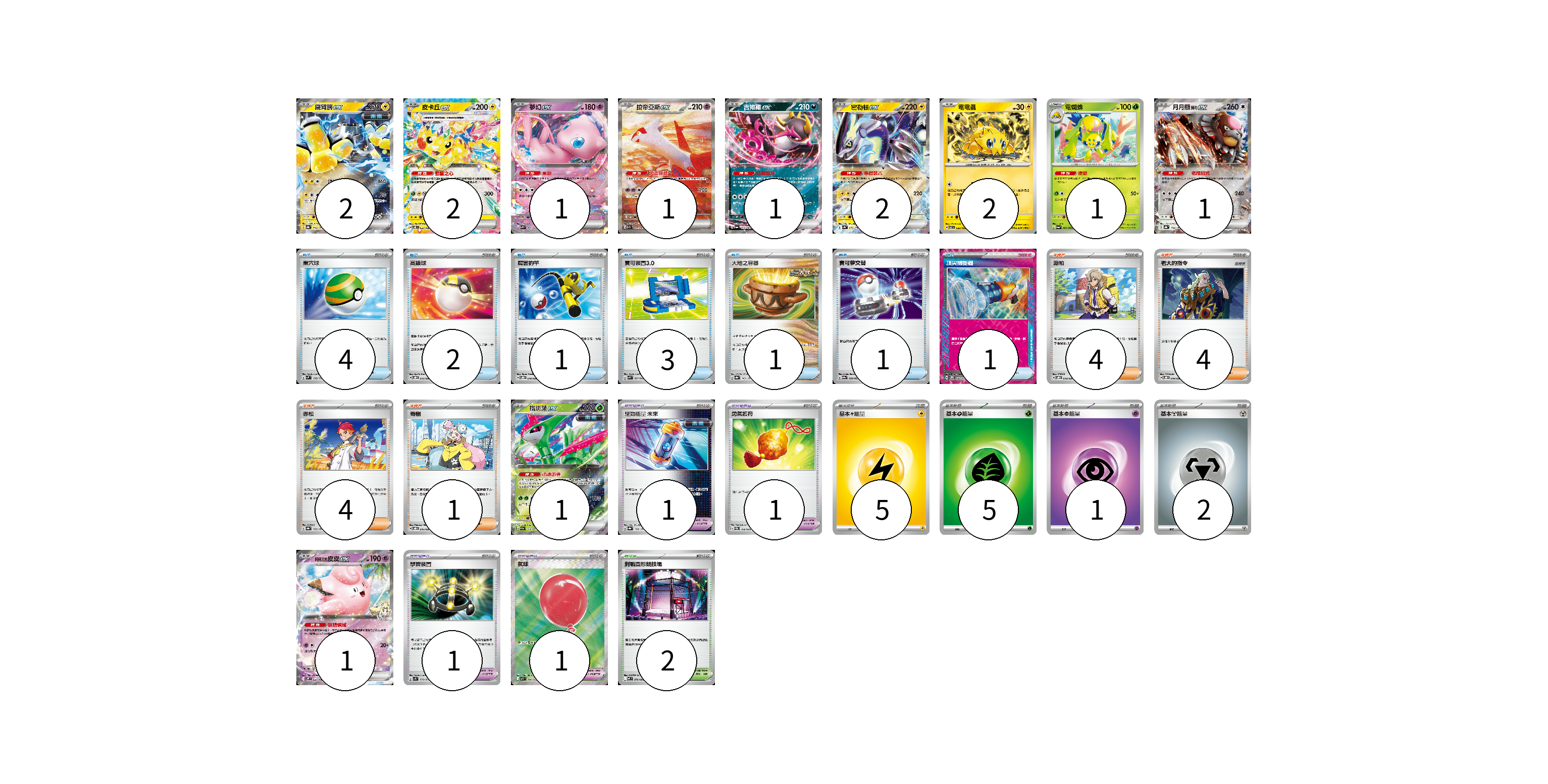 牌組構築方案 以此牌組為基礎新構築牌組 顯示卡面 顯示列表 寶可夢卡(15) 2 2 1 1 1 2 2 1 1 1 1 寶可夢道具(4) 1 1 1 1 物品卡(13) 4 2 1 3 1 1 1 支援者卡(13) 4 4 4 1 競技場卡(2) 2 能量卡(13) 5 5 1 2 寶可夢卡(15) 卡牌名稱 張數 卡牌名稱 張數 鐵臂膀ex SV8a 054/187 02 皮卡丘ex SV8 033/106 02 夢幻ex SVK 001/042 01 拉帝亞斯ex SV7a 087/064 01 吉雉雞ex SV6a 038/064 01 密勒頓ex SV4a 071/190 02 電電蟲 SV7 032/102 02 電蜘蛛 SV6a 002/064 01 月月熊 赫月ex SV8a 134/187 01 鐵斑葉ex SV5M 016/071 01 莉莉艾的皮皮ex SV9 033/100 01 寶可夢道具(4) 卡牌名稱 張數 卡牌名稱 張數 驅勁能量 未來 SV8a 158/187 01 勇氣護符 SVEM 016/020 01 學習裝置 SV1S 072/078 01 氣球 M1L 084/063 01 物品卡(13) 卡牌名稱 張數 卡牌名稱 張數 巢穴球 SVM 133/175 04 高級球 SVOD 012/020 02 厲害釣竿 SVOD 010/020 01 寶可裝置3.0 SVK 021/042 03 大地之容器 SV8a 143/187 01 寶可夢交替 SV9a 058/063 01 頂尖捕捉器 SV5M 062/071 01 支援者卡(13) 卡牌名稱 張數 卡牌名稱 張數 派帕 SVOD 018/020 04 老大的指令 SVOD 019/020 04 赤松 SV8a 163/187 04 奇樹 SVOD 016/020 01 競技場卡(2) 卡牌名稱 張數 卡牌名稱 張數 對戰圓形競技場 M2 079/080 02 能量卡(13) 卡牌名稱 張數 卡牌名稱 張數 基本【雷】能量 SVHM LIG 05 基本【草】能量 SVF GRA 05 基本【超】能量 SVF PSY 01 基本【鋼】能量 SVD MET 02 以此牌組為基礎新構築牌組 牌組編碼 YDPXbv-vwlfzh-NinJgf copy 列印牌組單 牌組編碼已複製 分享至SNS