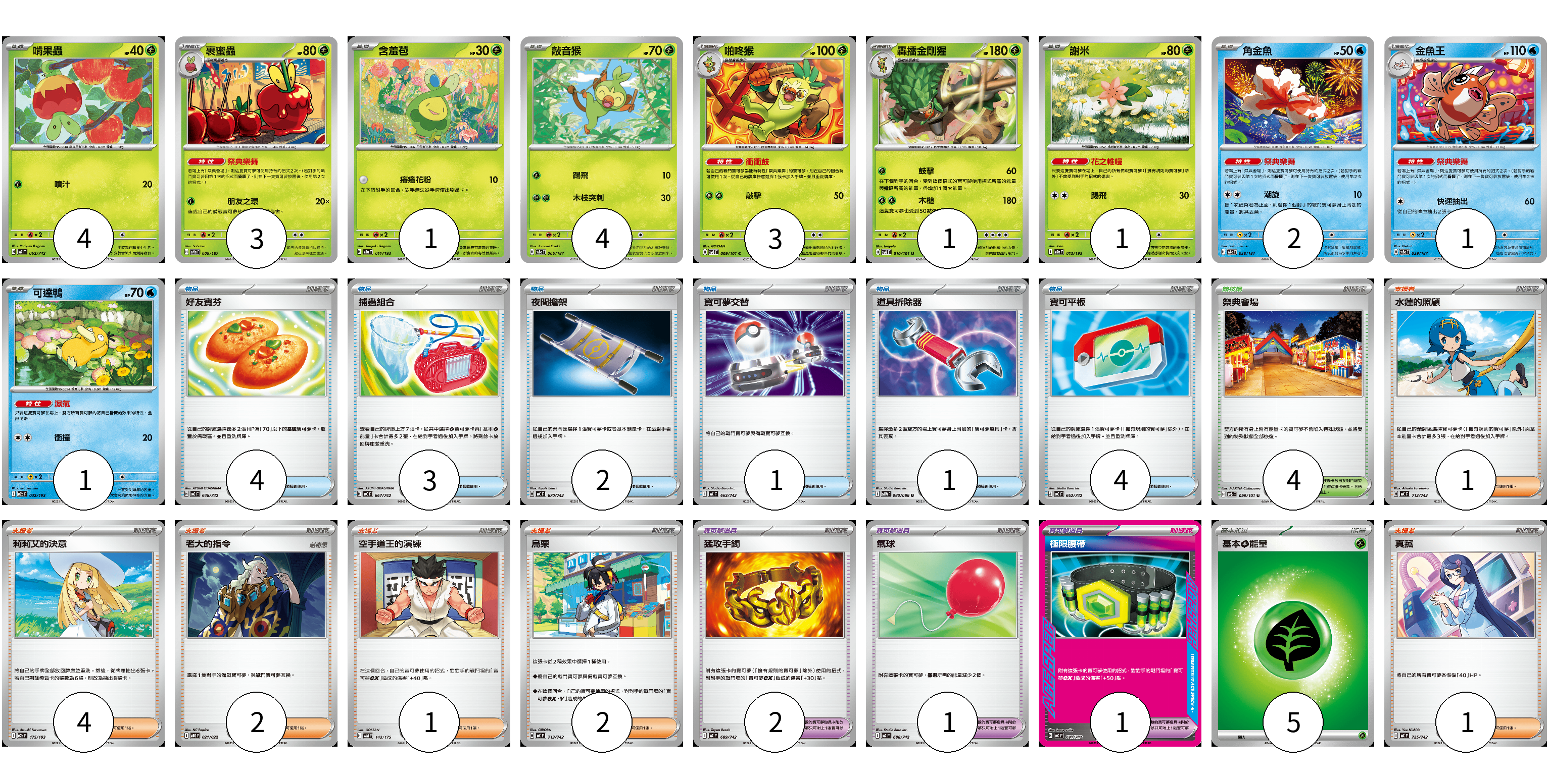 牌組構築方案 以此牌組為基礎新構築牌組 顯示卡面 顯示列表 寶可夢卡(21) 4 3 1 4 3 1 1 2 1 1 寶可夢道具(4) 2 1 1 物品卡(15) 4 3 2 1 1 4 支援者卡(11) 1 4 2 1 2 1 競技場卡(4) 4 能量卡(5) 5 寶可夢卡(21) 卡牌名稱 張數 卡牌名稱 張數 啃果蟲 MC 062/742 04 裹蜜蟲 SV8a 009/187 03 含羞苞 M2a 011/193 01 敲音猴 SV8a 006/187 04 啪咚猴 SV6 009/101 03 轟擂金剛猩 SV6 010/101 01 謝米 M2a 012/193 01 角金魚 SV8a 028/187 02 金魚王 SV8a 029/187 01 可達鴨 M2a 032/193 01 寶可夢道具(4) 卡牌名稱 張數 卡牌名稱 張數 猛攻手鐲 MC 689/742 02 氣球 MC 688/742 01 極限腰帶 MC 691/742 01 物品卡(15) 卡牌名稱 張數 卡牌名稱 張數 好友寶芬 MC 648/742 04 捕蟲組合 MC 667/742 03 夜間擔架 MC 670/742 02 寶可夢交替 MC 663/742 01 道具拆除器 SV11W 080/086 01 寶可平板 MC 662/742 04 支援者卡(11) 卡牌名稱 張數 卡牌名稱 張數 水蓮的照顧 MC 712/742 01 莉莉艾的決意 M2a 175/193 04 老大的指令 MBG 021/022 02 空手道王的演練 SVM 143/175 01 烏栗 MC 713/742 02 真菰 MC 725/742 01 競技場卡(4) 卡牌名稱 張數 卡牌名稱 張數 祭典會場 SV6 099/101 04 能量卡(5) 卡牌名稱 張數 卡牌名稱 張數 基本【草】能量 MC GRA 05 以此牌組為基礎新構築牌組 牌組編碼 YDlyYj-mfiPvq-OBuoZv copy 列印牌組單 牌組編碼已複製 分享至SNS