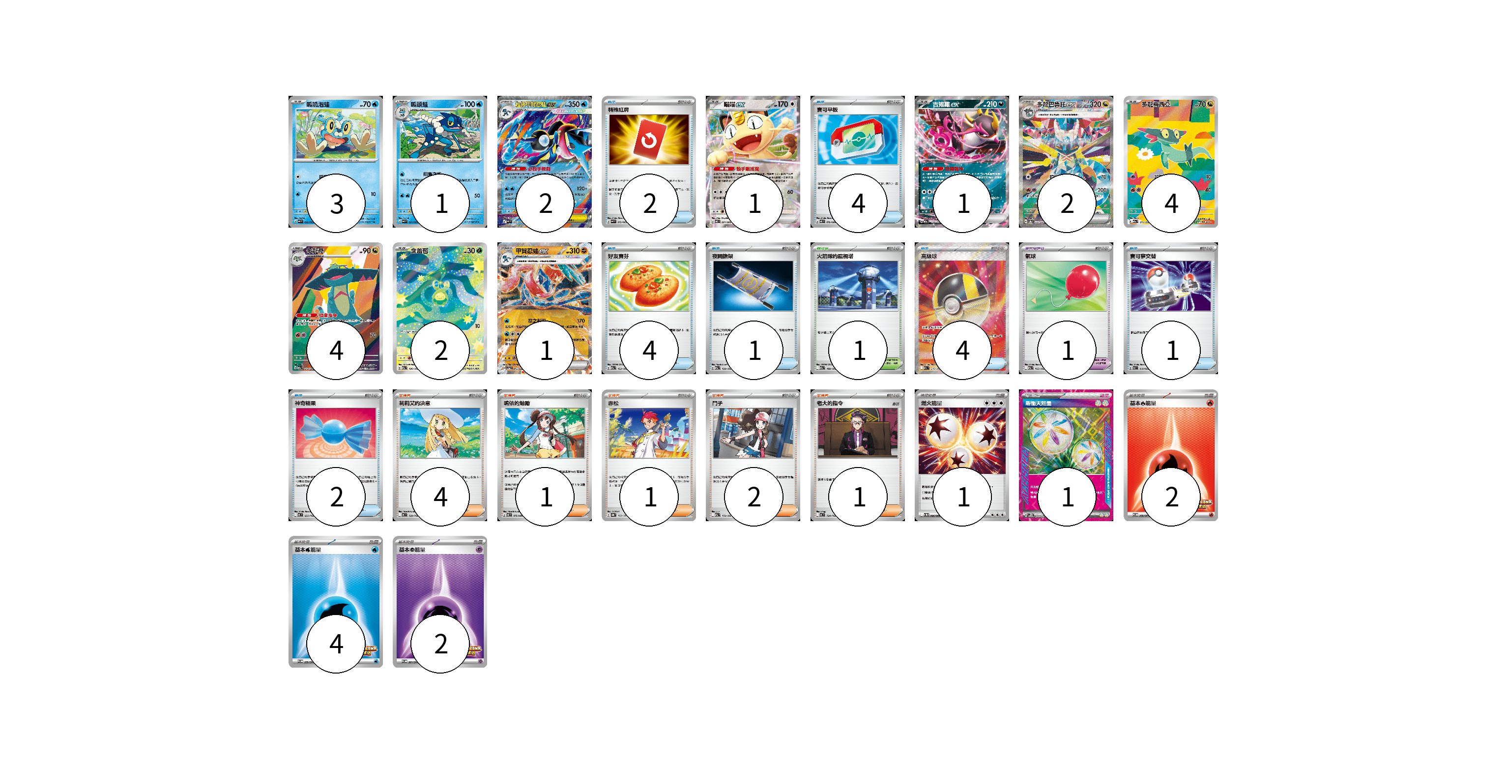 牌組構築方案 以此牌組為基礎新構築牌組 顯示卡面 顯示列表 寶可夢卡(21) 3 1 2 1 1 2 4 4 2 1 寶可夢道具(1) 1 物品卡(18) 2 4 4 1 4 1 2 支援者卡(9) 4 1 1 2 1 競技場卡(1) 1 能量卡(10) 1 1 2 4 2 寶可夢卡(21) 卡牌名稱 張數 卡牌名稱 張數 呱呱泡蛙 M4 020/083 03 呱頭蛙 M4 021/083 01 超級甲賀忍蛙ex M4 022/083 02 喵喵ex M3 061/080 01 吉雉雞ex M2a 114/193 01 多龍巴魯托ex SV8a 221/187 02 多龍梅西亞 M2a 211/193 04 多龍奇 M2a 212/193 04 含羞苞 M2a 196/193 02 甲賀忍蛙ex SV5a 045/066 01 寶可夢道具(1) 卡牌名稱 張數 卡牌名稱 張數 氣球 M2a 165/193 01 物品卡(18) 卡牌名稱 張數 卡牌名稱 張數 特殊紅牌 M4 072/083 02 寶可平板 M3 070/080 04 好友寶芬 M2a 153/193 04 夜間擔架 M2a 159/193 01 高級球 M2a 216/193 04 寶可夢交替 MJ 019/022 01 神奇糖果 MC 655/742 02 支援者卡(9) 卡牌名稱 張數 卡牌名稱 張數 莉莉艾的決意 MC 729/742 04 鳴依的勉勵 M3 075/080 01 赤松 SV8a 163/187 01 鬥子 M2a 172/193 02 老大的指令 MC 724/742 01 競技場卡(1) 卡牌名稱 張數 卡牌名稱 張數 火箭隊的監視塔 M2a 189/193 01 能量卡(10) 卡牌名稱 張數 卡牌名稱 張數 燃火能量 SV11W 086/086 01 新衝天能量 SV5K 071/071 01 基本【火】能量 SV-P 258/SV-P 02 基本【水】能量 SV-P 259/SV-P 04 基本【超】能量 SV-P 261/SV-P 02 以此牌組為基礎新構築牌組 牌組編碼 YHfgNl-sCjnHF-ZCfkWx copy 列印牌組單 牌組編碼已複製 分享至SNS
