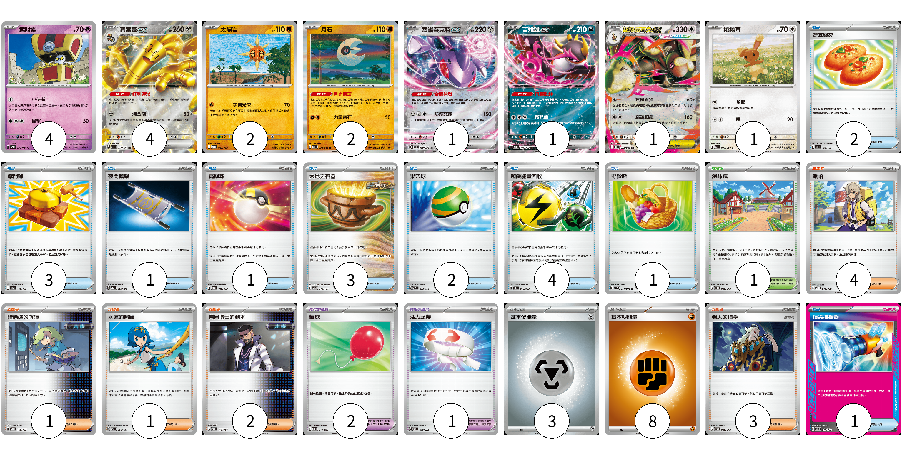 牌組構築方案 以此牌組為基礎新構築牌組 顯示卡面 顯示列表 寶可夢卡(16) 4 4 2 2 1 1 1 1 寶可夢道具(3) 2 1 物品卡(18) 2 3 1 1 3 2 4 1 1 支援者卡(11) 4 1 1 2 3 競技場卡(1) 1 能量卡(11) 3 8 寶可夢卡(16) 卡牌名稱 張數 卡牌名稱 張數 索財靈 SV7a 024/064 04 賽富豪ex SV8a 117/187 04 太陽岩 M2a 087/193 02 月石 M1L 026/063 02 蓋諾賽克特ex SV11B 069/086 01 吉雉雞ex M2a 114/193 01 超級長耳兔ex M2 072/080 01 捲捲耳 M2 071/080 01 寶可夢道具(3) 卡牌名稱 張數 卡牌名稱 張數 氣球 MBG 019/022 02 活力頭帶 SVAW 019/023 01 物品卡(18) 卡牌名稱 張數 卡牌名稱 張數 好友寶芬 M2a 153/193 02 戰鬥鑼 M2a 155/193 03 夜間擔架 M2a 159/193 01 高級球 SVQL 015/022 01 大地之容器 SV8a 143/187 03 巢穴球 SVM 133/175 02 超級能量回收 SVK 010/042 04 野餐籃 SV1V 071/078 01 頂尖捕捉器 MBG 014/022 01 支援者卡(11) 卡牌名稱 張數 卡牌名稱 張數 派帕 SVOD 018/020 04 暗碼迷的解讀 SV8a 165/187 01 水蓮的照顧 SV8a 168/187 01 弗圖博士的劇本 SV8a 175/187 02 老大的指令 SVK 036/042 03 競技場卡(1) 卡牌名稱 張數 卡牌名稱 張數 深缽鎮 SVK 039/042 01 能量卡(11) 卡牌名稱 張數 卡牌名稱 張數 基本【鋼】能量 M-P MET 03 基本【鬥】能量 M-P FIG 08 以此牌組為基礎新構築牌組 牌組編碼 YIvqOU-aJLWuI-kpnqQw copy 列印牌組單 牌組編碼已複製 分享至SNS