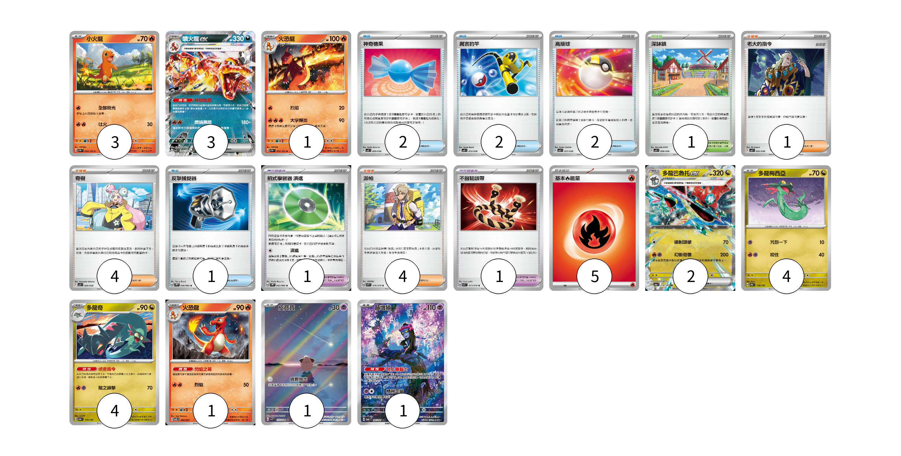 牌組構築方案 以此牌組為基礎新構築牌組 顯示卡面 顯示列表 寶可夢卡(20) 3 3 1 2 4 4 1 1 1 寶可夢道具(2) 1 1 物品卡(7) 2 2 2 1 支援者卡(9) 1 4 4 競技場卡(1) 1 能量卡(5) 5 寶可夢卡(20) 卡牌名稱 張數 卡牌名稱 張數 小火龍 SV2a 004/165 03 噴火龍ex SV3 066/108 03 火恐龍 SV2a 005/165 01 多龍巴魯托ex SV8a 120/187 02 多龍梅西亞 SV8a 118/187 04 多龍奇 SV8a 119/187 04 火恐龍 SVTL 002/021 01 皮寶寶 SV3 113/108 01 願增猿 SV6 107/101 01 寶可夢道具(2) 卡牌名稱 張數 卡牌名稱 張數 招式學習器 演進 SV4M 063/066 01 不服輸頭帶 SV1S 073/078 01 物品卡(7) 卡牌名稱 張數 卡牌名稱 張數 神奇糖果 SVF 020/038 02 厲害釣竿 SVF 013/038 02 高級球 SVF 017/038 02 反擊捕捉器 SV4M 059/066 01 支援者卡(9) 卡牌名稱 張數 卡牌名稱 張數 老大的指令 SVF 032/038 01 奇樹 SVF 029/038 04 派帕 SV1V 076/078 04 競技場卡(1) 卡牌名稱 張數 卡牌名稱 張數 深缽鎮 SVF 036/038 01 能量卡(5) 卡牌名稱 張數 卡牌名稱 張數 基本【火】能量 SVF FIR 05 以此牌組為基礎新構築牌組 牌組編碼 YPQGnc-xpQeGM-vxkpcC copy 列印牌組單 牌組編碼已複製 分享至SNS
