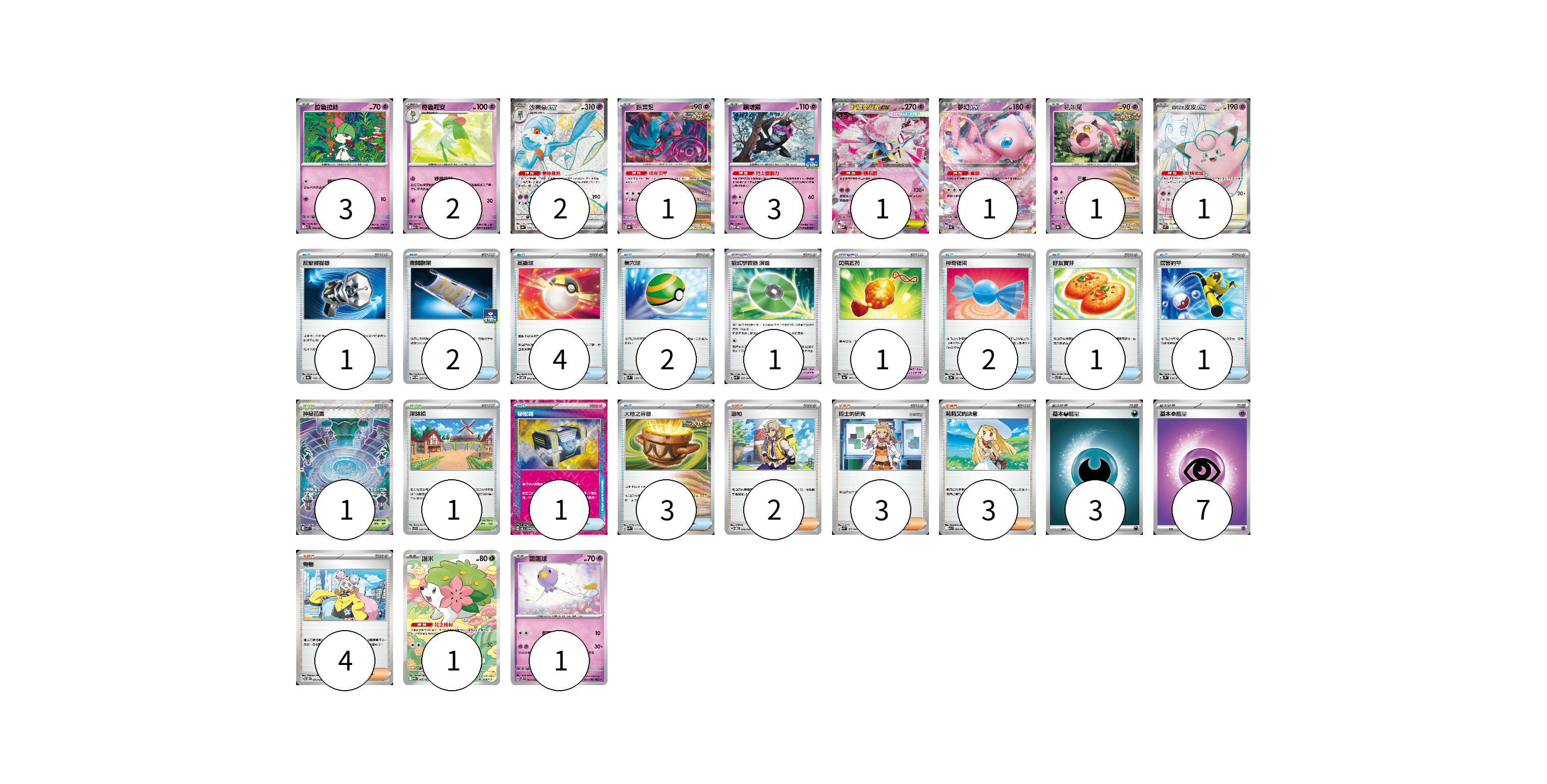 牌組構築方案 以此牌組為基礎新構築牌組 顯示卡面 顯示列表 寶可夢卡(17) 3 2 2 1 3 1 1 1 1 1 1 寶可夢道具(2) 1 1 物品卡(17) 1 2 4 2 2 1 1 1 3 支援者卡(12) 2 3 3 4 競技場卡(2) 1 1 能量卡(10) 3 7 寶可夢卡(17) 卡牌名稱 張數 卡牌名稱 張數 拉魯拉絲 M1S 040/063 03 奇魯莉安 M1S 041/063 02 沙奈朵ex SV4a 328/190 02 振翼髮 SV8a 072/187 01 願增猿 M-P 014/M-P 03 超級蒂安希ex MBD 006/022 01 夢幻ex SV4a 076/190 01 吼叫尾 SV8a 071/187 01 莉莉艾的皮皮ex SV9 115/100 01 謝米 SV9a 066/063 01 飄飄球 SVTS 005/022 01 寶可夢道具(2) 卡牌名稱 張數 卡牌名稱 張數 招式學習器 演進 SVK 025/042 01 勇氣護符 SV4a 169/190 01 物品卡(17) 卡牌名稱 張數 卡牌名稱 張數 反擊捕捉器 SV8a 139/187 01 夜間擔架 SV-P 227/SV-P 02 高級球 SVOM 013/021 04 巢穴球 SVM 133/175 02 神奇糖果 SV3a 053/062 02 好友寶芬 SVTS 012/022 01 厲害釣竿 SV2P 066/071 01 秘密箱 SV6 092/101 01 大地之容器 SVK 012/042 03 支援者卡(12) 卡牌名稱 張數 卡牌名稱 張數 派帕 SVOD 018/020 02 博士的研究 SVK 032/042 03 莉莉艾的決意 M1L 062/063 03 奇樹 SVOD 016/020 04 競技場卡(2) 卡牌名稱 張數 卡牌名稱 張數 神秘花園 M1S 086/063 01 深缽鎮 SVF 036/038 01 能量卡(10) 卡牌名稱 張數 卡牌名稱 張數 基本【惡】能量 MBG DAR 03 基本【超】能量 MBD PSY 07 以此牌組為基礎新構築牌組 牌組編碼 YQAMsy-scyZzU-GlaGJe copy 列印牌組單 牌組編碼已複製 分享至SNS