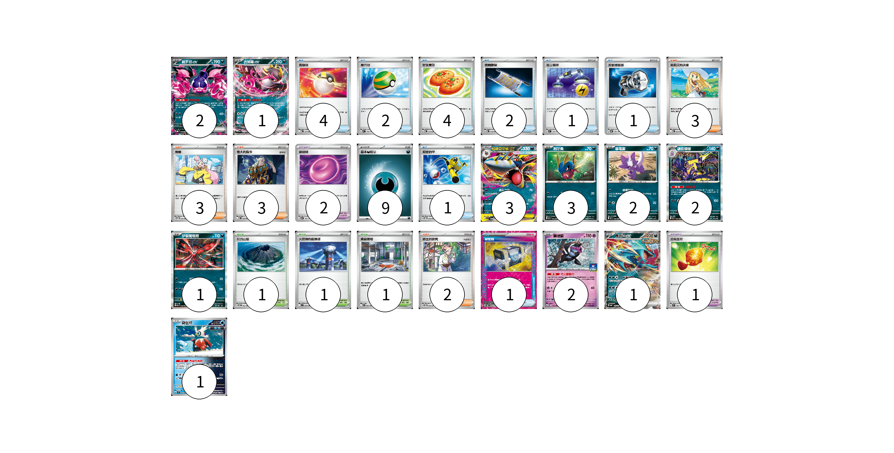 牌組構築方案 以此牌組為基礎新構築牌組 顯示卡面 顯示列表 寶可夢卡(18) 2 1 3 3 2 2 1 2 1 1 寶可夢道具(3) 2 1 物品卡(16) 4 2 4 2 1 1 1 1 支援者卡(11) 3 3 3 2 競技場卡(3) 1 1 1 能量卡(9) 9 寶可夢卡(18) 卡牌名稱 張數 卡牌名稱 張數 桃歹郎ex MBG 009/022 02 吉雉雞ex SV6a 038/064 01 超級巨牙鯊ex M2 051/080 03 利牙魚 M2 050/080 03 毒電嬰 M2 056/080 02 顫弦蠑螈 M2 057/080 02 伊裴爾塔爾 M1L 040/063 01 願增猿 M-P 014/M-P 02 轟鳴月ex SV8a 101/187 01 鐵包袱 SV4M 020/066 01 寶可夢道具(3) 卡牌名稱 張數 卡牌名稱 張數 鎖鏈糬 SV8a 154/187 02 勇氣護符 SVM 142/175 01 物品卡(16) 卡牌名稱 張數 卡牌名稱 張數 高級球 MBD 014/022 04 巢穴球 SVM 133/175 02 好友寶芬 MBD 013/022 04 夜間擔架 MBD 016/022 02 能量轉移 SVM 127/175 01 反擊捕捉器 SV8a 139/187 01 厲害釣竿 SVOD 010/020 01 秘密箱 SV6 092/101 01 支援者卡(11) 卡牌名稱 張數 卡牌名稱 張數 莉莉艾的決意 MBD 021/022 03 奇樹 SVOD 016/020 03 老大的指令 MBD 020/022 03 博士的研究 SVOM 019/021 02 競技場卡(3) 卡牌名稱 張數 卡牌名稱 張數 引力山岳 SV8 106/106 01 火箭隊的監視塔 SV10 096/098 01 險惡廢墟 M1L 063/063 01 能量卡(9) 卡牌名稱 張數 卡牌名稱 張數 基本【惡】能量 MBG DAR 09 以此牌組為基礎新構築牌組 牌組編碼 YQGztn-NwRDRJ-haNmQe copy 列印牌組單 牌組編碼已複製 分享至SNS