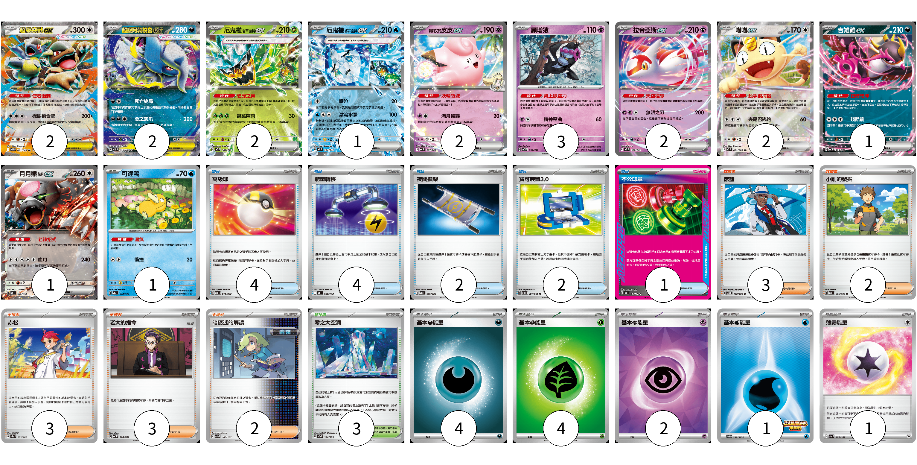 牌組構築方案 以此牌組為基礎新構築牌組 顯示卡面 顯示列表 寶可夢卡(19) 2 2 2 1 2 3 2 2 1 1 1 物品卡(13) 4 4 2 2 1 支援者卡(13) 3 2 3 3 2 競技場卡(3) 3 能量卡(12) 4 4 2 1 1 寶可夢卡(19) 卡牌名稱 張數 卡牌名稱 張數 超級袋獸ex M1S 051/063 02 超級阿勃梭魯ex M1L 038/063 02 厄鬼椪 碧草面具ex MC 082/742 02 厄鬼椪 水井面具ex MC 224/742 01 莉莉艾的皮皮ex MC 287/742 02 願增猿 MC 358/742 03 拉帝亞斯ex MC 312/742 02 喵喵ex M3 061/080 02 吉雉雞ex MC 489/742 01 月月熊 赫月 ex MC 625/742 01 可達鴨 M2a 032/193 01 物品卡(13) 卡牌名稱 張數 卡牌名稱 張數 高級球 MBD 014/022 04 能量轉移 MC 638/742 04 夜間擔架 MBD 016/022 02 寶可裝置3.0 SV11B 081/086 02 不公印章 MC 633/742 01 支援者卡(13) 卡牌名稱 張數 卡牌名稱 張數 席藍 SV8 102/106 03 小剛的發掘 SV9 096/100 02 赤松 SV8a 163/187 03 老大的指令 MC 724/742 03 暗碼迷的解讀 SV8a 165/187 02 競技場卡(3) 卡牌名稱 張數 卡牌名稱 張數 零之大空洞 M2a 184/193 03 能量卡(12) 卡牌名稱 張數 卡牌名稱 張數 基本【惡】能量 MC DAR 04 基本【草】能量 MC GRA 04 基本【超】能量 SVOD PSY 02 基本【水】能量 SV-P 259/SV-P 01 薄霧能量 SV8a 186/187 01 以此牌組為基礎新構築牌組 牌組編碼 YSDyGB-OQzHId-uDFpsy copy 列印牌組單 牌組編碼已複製 分享至SNS