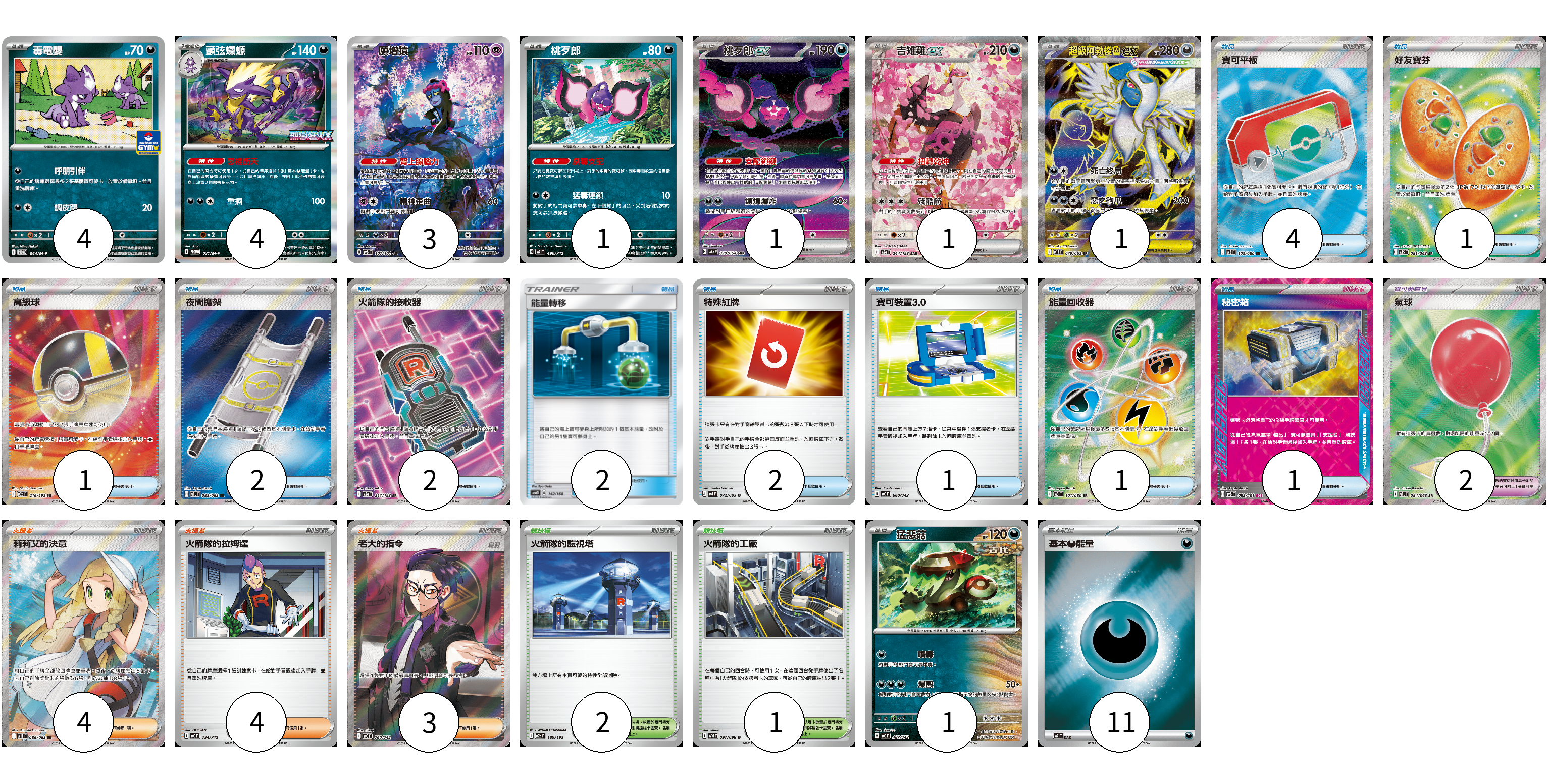 牌組構築方案 以此牌組為基礎新構築牌組 顯示卡面 顯示列表 寶可夢卡(16) 4 4 3 1 1 1 1 1 寶可夢道具(2) 2 物品卡(17) 4 1 1 2 2 2 2 1 1 1 支援者卡(11) 4 4 3 競技場卡(3) 2 1 能量卡(11) 11 寶可夢卡(16) 卡牌名稱 張數 卡牌名稱 張數 毒電嬰 M-P 044/M-P 04 顫弦蠑螈 M-P 031/M-P 04 願增猿 SV6 107/101 03 桃歹郎 MC 490/742 01 桃歹郎ex SV6a 090/064 01 吉雉雞ex M2a 244/193 01 超級阿勃梭魯ex M1L 079/063 01 猛惡菇 MC 487/742 01 寶可夢道具(2) 卡牌名稱 張數 卡牌名稱 張數 氣球 M1L 084/063 02 物品卡(17) 卡牌名稱 張數 卡牌名稱 張數 寶可平板 M3 103/080 04 好友寶芬 M1S 081/063 01 高級球 M2a 216/193 01 夜間擔架 M1L 083/063 02 火箭隊的接收器 M2a 217/193 02 能量轉移 AS6D 142/168 02 特殊紅牌 M4 072/083 02 寶可裝置3.0 MC 660/742 01 能量回收器 M3 101/080 01 秘密箱 SV6 092/101 01 支援者卡(11) 卡牌名稱 張數 卡牌名稱 張數 莉莉艾的決意 M1L 086/063 04 火箭隊的拉姆達 MC 734/742 04 老大的指令(烏羽) MC 760/742 03 競技場卡(3) 卡牌名稱 張數 卡牌名稱 張數 火箭隊的監視塔 M2a 189/193 02 火箭隊的工廠 SV10 097/098 01 能量卡(11) 卡牌名稱 張數 卡牌名稱 張數 基本【惡】能量 MC DAR 11 以此牌組為基礎新構築牌組 牌組編碼 YSVaRl-DNxdSf-KwBYaa copy 列印牌組單 牌組編碼已複製 分享至SNS