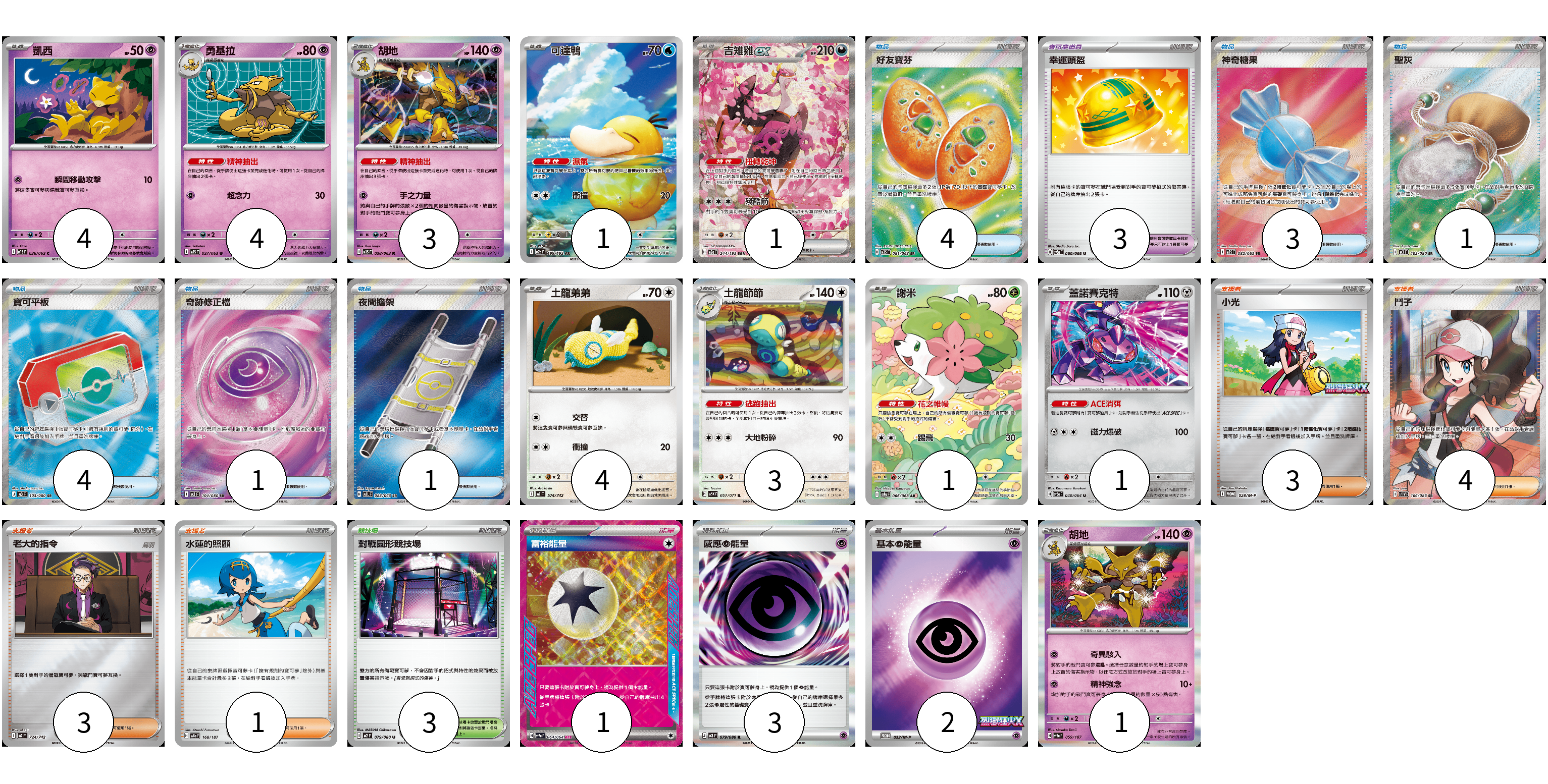 牌組構築方案 以此牌組為基礎新構築牌組 顯示卡面 顯示列表 寶可夢卡(23) 4 4 3 1 1 4 3 1 1 1 寶可夢道具(3) 3 物品卡(14) 4 3 1 4 1 1 支援者卡(11) 3 4 3 1 競技場卡(3) 3 能量卡(6) 1 3 2 寶可夢卡(23) 卡牌名稱 張數 卡牌名稱 張數 凱西 M1S 036/063 04 勇基拉 M1S 037/063 04 胡地 M1S 038/063 03 可達鴨 M2a 199/193 01 吉雉雞ex M2a 244/193 01 土龍弟弟 MC 574/742 04 土龍節節 SV5K 057/071 03 謝米 SV9a 066/063 01 蓋諾賽克特 SV6a 040/064 01 胡地 SV8a 059/187 01 寶可夢道具(3) 卡牌名稱 張數 卡牌名稱 張數 幸運頭盔 SV5a 060/066 03 物品卡(14) 卡牌名稱 張數 卡牌名稱 張數 好友寶芬 M1S 081/063 04 神奇糖果 M1S 082/063 03 聖灰 M3 102/080 01 寶可平板 M3 103/080 04 奇跡修正檔 M3 104/080 01 夜間擔架 M1L 083/063 01 支援者卡(11) 卡牌名稱 張數 卡牌名稱 張數 小光 M-P 028/M-P 03 鬥子 SV11W 166/086 04 老大的指令 MC 724/742 03 水蓮的照顧 SV8a 168/187 01 競技場卡(3) 卡牌名稱 張數 卡牌名稱 張數 對戰圓形競技場 M2 079/080 03 能量卡(6) 卡牌名稱 張數 卡牌名稱 張數 富裕能量 SV7a 064/064 01 感應【超】能量 M3 079/080 03 基本【超】能量 M-P 033/M-P 02 以此牌組為基礎新構築牌組 牌組編碼 YSkmHG-TSGnBV-SLDyNG copy 列印牌組單 牌組編碼已複製 分享至SNS