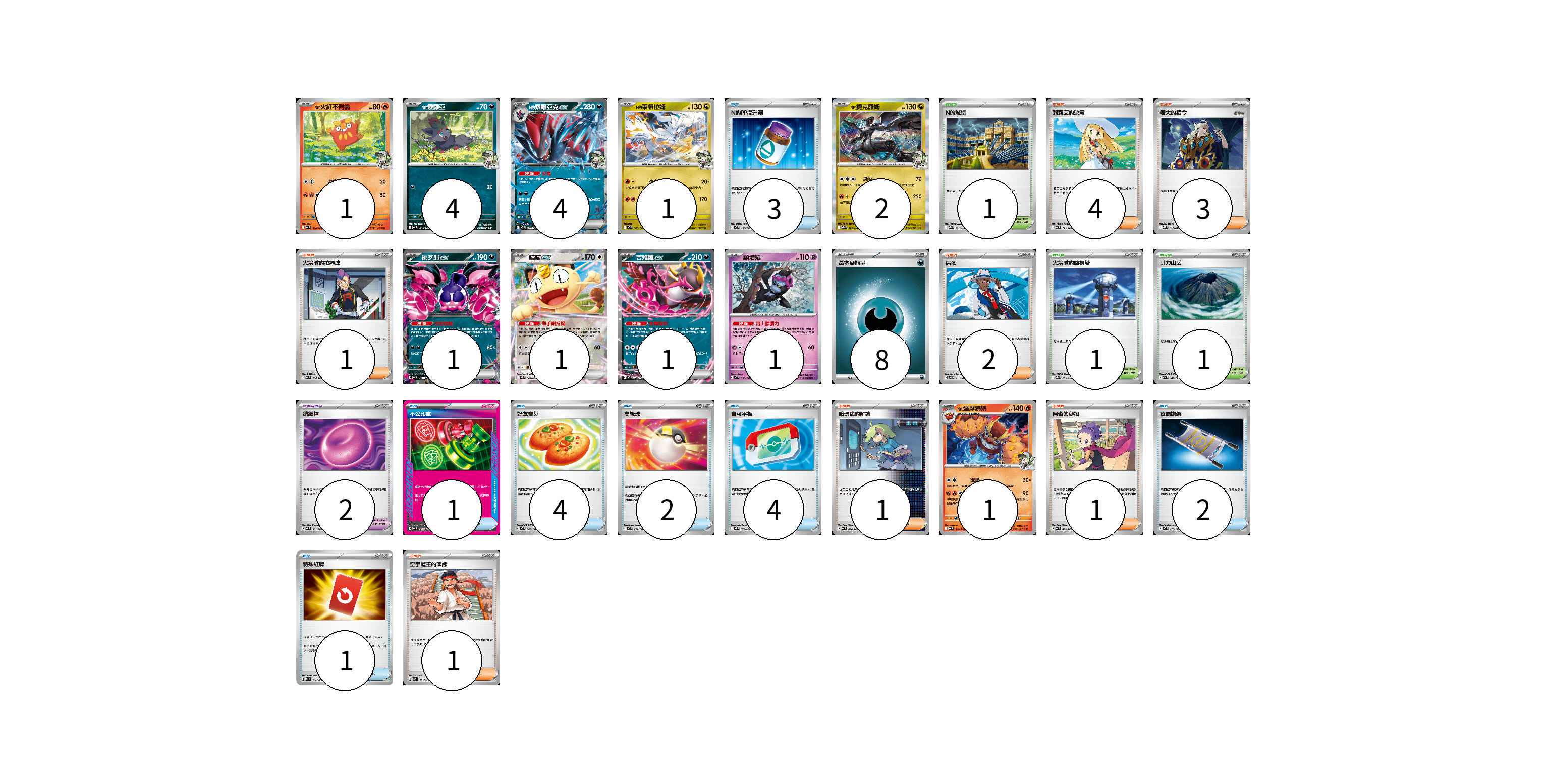 牌組構築方案 以此牌組為基礎新構築牌組 顯示卡面 顯示列表 寶可夢卡(17) 1 4 4 1 2 1 1 1 1 1 寶可夢道具(2) 2 物品卡(17) 3 1 4 2 4 2 1 支援者卡(13) 4 3 1 2 1 1 1 競技場卡(3) 1 1 1 能量卡(8) 8 寶可夢卡(17) 卡牌名稱 張數 卡牌名稱 張數 N的火紅不倒翁 MC 118/742 01 N的索羅亞 MC 469/742 04 N的索羅亞克ex MC 470/742 04 N的萊希拉姆 MC 545/742 01 N的捷克羅姆 M2a 129/193 02 桃歹郎ex MC 491/742 01 喵喵ex M3 061/080 01 吉雉雞ex MC 489/742 01 願增猿 MC 358/742 01 N的達摩狒狒 MC 119/742 01 寶可夢道具(2) 卡牌名稱 張數 卡牌名稱 張數 鎖鏈糬 MC 681/742 02 物品卡(17) 卡牌名稱 張數 卡牌名稱 張數 N的PP提升劑 MC 635/742 03 不公印章 MC 633/742 01 好友寶芬 MC 648/742 04 高級球 MC 651/742 02 寶可平板 M3 070/080 04 夜間擔架 MC 670/742 02 特殊紅牌 M4 072/083 01 支援者卡(13) 卡牌名稱 張數 卡牌名稱 張數 莉莉艾的決意 MC 729/742 04 老大的指令 MBD 020/022 03 火箭隊的拉姆達 MC 734/742 01 席藍 SV8 102/106 02 暗碼迷的解讀 MC 698/742 01 阿杏的秘招 MC 699/742 01 空手道王的演練 SVM 146/175 01 競技場卡(3) 卡牌名稱 張數 卡牌名稱 張數 N的城堡 M2a 181/193 01 火箭隊的監視塔 M2a 189/193 01 引力山岳 M2a 183/193 01 能量卡(8) 卡牌名稱 張數 卡牌名稱 張數 基本【惡】能量 MC DAR 08 以此牌組為基礎新構築牌組 牌組編碼 YSyAjr-trMzMe-gUJyym copy 列印牌組單 牌組編碼已複製 分享至SNS