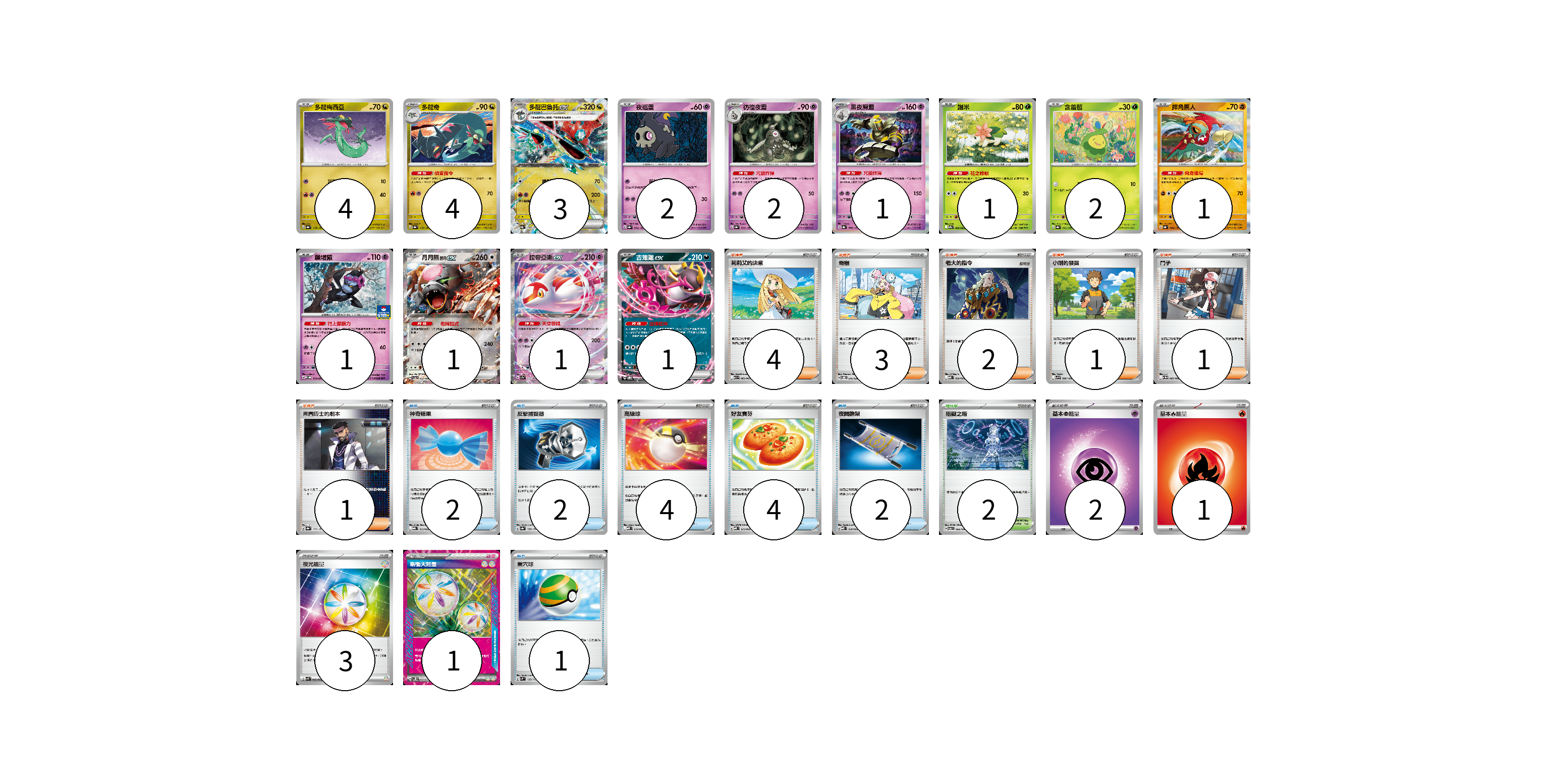 牌組構築方案 以此牌組為基礎新構築牌組 顯示卡面 顯示列表 寶可夢卡(24) 4 4 3 2 2 1 1 2 1 1 1 1 1 物品卡(15) 2 2 4 4 2 1 支援者卡(12) 4 3 2 1 1 1 競技場卡(2) 2 能量卡(7) 2 1 3 1 寶可夢卡(24) 卡牌名稱 張數 卡牌名稱 張數 多龍梅西亞 SV8a 118/187 04 多龍奇 SV8a 119/187 04 多龍巴魯托ex SV8a 120/187 03 夜巡靈 SV8a 064/187 02 彷徨夜靈 SV8a 065/187 02 黑夜魔靈 SV8a 066/187 01 謝米 SV9a 006/063 01 含羞苞 SV8a 001/187 02 摔角鷹人 SV8a 084/187 01 願增猿 M-P 014/M-P 01 月月熊 赫月 ex SV5a 052/066 01 拉帝亞斯ex SV7a 019/064 01 吉雉雞ex SVOD 004/020 01 物品卡(15) 卡牌名稱 張數 卡牌名稱 張數 神奇糖果 MBG 013/022 02 反擊捕捉器 SV8a 139/187 02 高級球 MBD 014/022 04 好友寶芬 MBD 013/022 04 夜間擔架 MBD 016/022 02 巢穴球 SVM 133/175 01 支援者卡(12) 卡牌名稱 張數 卡牌名稱 張數 莉莉艾的決意 M1L 062/063 04 奇樹 SVOD 016/020 03 老大的指令 MBD 020/022 02 小剛的發掘 SV9 096/100 01 鬥子 SV11W 085/086 01 弗圖博士的劇本 SV8a 175/187 01 競技場卡(2) 卡牌名稱 張數 卡牌名稱 張數 阻礙之塔 SV6 100/101 02 能量卡(7) 卡牌名稱 張數 卡牌名稱 張數 基本【超】能量 MBD PSY 02 基本火能量 sv-p FIR 01 夜光能量 SVK 042/042 03 新衝天能量 SV5K 071/071 01 以此牌組為基礎新構築牌組 牌組編碼 YUquQW-YrvRyw-dDCYdw copy 列印牌組單 牌組編碼已複製 分享至SNS