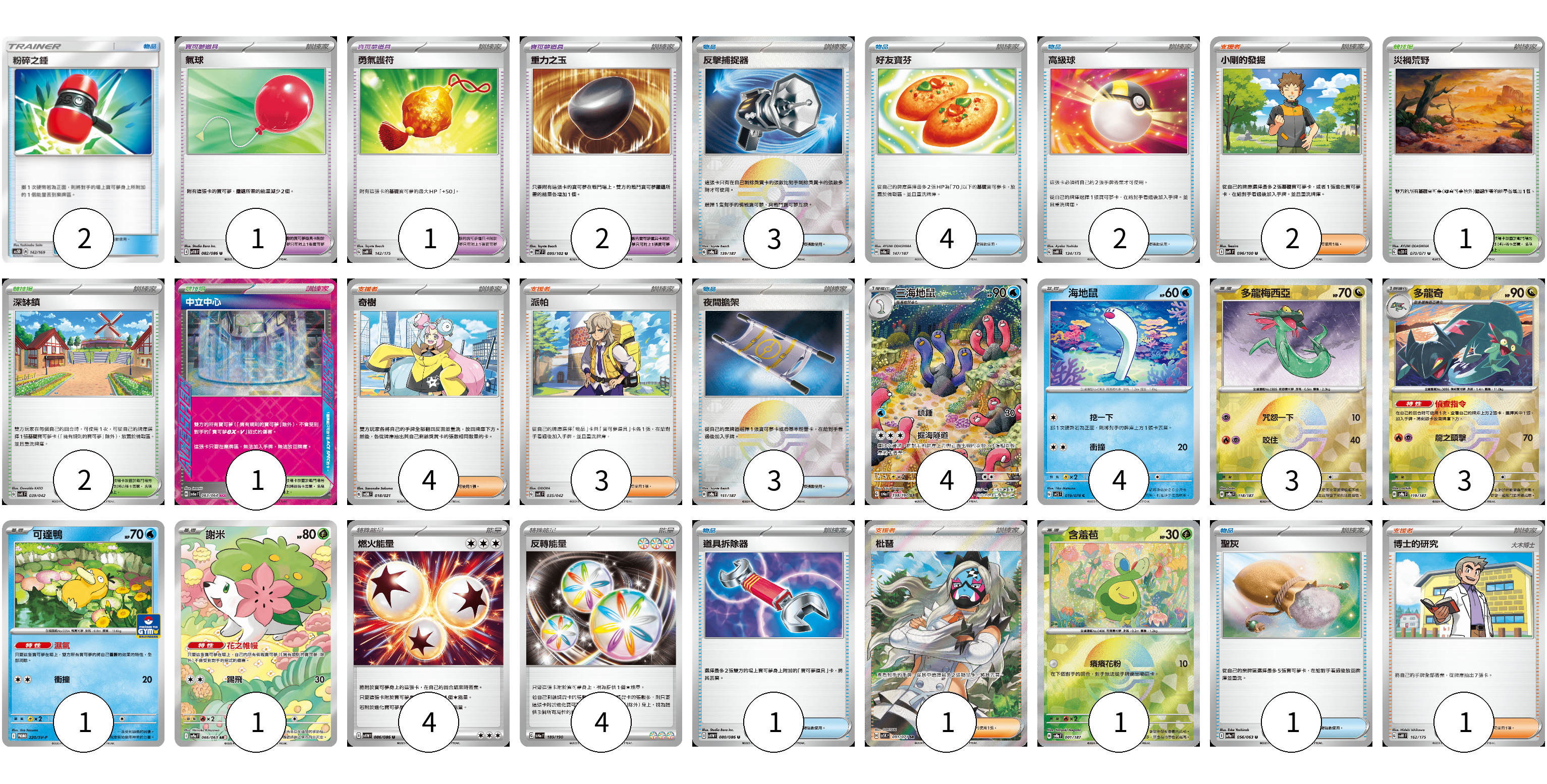 牌組構築方案 以此牌組為基礎新構築牌組 顯示卡面 顯示列表 寶可夢卡(17) 4 4 3 3 1 1 1 寶可夢道具(4) 1 1 2 物品卡(16) 2 3 4 2 3 1 1 支援者卡(11) 2 4 3 1 1 競技場卡(4) 1 2 1 能量卡(8) 4 4 寶可夢卡(17) 卡牌名稱 張數 卡牌名稱 張數 三海地鼠 SV4a 338/190 04 海地鼠 SV1S 019/078 04 多龍梅西亞 SV8a 118/187 03 多龍奇 SV8a 119/187 03 可達鴨 SV-P 220/SV-P 01 謝米 SV9a 066/063 01 含羞苞 SV8a 001/187 01 寶可夢道具(4) 卡牌名稱 張數 卡牌名稱 張數 氣球 SV11B 082/086 01 勇氣護符 SVM 142/175 01 重力之玉 SV7 095/102 02 物品卡(16) 卡牌名稱 張數 卡牌名稱 張數 粉碎之錘 AS5D 142/169 02 反擊捕捉器 SV8a 139/187 03 好友寶芬 SV8a 147/187 04 高級球 SVM 134/175 02 夜間擔架 SV8a 151/187 03 道具拆除器 SV11W 080/086 01 聖灰 SV9a 056/063 01 支援者卡(11) 卡牌名稱 張數 卡牌名稱 張數 小剛的發掘 SV9 096/100 02 奇樹 SVOM 018/021 04 派帕 SVK 035/042 03 枇琶 SV5K 091/071 01 博士的研究 SVM 162/175 01 競技場卡(4) 卡牌名稱 張數 卡牌名稱 張數 災禍荒野 SV2D 070/071 01 深缽鎮 SVK 039/042 02 中立中心 SV6a 063/064 01 能量卡(8) 卡牌名稱 張數 卡牌名稱 張數 燃火能量 SV11W 086/086 04 反轉能量 SV4a 189/190 04 以此牌組為基礎新構築牌組 牌組編碼 YUrucY-Flzanc-LuOiSM copy 列印牌組單 牌組編碼已複製 分享至SNS