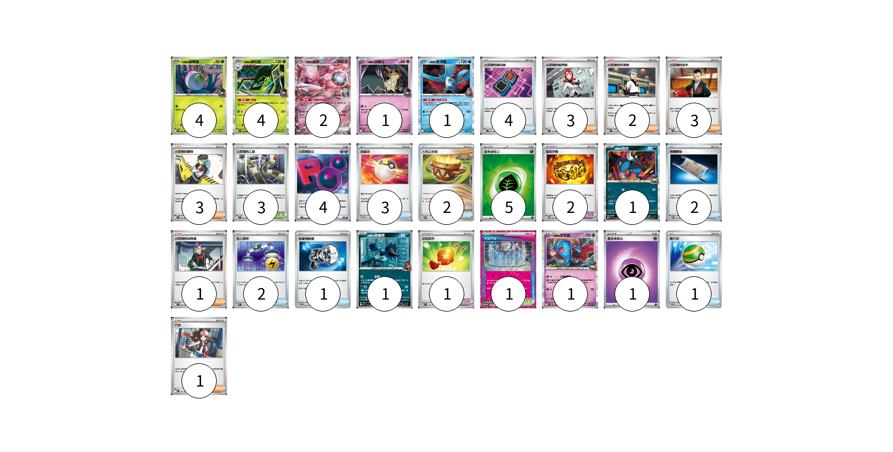 牌組構築方案 以此牌組為基礎新構築牌組 顯示卡面 顯示列表 寶可夢卡(15) 4 4 2 1 1 1 1 1 寶可夢道具(3) 2 1 物品卡(15) 4 3 2 2 2 1 1 支援者卡(13) 3 2 3 3 1 1 競技場卡(4) 3 1 能量卡(10) 4 5 1 寶可夢卡(15) 卡牌名稱 張數 卡牌名稱 張數 <火箭隊的>團珠蛛 SV10 008/098 04 <火箭隊的>操陷蛛 SV10 009/098 04 <火箭隊的>超夢ex SV10 039/098 02 <火箭隊的>謎擬Q SV10 042/098 01 <火箭隊的>急凍鳥 SV10 022/098 01 <火箭隊的>狃拉 SV10 072/098 01 <火箭隊的>黑暗鴉 SV10 071/098 01 <火箭隊的>果然翁 SV10 040/098 01 寶可夢道具(3) 卡牌名稱 張數 卡牌名稱 張數 猛攻手鐲 SV11W 082/086 02 勇氣護符 SVM 142/175 01 物品卡(15) 卡牌名稱 張數 卡牌名稱 張數 火箭隊的接收器 SV10 090/098 04 高級球 SVOD 012/020 03 大地之容器 SV8a 143/187 02 夜間擔架 MBD 016/022 02 能量轉移 SVM 127/175 02 反擊捕捉器 SVTS 009/022 01 巢穴球 SVTG 012/019 01 支援者卡(13) 卡牌名稱 張數 卡牌名稱 張數 火箭隊的雅典娜 SV10 091/098 03 火箭隊的阿波羅 SV10 092/098 02 火箭隊的坂木 SV10 093/098 03 火箭隊的蘭斯 SV10 095/098 03 火箭隊的拉姆達 SV10 094/098 01 鬥子 M2a 172/193 01 競技場卡(4) 卡牌名稱 張數 卡牌名稱 張數 火箭隊的工廠 SV10 097/098 03 中立中心 SV8a 184/187 01 能量卡(10) 卡牌名稱 張數 卡牌名稱 張數 火箭隊能量 SV10 098/098 04 基本【草】能量 SVM GRA 05 基本【超】能量 MBD PSY 01 以此牌組為基礎新構築牌組 牌組編碼 YWhMql-OpwUbi-zetkkB copy 列印牌組單 牌組編碼已複製 分享至SNS