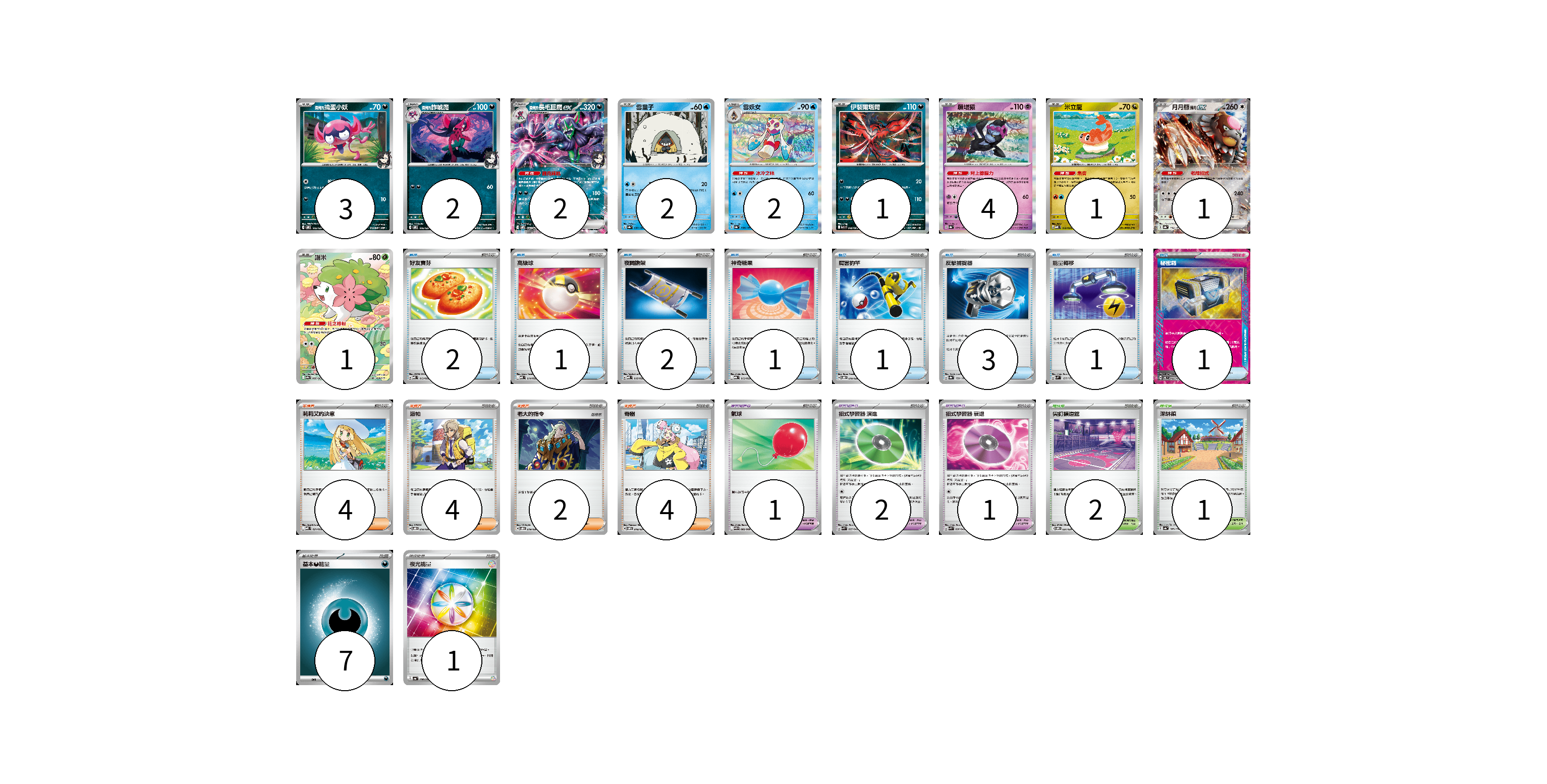 牌組構築方案 以此牌組為基礎新構築牌組 顯示卡面 顯示列表 寶可夢卡(19) 3 2 2 2 2 1 4 1 1 1 寶可夢道具(4) 1 2 1 物品卡(12) 2 1 2 1 1 3 1 1 支援者卡(14) 4 4 2 4 競技場卡(3) 2 1 能量卡(8) 7 1 寶可夢卡(19) 卡牌名稱 張數 卡牌名稱 張數 <瑪俐的>搗蛋小妖 SVOM 005/021 03 <瑪俐的>詐唬魔 SVOM 006/021 02 <瑪俐的>長毛巨魔ex SVOM 007/021 02 雪童子 SV8a 037/187 02 雪妖女 SV8a 038/187 02 伊裴爾塔爾 M1L 040/063 01 願增猿 SV8a 075/187 04 米立龍 MBD 010/022 01 月月熊 赫月ex SV8a 134/187 01 謝米 SV9a 066/063 01 寶可夢道具(4) 卡牌名稱 張數 卡牌名稱 張數 氣球 SV11B 082/086 01 招式學習器 演進 SVK 025/042 02 招式學習器 衰退 SVK 026/042 01 物品卡(12) 卡牌名稱 張數 卡牌名稱 張數 好友寶芬 MBD 013/022 02 高級球 MBD 014/022 01 夜間擔架 MBD 016/022 02 神奇糖果 MBG 013/022 01 厲害釣竿 SVOD 010/020 01 反擊捕捉器 SV8a 139/187 03 能量轉移 SVM 127/175 01 秘密箱 SV6 092/101 01 支援者卡(14) 卡牌名稱 張數 卡牌名稱 張數 莉莉艾的決意 MBD 021/022 04 派帕 SVOD 018/020 04 老大的指令 SVOD 019/020 02 奇樹 SVOM 018/021 04 競技場卡(3) 卡牌名稱 張數 卡牌名稱 張數 尖釘鎮道館 SVOM 021/021 02 深缽鎮 SV4a 185/190 01 能量卡(8) 卡牌名稱 張數 卡牌名稱 張數 基本【惡】能量 M-P DAR 07 夜光能量 SV4a 190/190 01 以此牌組為基礎新構築牌組 牌組編碼 YXnLrB-BaPPdF-CMxEHf copy 列印牌組單 牌組編碼已複製 分享至SNS