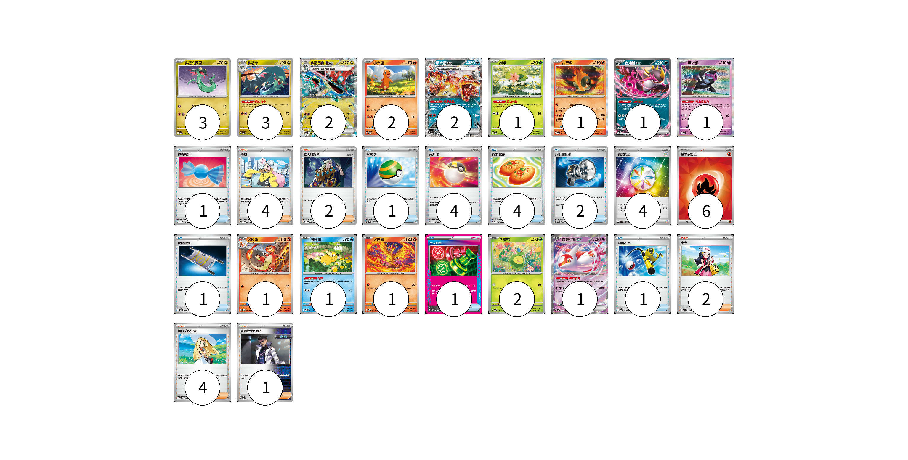 牌組構築方案 以此牌組為基礎新構築牌組 顯示卡面 顯示列表 寶可夢卡(22) 3 3 2 2 2 1 1 1 1 1 1 1 2 1 物品卡(15) 1 1 4 4 2 1 1 1 支援者卡(13) 4 2 2 4 1 能量卡(10) 4 6 寶可夢卡(22) 卡牌名稱 張數 卡牌名稱 張數 多龍梅西亞 SV8a 118/187 03 多龍奇 SV8a 119/187 03 多龍巴魯托ex SV8a 120/187 02 小火龍 SVTL 001/021 02 噴火龍ex SV4a 115/190 02 謝米 SV9a 006/063 01 古玉魚 SV4K 016/066 01 吉雉雞ex SVOD 004/020 01 願增猿 SV8a 075/187 01 火恐龍 M2 012/080 01 可達鴨 M2a 032/193 01 火焰鳥 M2 014/080 01 含羞苞 M2a 011/193 02 拉帝亞斯ex M2a 075/193 01 物品卡(15) 卡牌名稱 張數 卡牌名稱 張數 神奇糖果 SVOD 013/020 01 巢穴球 SVM 133/175 01 高級球 SVOD 012/020 04 好友寶芬 SVOD 011/020 04 反擊捕捉器 SV8a 139/187 02 夜間擔架 SVOM 016/021 01 不公印章 MBD 011/022 01 厲害釣竿 SVOD 010/020 01 支援者卡(13) 卡牌名稱 張數 卡牌名稱 張數 奇樹 SVOD 016/020 04 老大的指令 SVOD 019/020 02 小光 M2 077/080 02 莉莉艾的決意 M2a 175/193 04 弗圖博士的劇本 SV8a 175/187 01 能量卡(10) 卡牌名稱 張數 卡牌名稱 張數 夜光能量 SVK 042/042 04 基本【火】能量 SVK FIR 06 以此牌組為基礎新構築牌組 牌組編碼 YXqsmY-iejRLh-IrtUSA copy 列印牌組單 牌組編碼已複製 分享至SNS