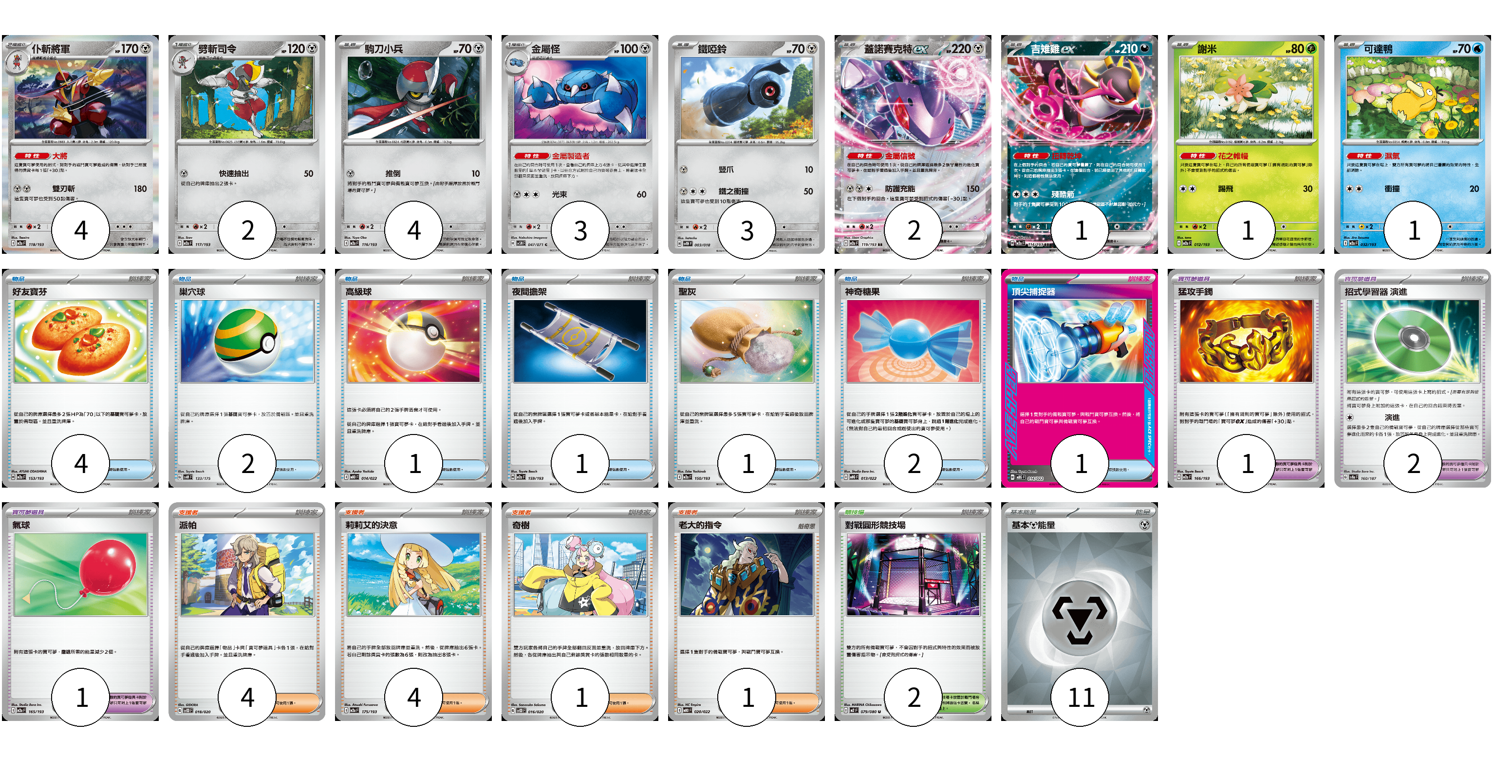 牌組構築方案 以此牌組為基礎新構築牌組 顯示卡面 顯示列表 寶可夢卡(21) 4 2 4 3 3 2 1 1 1 寶可夢道具(4) 1 2 1 物品卡(12) 4 2 1 1 1 2 1 支援者卡(10) 4 4 1 1 競技場卡(2) 2 能量卡(11) 11 寶可夢卡(21) 卡牌名稱 張數 卡牌名稱 張數 仆斬將軍 M2a 118/193 04 劈斬司令 M2a 117/193 02 駒刀小兵 M2a 116/193 04 金屬怪 SV5M 047/071 03 鐵啞鈴 SVTH 003/018 03 蓋諾賽克特ex M2a 119/193 02 吉雉雞ex M2a 114/193 01 謝米 M2a 012/193 01 可達鴨 M2a 032/193 01 寶可夢道具(4) 卡牌名稱 張數 卡牌名稱 張數 猛攻手鐲 M2a 166/193 01 招式學習器 演進 SV8a 160/187 02 氣球 M2a 165/193 01 物品卡(12) 卡牌名稱 張數 卡牌名稱 張數 好友寶芬 M2a 153/193 04 巢穴球 SVM 133/175 02 高級球 MBD 014/022 01 夜間擔架 M2a 159/193 01 聖灰 M2a 150/193 01 神奇糖果 MBG 013/022 02 頂尖捕捉器 MBG 014/022 01 支援者卡(10) 卡牌名稱 張數 卡牌名稱 張數 派帕 SVOD 018/020 04 莉莉艾的決意 M2a 175/193 04 奇樹 SVOD 016/020 01 老大的指令 MBD 020/022 01 競技場卡(2) 卡牌名稱 張數 卡牌名稱 張數 對戰圓形競技場 M2 079/080 02 能量卡(11) 卡牌名稱 張數 卡牌名稱 張數 基本【鋼】能量 SVOD MET 11 以此牌組為基礎新構築牌組 牌組編碼 YYssYX-BKawVD-PBCiQf copy 列印牌組單 牌組編碼已複製 分享至SNS