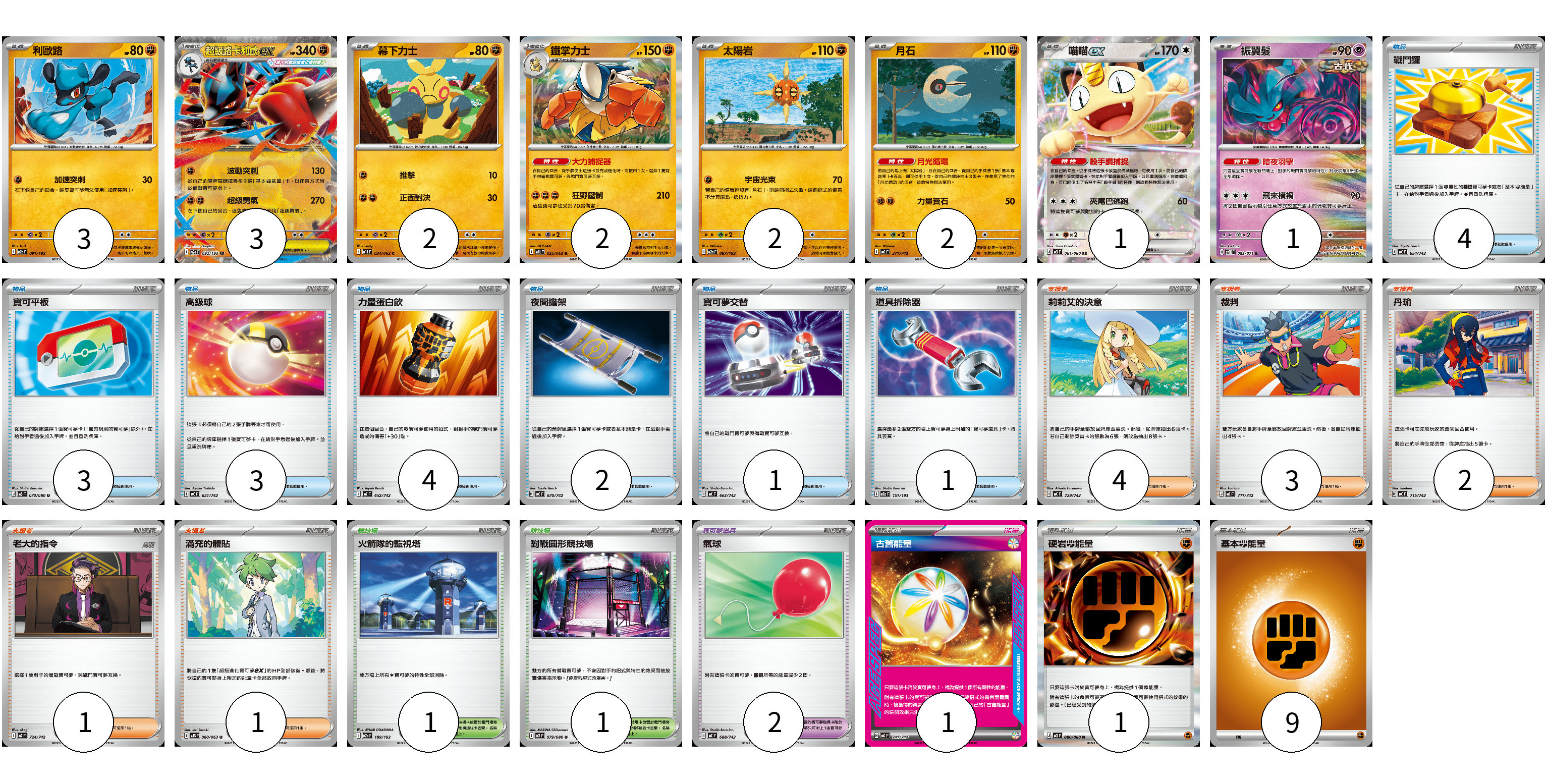 牌組構築方案 以此牌組為基礎新構築牌組 顯示卡面 顯示列表 寶可夢卡(16) 3 3 2 2 2 2 1 1 寶可夢道具(2) 2 物品卡(18) 4 3 3 4 2 1 1 支援者卡(11) 4 3 2 1 1 競技場卡(2) 1 1 能量卡(11) 1 1 9 寶可夢卡(16) 卡牌名稱 張數 卡牌名稱 張數 利歐路 M2a 091/193 03 超級路卡利歐ex M2a 092/193 03 幕下力士 M1L 024/063 02 鐵掌力士 M1L 025/063 02 太陽岩 M2a 087/193 02 月石 MC 371/742 02 喵喵ex M3 061/080 01 振翼髮 SV5K 033/071 01 寶可夢道具(2) 卡牌名稱 張數 卡牌名稱 張數 氣球 MC 688/742 02 物品卡(18) 卡牌名稱 張數 卡牌名稱 張數 戰鬥鑼 MC 654/742 04 寶可平板 M3 070/080 03 高級球 MC 651/742 03 力量蛋白飲 MC 652/742 04 夜間擔架 MC 670/742 02 寶可夢交替 MC 663/742 01 道具拆除器 M2a 151/193 01 支援者卡(11) 卡牌名稱 張數 卡牌名稱 張數 莉莉艾的決意 MC 729/742 04 裁判 MC 711/742 03 丹瑜 MC 715/742 02 老大的指令 MC 724/742 01 滿充的體貼 M1S 060/063 01 競技場卡(2) 卡牌名稱 張數 卡牌名稱 張數 火箭隊的監視塔 M2a 189/193 01 對戰圓形競技場 M2 079/080 01 能量卡(11) 卡牌名稱 張數 卡牌名稱 張數 古舊能量 MC 741/742 01 硬岩【鬥】能量 M3 080/080 01 基本【鬥】能量 MC FIG 09 以此牌組為基礎新構築牌組 牌組編碼 YZrzZj-dCfvOa-XOOjcT copy 列印牌組單 牌組編碼已複製 分享至SNS