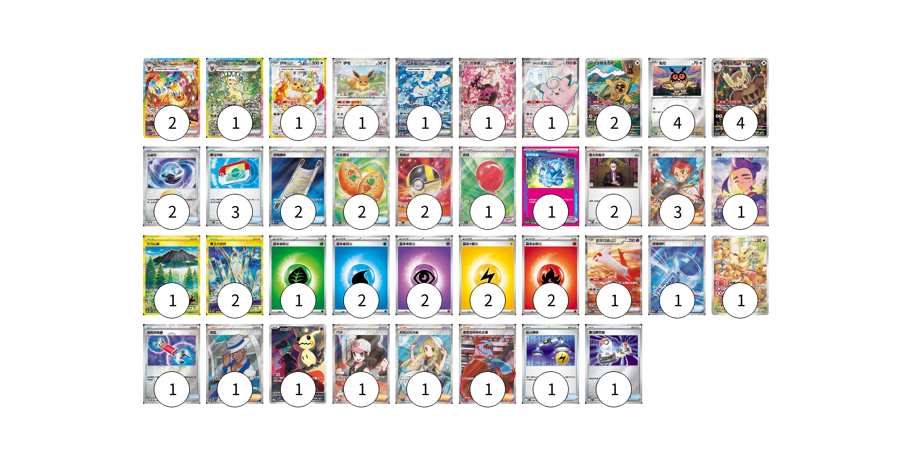 牌組構築方案 以此牌組為基礎新構築牌組 顯示卡面 顯示列表 寶可夢卡(21) 2 1 1 1 1 1 1 2 4 4 1 1 1 寶可夢道具(2) 1 1 物品卡(15) 2 3 2 2 2 1 1 1 1 支援者卡(10) 2 3 1 1 1 1 1 競技場卡(3) 1 2 能量卡(9) 1 2 2 2 2 寶可夢卡(21) 卡牌名稱 張數 卡牌名稱 張數 火伊布ex SV8a 202/187 02 葉伊布ex SV8a 200/187 01 伊布ex SV8a 224/187 01 伊布 SV8a 125/187 01 厄鬼椪 水井面具ex SV6 127/101 01 吉雉雞ex M2a 244/193 01 莉莉艾的皮皮ex SV9 115/100 01 旋轉洛托姆 M2a 213/193 02 咕咕 M2a 137/193 04 貓頭夜鷹 SV7 114/102 04 拉帝亞斯ex SV7a 087/064 01 伊布 SV5a 078/066 01 <火箭隊的>謎擬Q M2a 205/193 01 寶可夢道具(2) 卡牌名稱 張數 卡牌名稱 張數 氣球 M1L 084/063 01 璀璨結晶 MC 680/742 01 物品卡(15) 卡牌名稱 張數 卡牌名稱 張數 太晶珠 SV8a 145/187 02 寶可平板 MC 662/742 03 夜間擔架 M1L 083/063 02 好友寶芬 M1S 081/063 02 高級球 M2a 216/193 02 玻璃喇叭 M2a 215/193 01 道具拆除器 SV11W 080/086 01 能量轉移 MC 638/742 01 寶可夢交替 MC 663/742 01 支援者卡(10) 卡牌名稱 張數 卡牌名稱 張數 老大的指令 MC 724/742 02 赤松 SV7 123/102 03 烏栗 SV8a 230/187 01 席藍 SV8 127/106 01 鬥子 SV11W 166/086 01 莉莉艾的決意 M1L 086/063 01 庫瑟洛斯奇的企圖 SV6a 086/064 01 競技場卡(3) 卡牌名稱 張數 卡牌名稱 張數 引力山岳 SV8 138/106 01 零之大空洞 SV7 135/102 02 能量卡(9) 卡牌名稱 張數 卡牌名稱 張數 基本【草】能量 MC GRA 01 基本【水】能量 MC WAT 02 基本【超】能量 MC PSY 02 基本【雷】能量 MC LIG 02 基本【火】能量 MC FIR 02 以此牌組為基礎新構築牌組 牌組編碼 YddNdc-GQcJFJ-SsQMEf copy 列印牌組單 牌組編碼已複製 分享至SNS