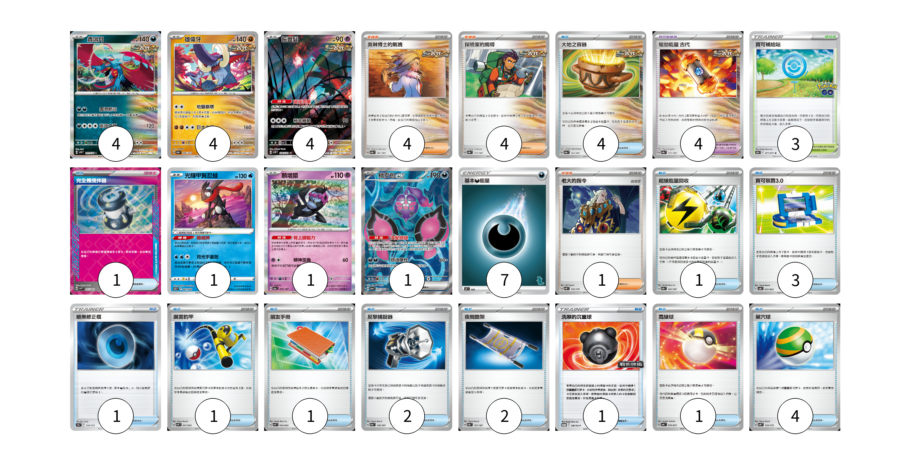 牌組構築方案 以此牌組為基礎新構築牌組 顯示卡面 顯示列表 寶可夢卡(15) 4 4 4 1 1 1 寶可夢道具(4) 4 物品卡(22) 4 1 1 3 1 1 1 2 2 1 1 4 支援者卡(9) 4 4 1 競技場卡(3) 3 能量卡(7) 7 寶可夢卡(15) 卡牌名稱 張數 卡牌名稱 張數 轟鳴月 SV5K 051/071 04 雄偉牙 SV8a 086/187 04 振翼髮 SV5K 076/071 04 光輝甲賀忍蛙 SVTS 001/022 01 願增猿 SV8a 075/187 01 桃歹郎ex SV6a 082/064 01 寶可夢道具(4) 卡牌名稱 張數 卡牌名稱 張數 驅勁能量 古代 SV8a 157/187 04 物品卡(22) 卡牌名稱 張數 卡牌名稱 張數 大地之容器 SV8a 143/187 04 完全體攪拌器 SVK 017/042 01 超級能量回收 SV8a 141/187 01 寶可裝置3.0 SVAM 017/023 03 暗黑修正檔 S12a 135/172 01 厲害釣竿 SVK 011/042 01 朋友手冊 SVK 014/042 01 反擊捕捉器 SV8a 139/187 02 夜間擔架 SV8a 151/187 02 洗翠的沉重球 SV-P 138/SV-P 01 高級球 SVHK 013/022 01 巢穴球 SVM 133/175 04 支援者卡(9) 卡牌名稱 張數 卡牌名稱 張數 奧琳博士的氣魄 SV8a 167/187 04 探險家的嚮導 SV8a 172/187 04 老大的指令 SVM 172/175 01 競技場卡(3) 卡牌名稱 張數 卡牌名稱 張數 寶可補給站 S10b 071/071 03 能量卡(7) 卡牌名稱 張數 卡牌名稱 張數 基本惡能量 SH DAR 07 以此牌組為基礎新構築牌組 牌組編碼 YjlMbU-AveXct-VgvjZG copy 列印牌組單 牌組編碼已複製 分享至SNS