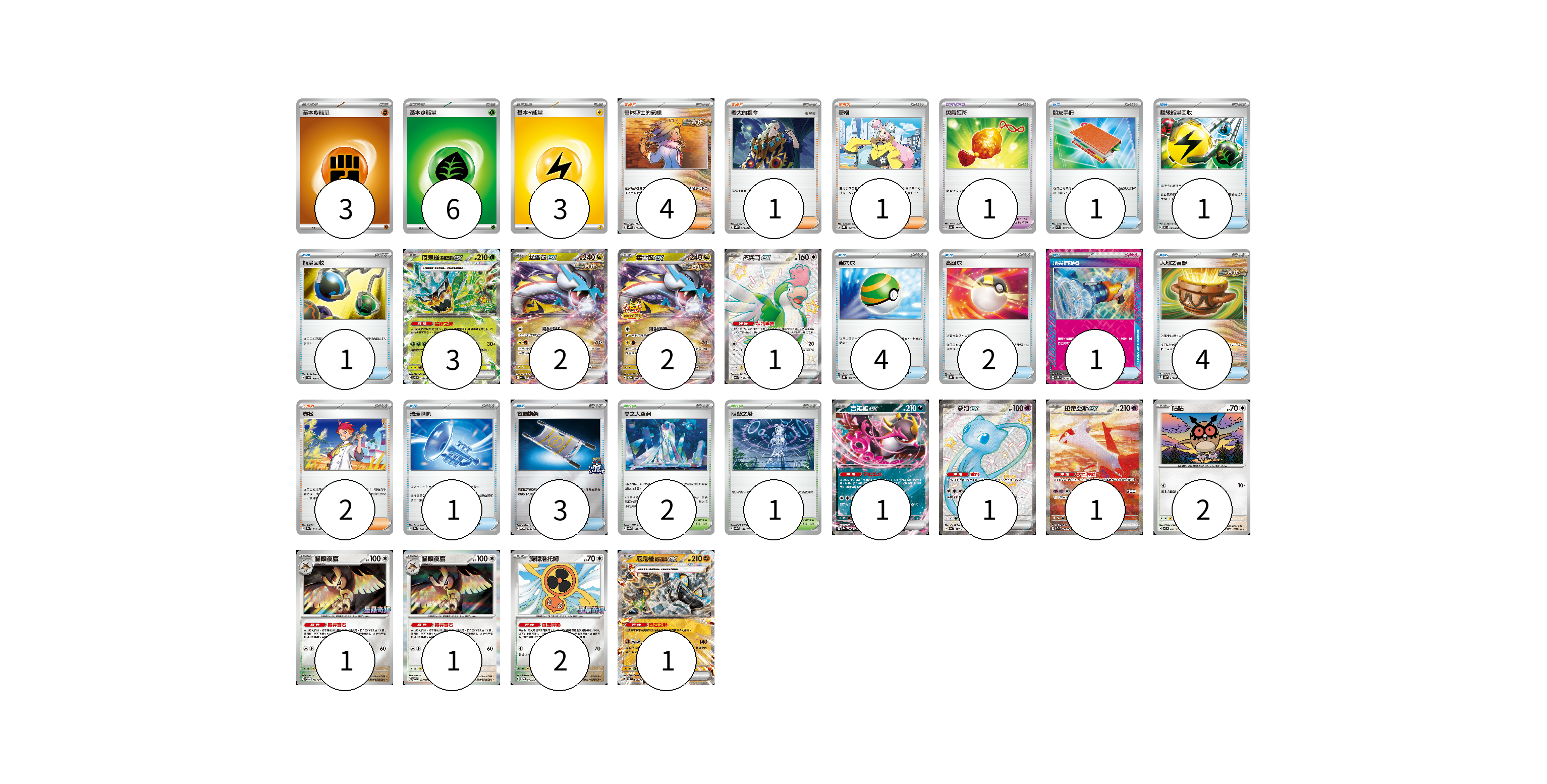 牌組構築方案 以此牌組為基礎新構築牌組 顯示卡面 顯示列表 寶可夢卡(18) 3 2 2 1 1 1 1 2 1 1 2 1 寶可夢道具(1) 1 物品卡(18) 1 1 1 4 2 1 4 1 3 支援者卡(8) 4 1 1 2 競技場卡(3) 2 1 能量卡(12) 3 6 3 寶可夢卡(18) 卡牌名稱 張數 卡牌名稱 張數 厄鬼椪 碧草面具ex SV6 016/101 03 猛雷鼓ex SV5K 053/071 02 猛雷鼓ex SV-P 081/SV-P 02 怒鸚哥ex SV4a 337/190 01 吉雉雞ex SV8a 104/187 01 夢幻ex SV4a 327/190 01 拉帝亞斯ex SV7a 087/064 01 咕咕 SV7 076/102 02 貓頭夜鷹 SV-P 145/SV-P 01 貓頭夜鷹 SV7 077/102 01 旋轉洛托姆 SV-P 146/SV-P 02 厄鬼椪 礎石面具ex SV6 065/101 01 寶可夢道具(1) 卡牌名稱 張數 卡牌名稱 張數 勇氣護符 SV4a 169/190 01 物品卡(18) 卡牌名稱 張數 卡牌名稱 張數 朋友手冊 SV1S 069/078 01 超級能量回收 SVEL 009/020 01 能量回收 SVD 110/139 01 巢穴球 SVHK 012/022 04 高級球 SVHK 013/022 02 頂尖捕捉器 SV5M 062/071 01 大地之容器 SVHK 011/022 04 玻璃喇叭 SV8a 140/187 01 夜間擔架 SV-P 204/SV-P 03 支援者卡(8) 卡牌名稱 張數 卡牌名稱 張數 奧琳博士的氣魄 SVHK 017/022 04 老大的指令 SVHK 022/022 01 奇樹 SVHK 019/022 01 赤松 SV8a 163/187 02 競技場卡(3) 卡牌名稱 張數 卡牌名稱 張數 零之大空洞 SV8a 182/187 02 阻礙之塔 SV8a 181/187 01 能量卡(12) 卡牌名稱 張數 卡牌名稱 張數 基本【鬥】能量 SVHK FIG 03 基本【草】能量 SVF GRA 06 基本【雷】能量 SVF LIG 03 以此牌組為基礎新構築牌組 牌組編碼 YkJnDa-FwiOmD-bkDeAF copy 列印牌組單 牌組編碼已複製 分享至SNS