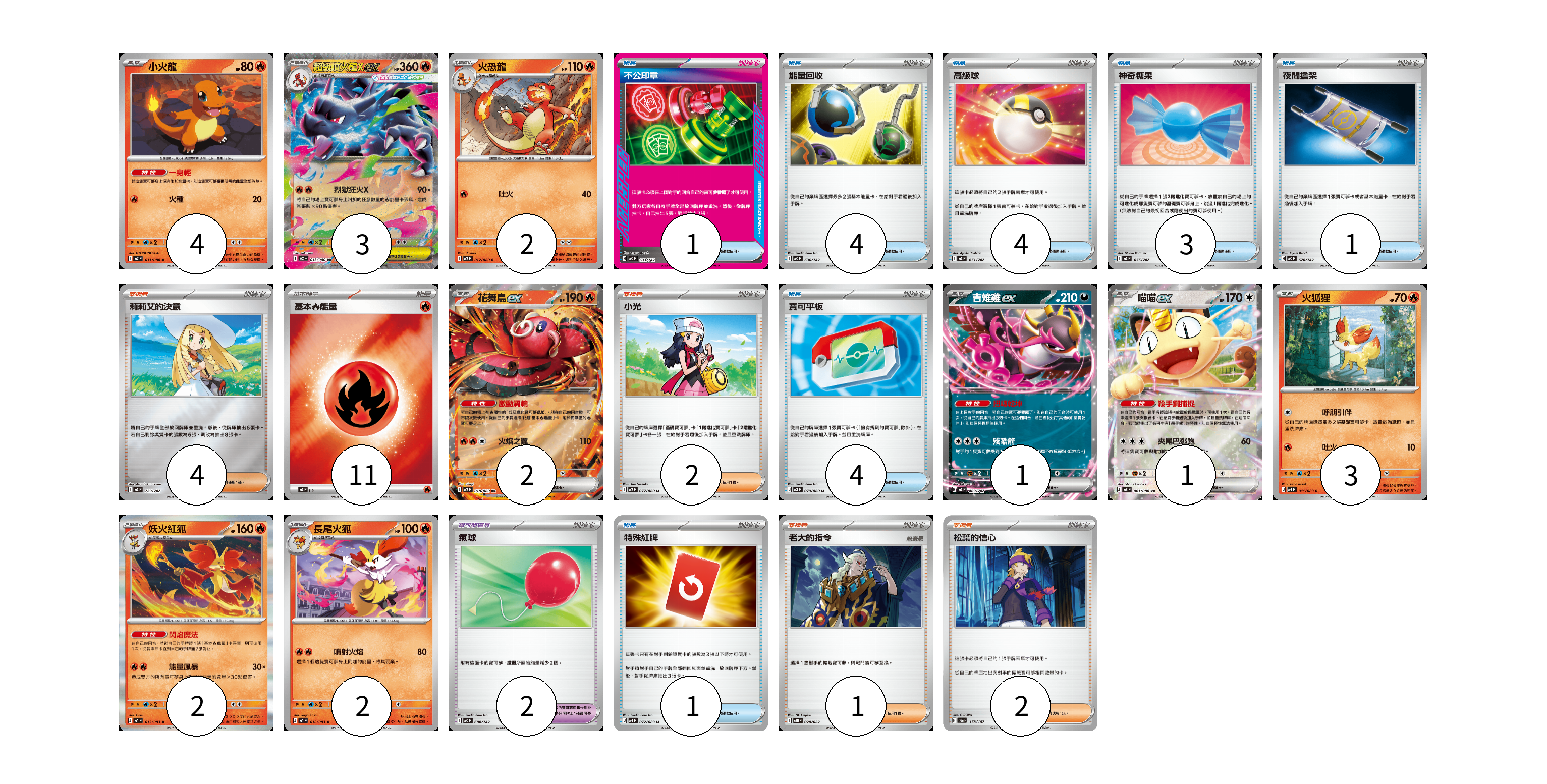 牌組構築方案 以此牌組為基礎新構築牌組 顯示卡面 顯示列表 寶可夢卡(20) 4 3 2 2 1 1 3 2 2 寶可夢道具(2) 2 物品卡(18) 1 4 4 3 1 4 1 支援者卡(9) 4 2 1 2 能量卡(11) 11 寶可夢卡(20) 卡牌名稱 張數 卡牌名稱 張數 小火龍 M2 011/080 04 超級噴火龍Xex M2 013/080 03 火恐龍 M2 012/080 02 花舞鳥ex M2 018/080 02 吉雉雞ex MC 489/742 01 喵喵ex M3 061/080 01 火狐狸 M4 011/083 03 妖火紅狐 M4 013/083 02 長尾火狐 M4 012/083 02 寶可夢道具(2) 卡牌名稱 張數 卡牌名稱 張數 氣球 MC 688/742 02 物品卡(18) 卡牌名稱 張數 卡牌名稱 張數 不公印章 MC 633/742 01 能量回收 MC 636/742 04 高級球 MC 651/742 04 神奇糖果 MC 655/742 03 夜間擔架 MC 670/742 01 寶可平板 M3 070/080 04 特殊紅牌 M4 072/083 01 支援者卡(9) 卡牌名稱 張數 卡牌名稱 張數 莉莉艾的決意 MC 729/742 04 小光 M2 077/080 02 老大的指令 MBD 020/022 01 松葉的信心 SV8a 178/187 02 能量卡(11) 卡牌名稱 張數 卡牌名稱 張數 基本【火】能量 MC FIR 11 以此牌組為基礎新構築牌組 牌組編碼 YnyXQy-DPDoDD-iVEOBB copy 列印牌組單 牌組編碼已複製 分享至SNS