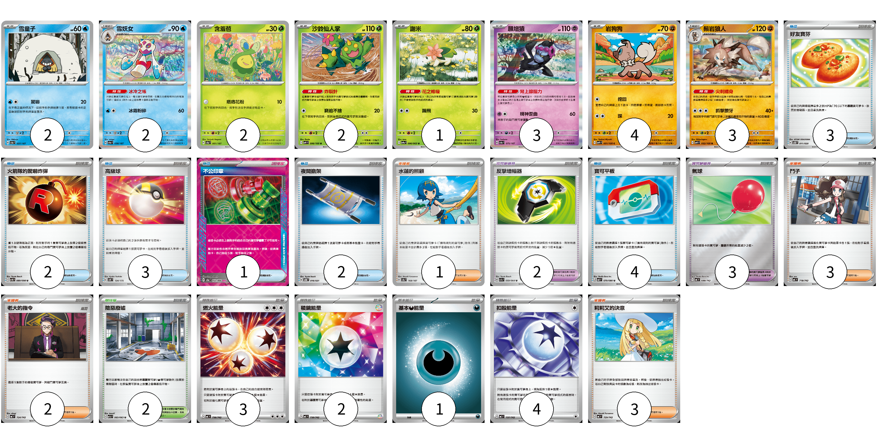 牌組構築方案 以此牌組為基礎新構築牌組 顯示卡面 顯示列表 寶可夢卡(19) 2 2 2 2 1 3 4 3 寶可夢道具(5) 2 3 物品卡(15) 3 2 3 1 2 4 支援者卡(9) 1 3 2 3 競技場卡(2) 2 能量卡(10) 3 2 1 4 寶可夢卡(19) 卡牌名稱 張數 卡牌名稱 張數 雪童子 SV8a 037/187 02 雪妖女 SV8a 038/187 02 含羞苞 SV8a 001/187 02 沙鈴仙人掌 SV9 006/100 02 謝米 SV9a 006/063 01 願增猿 SV8a 075/187 03 岩狗狗 SV9 051/100 04 鬃岩狼人 SV9 052/100 03 寶可夢道具(5) 卡牌名稱 張數 卡牌名稱 張數 反擊增幅器 SV7a 059/064 02 氣球 MC 688/742 03 物品卡(15) 卡牌名稱 張數 卡牌名稱 張數 好友寶芬 SVOD 011/020 03 火箭隊的驚嚇炸彈 SV10 089/098 02 高級球 SVM 134/175 03 不公印章 SV5a 053/066 01 夜間擔架 SVOM 016/021 02 寶可平板 M3 070/080 04 支援者卡(9) 卡牌名稱 張數 卡牌名稱 張數 水蓮的照顧 SV8a 168/187 01 鬥子 MC 718/742 03 老大的指令 MC 724/742 02 莉莉艾的決意 MC 729/742 03 競技場卡(2) 卡牌名稱 張數 卡牌名稱 張數 險惡廢墟 M1L 063/063 02 能量卡(10) 卡牌名稱 張數 卡牌名稱 張數 燃火能量 MC 736/742 03 稜鏡能量 MC 739/742 02 基本【惡】能量 MC DAR 01 扣殺能量 MC 737/742 04 以此牌組為基礎新構築牌組 牌組編碼 YoZsVT-ulrlbp-QLYGuK copy 列印牌組單 牌組編碼已複製 分享至SNS