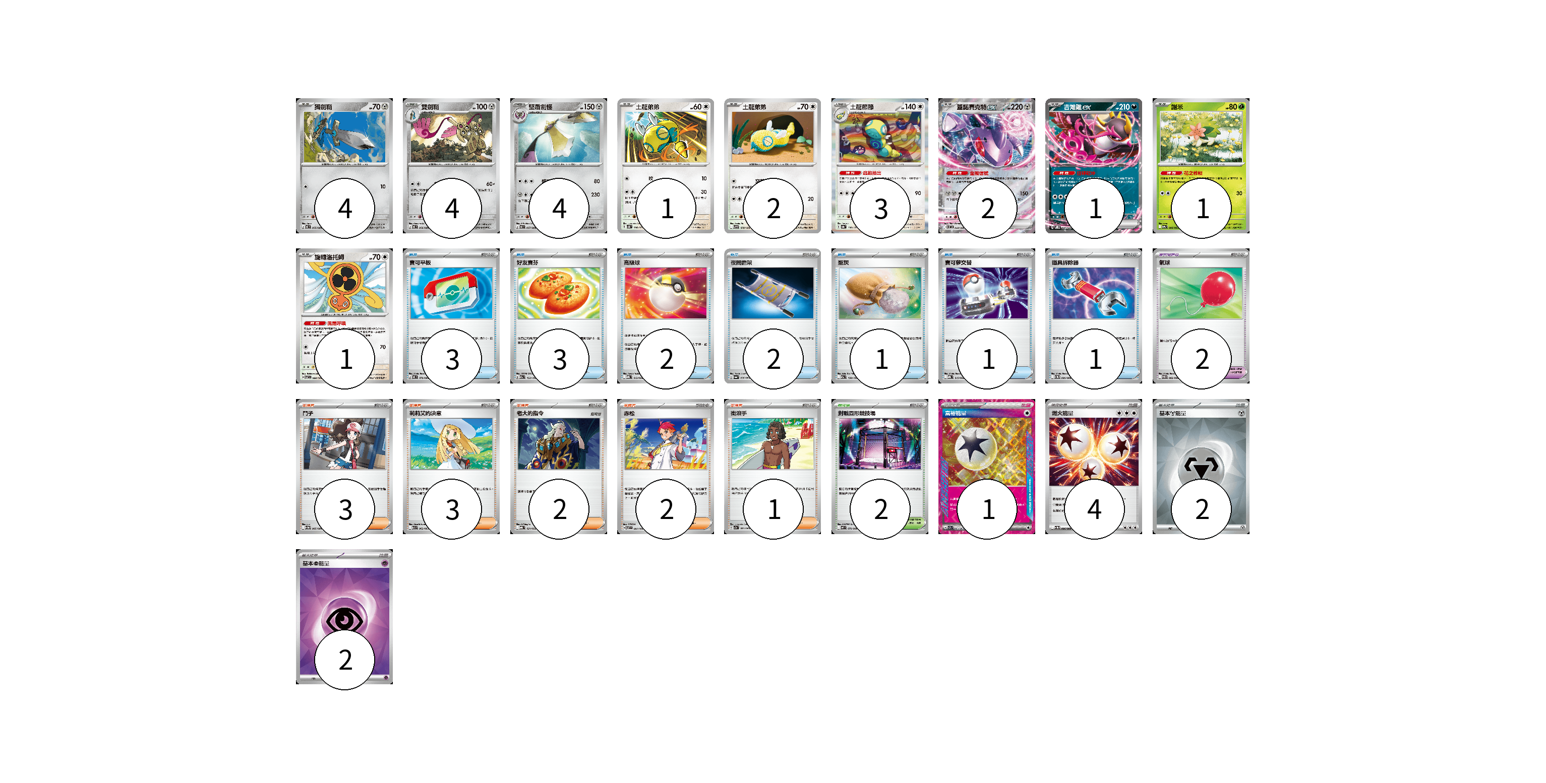 牌組構築方案 以此牌組為基礎新構築牌組 顯示卡面 顯示列表 寶可夢卡(23) 4 4 4 1 2 3 2 1 1 1 寶可夢道具(2) 2 物品卡(13) 3 3 2 2 1 1 1 支援者卡(11) 3 3 2 2 1 競技場卡(2) 2 能量卡(9) 1 4 2 2 寶可夢卡(23) 卡牌名稱 張數 卡牌名稱 張數 獨劍鞘 M3 055/080 04 雙劍鞘 M3 056/080 04 堅盾劍怪 M3 057/080 04 土龍弟弟 SV5K 056/071 01 土龍弟弟 SV9 078/100 02 土龍節節 SV8a 130/187 03 蓋諾賽克特ex SV11B 069/086 02 吉雉雞ex SVOD 004/020 01 謝米 SV9a 006/063 01 旋轉洛托姆 SV7 080/102 01 寶可夢道具(2) 卡牌名稱 張數 卡牌名稱 張數 氣球 SV11B 082/086 02 物品卡(13) 卡牌名稱 張數 卡牌名稱 張數 寶可平板 M3 070/080 03 好友寶芬 M2a 153/193 03 高級球 MBG 012/022 02 夜間擔架 SV6a 056/064 02 聖灰 M2a 150/193 01 寶可夢交替 MBG 015/022 01 道具拆除器 SV11W 080/086 01 支援者卡(11) 卡牌名稱 張數 卡牌名稱 張數 鬥子 SV11W 085/086 03 莉莉艾的決意 M1L 062/063 03 老大的指令 MBG 021/022 02 赤松 SV7 097/102 02 衝浪手 SV7a 061/064 01 競技場卡(2) 卡牌名稱 張數 卡牌名稱 張數 對戰圓形競技場 M2 079/080 02 能量卡(9) 卡牌名稱 張數 卡牌名稱 張數 富裕能量 SV7a 064/064 01 燃火能量 SV11W 086/086 04 基本【鋼】能量 SVOD MET 02 基本【超】能量 SVOD PSY 02 以此牌組為基礎新構築牌組 牌組編碼 YuLaCP-uuxsRG-dKZMJW copy 列印牌組單 牌組編碼已複製 分享至SNS