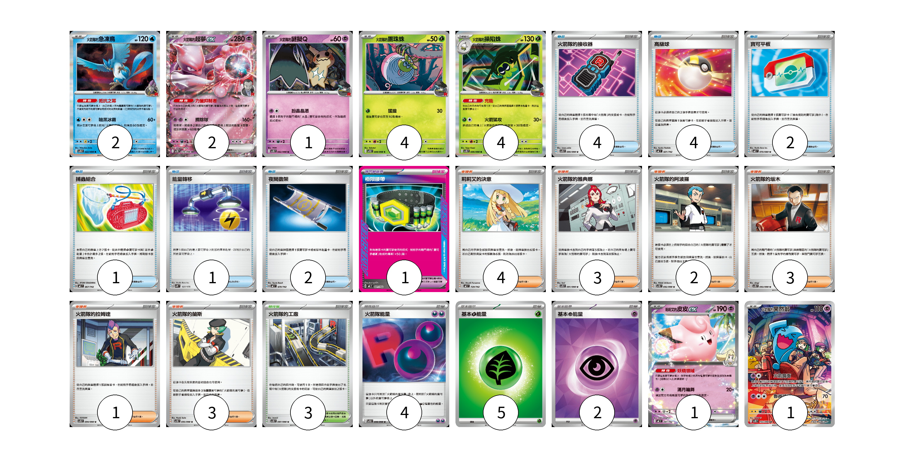 牌組構築方案 以此牌組為基礎新構築牌組 顯示卡面 顯示列表 寶可夢卡(15) 2 2 1 4 4 1 1 寶可夢道具(1) 1 物品卡(14) 4 4 2 1 1 2 支援者卡(16) 4 3 2 3 1 3 競技場卡(3) 3 能量卡(11) 4 5 2 寶可夢卡(15) 卡牌名稱 張數 卡牌名稱 張數 <火箭隊的>急凍鳥 SV10 022/098 02 <火箭隊的>超夢ex SV10 039/098 02 <火箭隊的>謎擬Q SV10 042/098 01 <火箭隊的>團珠蛛 SV10 008/098 04 <火箭隊的>操陷蛛 SV10 009/098 04 莉莉艾的皮皮ex MC 287/742 01 <火箭隊的>果然翁 SV10 103/098 01 寶可夢道具(1) 卡牌名稱 張數 卡牌名稱 張數 極限腰帶 MC 691/742 01 物品卡(14) 卡牌名稱 張數 卡牌名稱 張數 火箭隊的接收器 SV10 090/098 04 高級球 MC 651/742 04 寶可平板 M3 070/080 02 捕蟲組合 MC 667/742 01 能量轉移 SVM 127/175 01 夜間擔架 MC 670/742 02 支援者卡(16) 卡牌名稱 張數 卡牌名稱 張數 莉莉艾的決意 MC 729/742 04 火箭隊的雅典娜 SV10 091/098 03 火箭隊的阿波羅 SV10 092/098 02 火箭隊的坂木 SV10 093/098 03 火箭隊的拉姆達 SV10 094/098 01 火箭隊的蘭斯 SV10 095/098 03 競技場卡(3) 卡牌名稱 張數 卡牌名稱 張數 火箭隊的工廠 SV10 097/098 03 能量卡(11) 卡牌名稱 張數 卡牌名稱 張數 火箭隊能量 SV10 098/098 04 基本【草】能量 MJ GRA 05 基本【超】能量 SVOD PSY 02 以此牌組為基礎新構築牌組 牌組編碼 ZDkCjE-abrLSw-fvHVMl copy 列印牌組單 牌組編碼已複製 分享至SNS