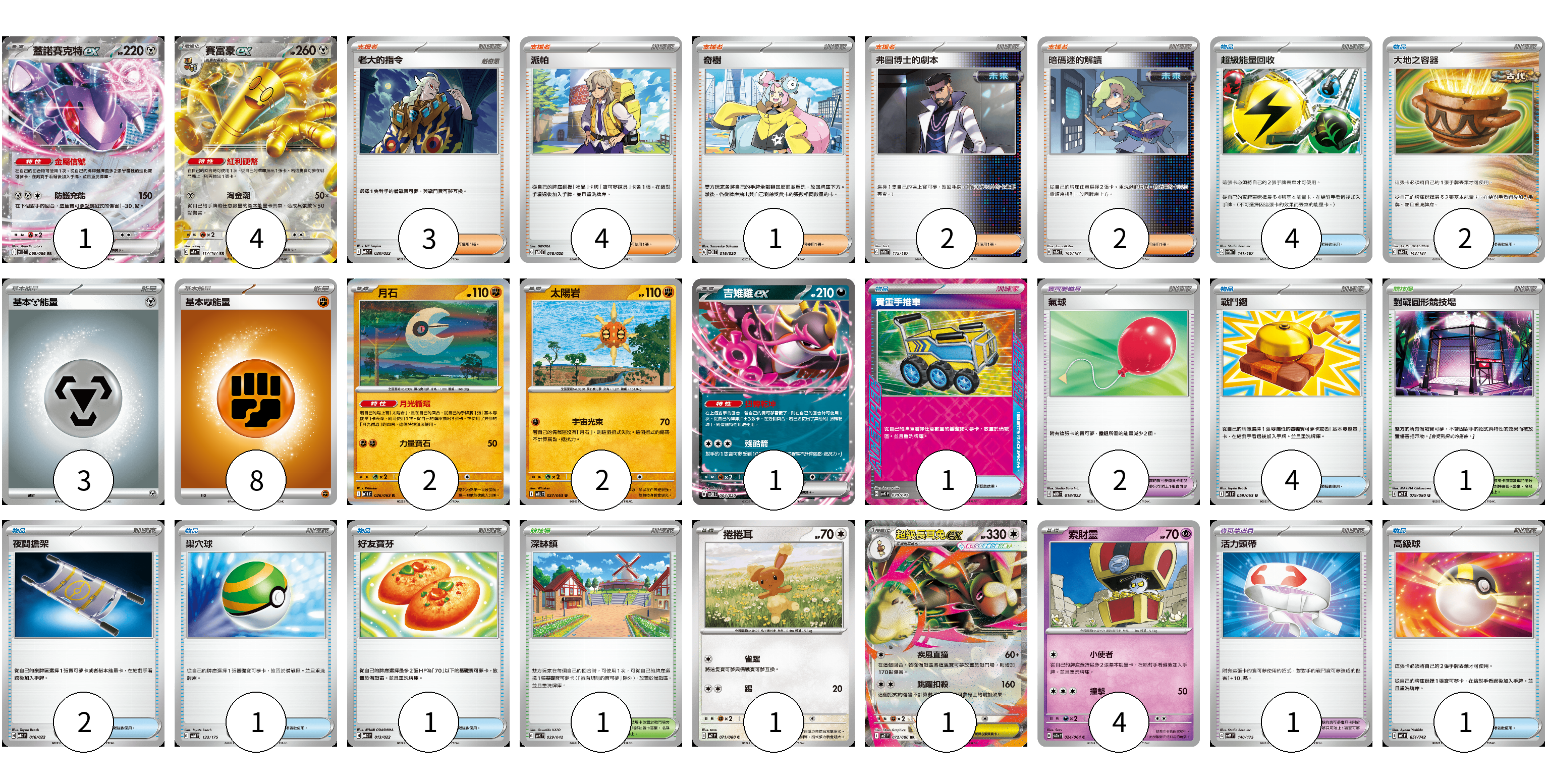 牌組構築方案 以此牌組為基礎新構築牌組 顯示卡面 顯示列表 寶可夢卡(16) 1 4 2 2 1 1 1 4 寶可夢道具(1) 1 物品卡(18) 4 2 1 2 4 2 1 1 1 支援者卡(12) 3 4 1 2 2 競技場卡(2) 1 1 能量卡(11) 3 8 寶可夢卡(16) 卡牌名稱 張數 卡牌名稱 張數 蓋諾賽克特ex SV11B 069/086 01 賽富豪ex SV8a 117/187 04 月石 M1L 026/063 02 太陽岩 M1L 027/063 02 吉雉雞ex SVOD 004/020 01 捲捲耳 M2 071/080 01 超級長耳兔ex M2 072/080 01 索財靈 SV7a 024/064 04 寶可夢道具(1) 卡牌名稱 張數 卡牌名稱 張數 活力頭帶 SVM 140/175 01 物品卡(18) 卡牌名稱 張數 卡牌名稱 張數 超級能量回收 SV8a 141/187 04 大地之容器 SV8a 143/187 02 貴重手推車 SVK 020/042 01 氣球 MBD 018/022 02 戰鬥鑼 M1L 059/063 04 夜間擔架 MBD 016/022 02 巢穴球 SVM 133/175 01 好友寶芬 MBD 013/022 01 高級球 MC 651/742 01 支援者卡(12) 卡牌名稱 張數 卡牌名稱 張數 老大的指令 MBD 020/022 03 派帕 SVOD 018/020 04 奇樹 SVOD 016/020 01 弗圖博士的劇本 SV8a 175/187 02 暗碼迷的解讀 SV8a 165/187 02 競技場卡(2) 卡牌名稱 張數 卡牌名稱 張數 對戰圓形競技場 M2 079/080 01 深缽鎮 SVK 039/042 01 能量卡(11) 卡牌名稱 張數 卡牌名稱 張數 基本【鋼】能量 M-P MET 03 基本【鬥】能量 M-P FIG 08 以此牌組為基礎新構築牌組 牌組編碼 ZDlsDB-GiahTA-ffTJdh copy 列印牌組單 牌組編碼已複製 分享至SNS