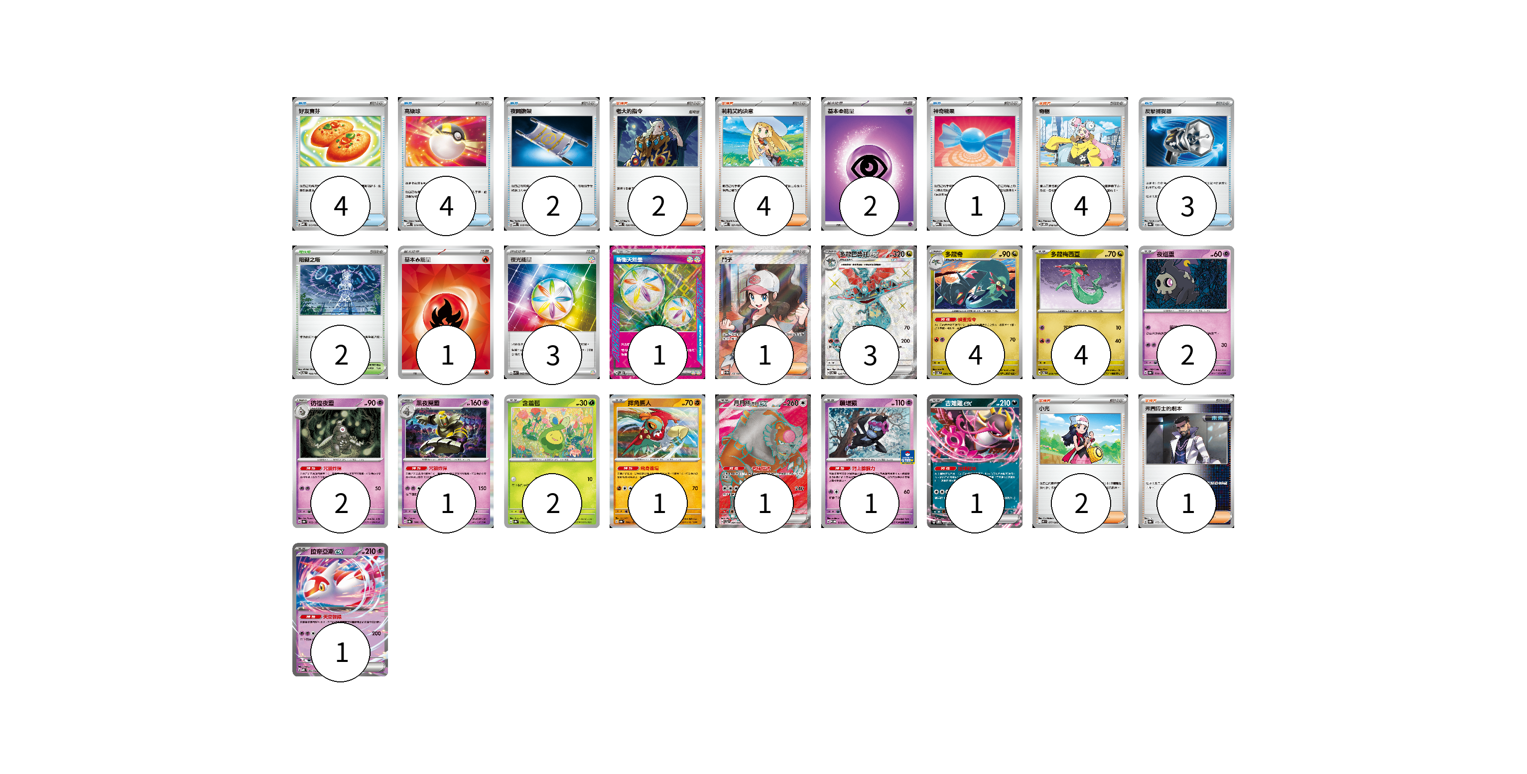 牌組構築方案 以此牌組為基礎新構築牌組 顯示卡面 顯示列表 寶可夢卡(23) 3 4 4 2 2 1 2 1 1 1 1 1 物品卡(14) 4 4 2 1 3 支援者卡(14) 2 4 4 1 2 1 競技場卡(2) 2 能量卡(7) 2 1 3 1 寶可夢卡(23) 卡牌名稱 張數 卡牌名稱 張數 多龍巴魯托ex SV6 120/101 03 多龍奇 SV6 080/101 04 多龍梅西亞 SV6 079/101 04 夜巡靈 SV8a 064/187 02 彷徨夜靈 SV8a 065/187 02 黑夜魔靈 SV8a 066/187 01 含羞苞 SV8a 001/187 02 摔角鷹人 SV8a 084/187 01 月月熊 赫月 ex SV5a 084/066 01 願增猿 M-P 014/M-P 01 吉雉雞ex SVOD 004/020 01 拉帝亞斯ex MBD 003/022 01 物品卡(14) 卡牌名稱 張數 卡牌名稱 張數 好友寶芬 MBD 013/022 04 高級球 MBD 014/022 04 夜間擔架 MBD 016/022 02 神奇糖果 MBG 013/022 01 反擊捕捉器 SV8a 139/187 03 支援者卡(14) 卡牌名稱 張數 卡牌名稱 張數 老大的指令 MBD 020/022 02 莉莉艾的決意 MBD 021/022 04 奇樹 SVOM 018/021 04 鬥子 SV11W 166/086 01 小光 M2 077/080 02 弗圖博士的劇本 SV8a 175/187 01 競技場卡(2) 卡牌名稱 張數 卡牌名稱 張數 阻礙之塔 SV6 100/101 02 能量卡(7) 卡牌名稱 張數 卡牌名稱 張數 基本【超】能量 MBD PSY 02 基本【火】能量 SVQL FIR 01 夜光能量 SVK 042/042 03 新衝天能量 SV5K 071/071 01 以此牌組為基礎新構築牌組 牌組編碼 ZEUjEi-yqhAhr-bZwKAm copy 列印牌組單 牌組編碼已複製 分享至SNS
