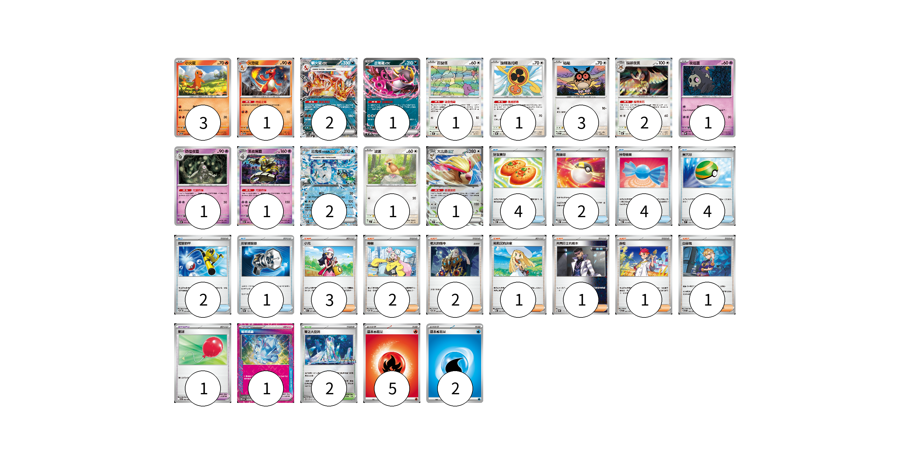 牌組構築方案 以此牌組為基礎新構築牌組 顯示卡面 顯示列表 寶可夢卡(21) 3 1 2 1 1 1 3 2 1 1 1 2 1 1 寶可夢道具(2) 1 1 物品卡(17) 4 2 4 4 2 1 支援者卡(11) 3 2 2 1 1 1 1 競技場卡(2) 2 能量卡(7) 5 2 寶可夢卡(21) 卡牌名稱 張數 卡牌名稱 張數 小火龍 SVTL 001/021 03 火恐龍 SVTL 002/021 01 噴火龍ex SVTL 006/021 02 吉雉雞ex SVOM 009/021 01 百變怪 SV4a 144/190 01 旋轉洛托姆 SV8a 131/187 01 咕咕 SV7 076/102 03 貓頭夜鷹 SV8a 128/187 02 夜巡靈 SV8a 064/187 01 彷徨夜靈 SV8a 065/187 01 黑夜魔靈 SV8a 066/187 01 厄鬼椪 水井面具ex SV8a 050/187 02 波波 SV3 087/108 01 大比鳥ex SVK 005/042 01 寶可夢道具(2) 卡牌名稱 張數 卡牌名稱 張數 氣球 SV11B 082/086 01 璀璨結晶 SV8a 152/187 01 物品卡(17) 卡牌名稱 張數 卡牌名稱 張數 好友寶芬 MBD 013/022 04 高級球 MBD 014/022 02 神奇糖果 MBG 013/022 04 巢穴球 SVM 133/175 04 厲害釣竿 SVOD 010/020 02 反擊捕捉器 SV8a 139/187 01 支援者卡(11) 卡牌名稱 張數 卡牌名稱 張數 小光 M2 077/080 03 奇樹 SVOD 016/020 02 老大的指令 SVOM 020/021 02 莉莉艾的決意 MBG 022/022 01 弗圖博士的劇本 SV8a 175/187 01 赤松 SV7 097/102 01 白蕾雅 SV7 100/102 01 競技場卡(2) 卡牌名稱 張數 卡牌名稱 張數 零之大空洞 SV-P 151/SV-P 02 能量卡(7) 卡牌名稱 張數 卡牌名稱 張數 基本【火】能量 M-P FIR 05 基本【水】能量 SVF WAT 02 以此牌組為基礎新構築牌組 牌組編碼 ZFOSub-DmJBRc-afiuLk copy 列印牌組單 牌組編碼已複製 分享至SNS
