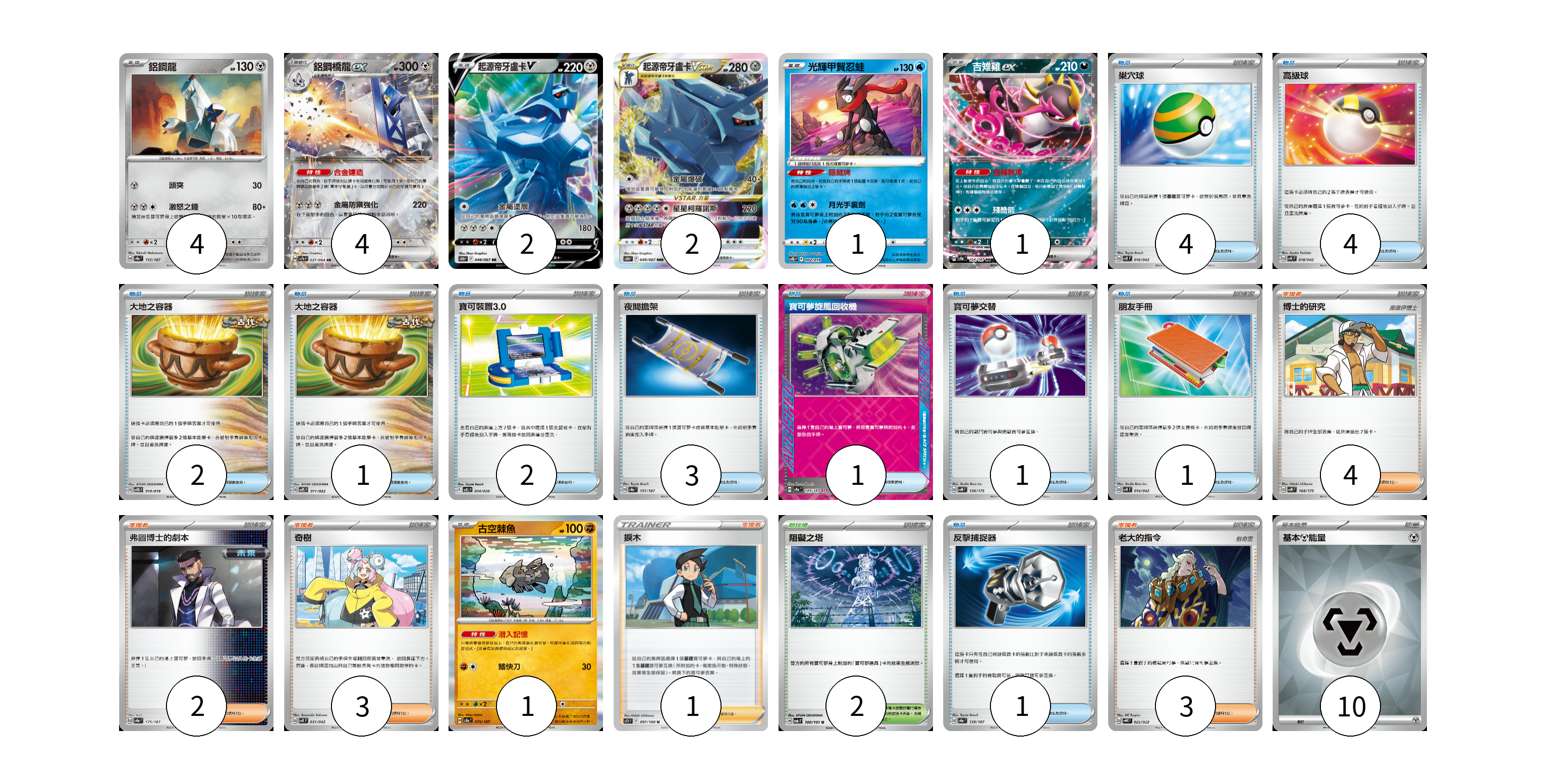 牌組構築方案 以此牌組為基礎新構築牌組 顯示卡面 顯示列表 寶可夢卡(15) 4 4 2 2 1 1 1 物品卡(20) 4 4 2 1 2 3 1 1 1 1 支援者卡(13) 4 2 3 1 3 競技場卡(2) 2 能量卡(10) 10 寶可夢卡(15) 卡牌名稱 張數 卡牌名稱 張數 鋁鋼龍 SV8a 112/187 04 鋁鋼橋龍ex SV7a 037/064 04 起源帝牙盧卡V S10D 048/067 02 起源帝牙盧卡VSTAR S10D 049/067 02 光輝甲賀忍蛙 SVTG 002/019 01 吉雉雞ex SV8a 104/187 01 古空棘魚 SV8a 079/187 01 物品卡(20) 卡牌名稱 張數 卡牌名稱 張數 巢穴球 SVK 016/042 04 高級球 SVK 018/042 04 大地之容器 SVTG 010/019 02 大地之容器 SVTS 011/022 01 寶可裝置3.0 SVEL 014/020 02 夜間擔架 SV8a 151/187 03 寶可夢旋風回收機 SV8a 149/187 01 寶可夢交替 SVM 136/175 01 朋友手冊 SVK 014/042 01 反擊捕捉器 SV8a 139/187 01 支援者卡(13) 卡牌名稱 張數 卡牌名稱 張數 博士的研究 SVM 168/175 04 弗圖博士的劇本 SV8a 175/187 02 奇樹 SVK 031/042 03 捩木 S11 097/100 01 老大的指令 SVHK 022/022 03 競技場卡(2) 卡牌名稱 張數 卡牌名稱 張數 阻礙之塔 SV6 100/101 02 能量卡(10) 卡牌名稱 張數 卡牌名稱 張數 基本【鋼】能量 SVK MET 10 以此牌組為基礎新構築牌組 牌組編碼 ZHYZXc-ARgunD-vmpOqZ copy 列印牌組單 牌組編碼已複製 分享至SNS
